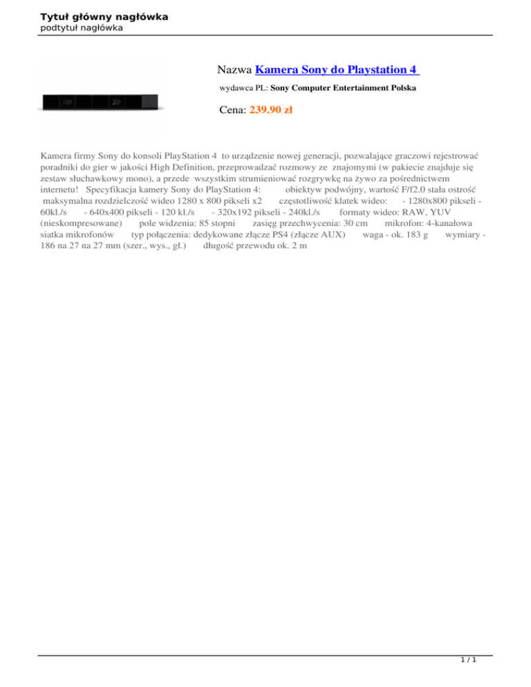 Tytuł główny nagłówka podtytuł nagłówka Nazwa Kamera Sony do Playstation 4 wydawca PL: Sony Computer Entertainment Polska Cena: 239.90 zł Kamera firmy Sony do konsoli PlayStation 4 to urządzenie nowej generacji, pozwalające graczowi rejestrować poradniki do gier w jakości High Definition, przeprowadzać rozmowy ze znajomymi (w pakiecie znajduje się zestaw słuchawkowy mono), a przede wszystkim strumieniować rozgrywkę na żywo za pośrednictwem internetu! Specyfikacja kamery Sony do PlayStation 4: obiektyw podwójny, wartość F/f2.0 stała ostrość maksymalna rozdzielczość wideo 1280 x 800 pikseli x2 częstotliwość klatek wideo: - 1280x800 pikseli 60kl./s - 640x400 pikseli - 120 kl./s - 320x192 pikseli - 240kl./s formaty wideo: RAW, YUV (nieskompresowane) pole widzenia: 85 stopni zasięg przechwycenia: 30 cm mikrofon: 4-kanałowa siatka mikrofonów typ połączenia: dedykowane złącze PS4 (złącze AUX) waga - ok. 183 g wymiary 186 na 27 na 27 mm (szer., wys., gł.) długość przewodu ok. 2 m 1/1