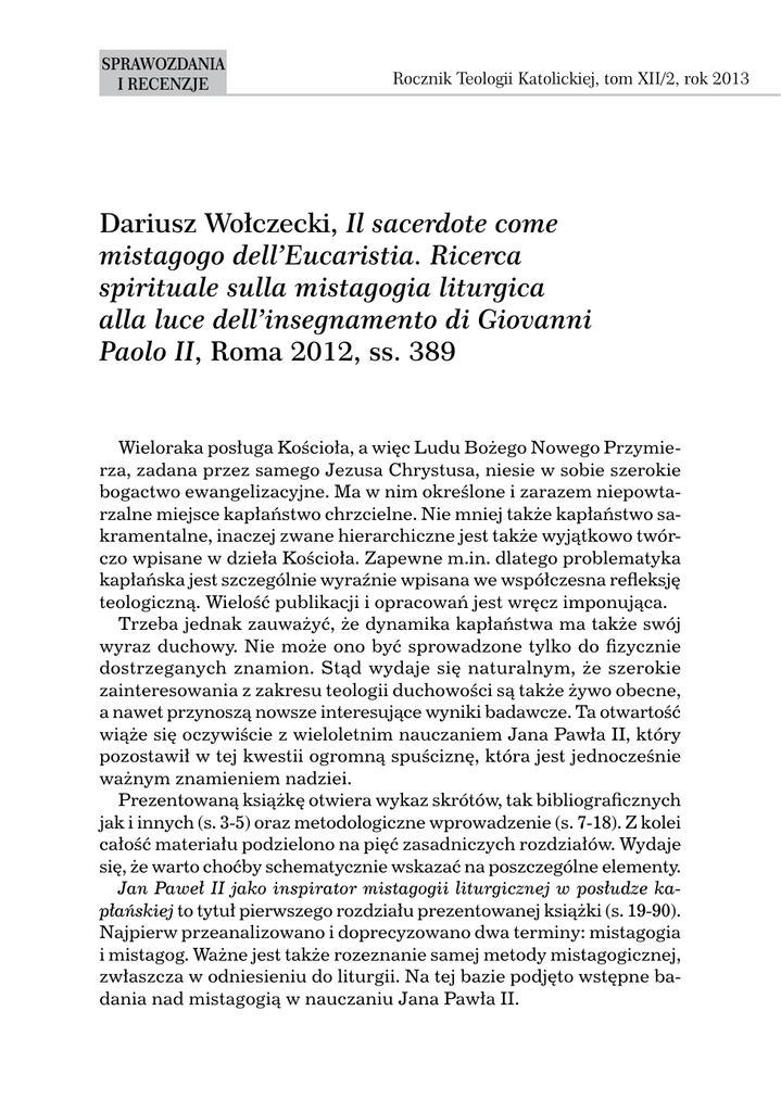 SPRAWOZDANIA I RECENZJE Rocznik Teologii Katolickiej, tom XII/2, rok 2013 Dariusz Wołczecki, Il sacerdote come mistagogo dell’Eucaristia. Ricerca spirituale sulla mistagogia liturgica alla luce dell’insegnamento di Giovanni Paolo II, Roma 2012, ss. 389 Wieloraka posługa Kościoła, a więc Ludu Bożego Nowego Przymierza, zadana przez samego Jezusa Chrystusa, niesie w sobie szerokie bogactwo ewangelizacyjne. Ma w nim określone i zarazem niepowtarzalne miejsce kapłaństwo chrzcielne. Nie mniej także kapłaństwo sakramentalne, inaczej zwane hierarchiczne jest także wyjątkowo twórczo wpisane w dzieła Kościoła. Zapewne m.in. dlatego problematyka kapłańska jest szczególnie wyraźnie wpisana we współczesna refleksję teologiczną. Wielość publikacji i opracowań jest wręcz imponująca. Trzeba jednak zauważyć, że dynamika kapłaństwa ma także swój wyraz duchowy. Nie może ono być sprowadzone tylko do fizycznie dostrzeganych znamion. Stąd wydaje się naturalnym, że szerokie zainteresowania z zakresu teologii duchowości są także żywo obecne, a nawet przynoszą nowsze interesujące wyniki badawcze. Ta otwartość wiąże się oczywiście z wieloletnim nauczaniem Jana Pawła II, który pozostawił w tej kwestii ogromną spuściznę, która jest jednocześnie ważnym znamieniem nadziei. Prezentowaną książkę otwiera wykaz skrótów, tak bibliograficznych jak i innych (s. 3-5) oraz metodologiczne wprowadzenie (s. 7-18). Z kolei całość materiału podzielono na pięć zasadniczych rozdziałów. Wydaje się, że warto choćby schematycznie wskazać na poszczególne elementy. Jan Paweł II jako inspirator mistagogii liturgicznej w posłudze kapłańskiej to tytuł pierwszego rozdziału prezentowanej książki (s. 19-90). Najpierw przeanalizowano i doprecyzowano dwa terminy: mistagogia i mistagog. Ważne jest także rozeznanie samej metody mistagogicznej, zwłaszcza w odniesieniu do liturgii. Na tej bazie podjęto wstępne badania nad mistagogią w nauczaniu Jana Pawła II. 246 Bp Andrzej F. Dziuba Kolejny rozdział opatrzony został tytułem Korzenie mistagogii u Jana Pawła II (s. 91-149). Na czoło wybijają się motywacje teologiczne i pastoralne. Przeanalizowano znaczenie mistagogii i jej powiązania z Kościołem pierwotnym. Wskazano na swoiste figury mistagogów takich jak: św. Ambroży, św. Cyryl Jerozolimski, św. Jan Chryzostom, św. Teodor z Mopsuestii oraz św. Maksym Wyznawca. To podprowadza do wskazania na aktualność mistagogii liturgicznej w Kościele współczesnym. Autor zaprezentował następnie Źródła mistagogii liturgicznej Jana Pawła II (s. 151-224). Mistagogia jawi się jako wprowadzenie w misterium Chrystusa poprzez Eucharystię. Stąd sprawujący Eucharystię ukazany został jako mistagog. Kończąc rozdział autor, wskazał na Sprawozdania warunki autentycznej mistagogii liturgicznej. i recenzje Czwarty rozdział studium Dariusza Wołczeckiego ukazuje Wkład formacyjny Jana Pawła II jako mistagoga celebracji Eucharystii (s. 225285). Cała formacja kapłańska winna mieć charakter mistagogiczny: powinna dotyczyć edukacji liturgicznej oraz formacji ludzkiej, duchowej, intelektualnej i permanentnej. Także życie kapłańskie powinno być swoistą „formą eucharystyczną”. W tym wszystkim wybrzmiewa wymiar praktyczny życia duchowego kapłana – mistagoga. W tym kontekście Maryja staje się niejako „Kobietą eucharystyczną”. Aplikacje duszpasterskie mistagogii eucharystycznej Jana Pawła II to tytuł ostatniego rozdziału (s. 287-345). Kapłan – mistagog jest oddany posłudze prowadzącej do przeżywania doświadczenia misterium Chrystusa. Autor podkreśla, jak ważnym jest stosowanie mistagogii eucharystycznej w ciągu całego roku liturgicznego. Całość treściową omawianej książki zamyka interesujące podsumowanie (s. 347-354). Następnie dodano jeszcze stosunkowo obszerną bibliografię (s. 355-383) oraz dość interesujący spis treści (s. 385-389). W książce twórczo wybrzmiewa współczesny obraz kapłaństwa hierarchicznego, nakreślony bardzo szeroko zwłaszcza poprzez analizę bogatego piśmiennictwa Jana Pawła II. To nauczanie jest niezwykle twórczym z zarazem inspirującym źródłem dla dalszych badań naukowych. Papieskie przesłanie tchnie wielkim zaufaniem oraz nadziejami. Nie dziwi zatem, że autor podjął się analizy tej problematyki i umiejętnie sięga do tego nauczania w toku prowadzonych badań naukowych. Nadanie proponowanym badaniom charakteru teologii duchowości, czyni omawianą wrażliwość kapłańską jeszcze bardziej dynamiczną i zarazem autentyczną, co zresztą jest szczególnym oczekiwaniem współczesności. Wnikanie w tę sferę musi, wręcz ze swej natury, czynić z niej realizm życia i apostolskiego zaangażowania w nową Dariusz Wołczecki, Il sacerdote come mistagogo dell’Eucaristia... 247 ewangelizację. Ona zaś jest szerokim doświadczeniem zobowiązań ewangelicznych. Odnosi się to szczególnie do posługujących w Kościele, a więc prezbiterów. Przejście do sfery mistagogii liturgicznej nadaje całej duchowości interesującą optykę. Liturgia pozostaje bowiem szczególnym wyrazem podstawowych znamion Kościoła, oczywiście obok przepowiadania i świadectwa miłości caritas. Analiza problematyki mistagogii, tak w wymiarze teologicznym jak i duszpasterskim, prezentowania w studium Wołczeckiego, jest interesującą propozycją, choć wymaga jeszcze dalszych, bardziej szczegółowych analiz badawczych. Tym bardziej, że te dwa faktory jakby spotykają się praktycznie i życiowo właśnie w liturgii. Dobrze, że w prezentowanej książce kapłaństwo wybrzmiewa Sprawozdania w nachyleniu mistagogicznym, zwłaszcza ku Eucharystii. Przecież i recenzje mistagogia sakramentalna jest ważnym narzędziem przepowiadania misteriów Chrystusa, a jeszcze szerzej – wielorakim bogactwem wiary, także charyzmatycznym. Co więcej, wybrzmiewa tutaj także wyraźniej 