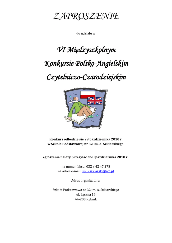 ZAPROSZENIE do udziału w VI Międzyszkolnym Konkursie Polsko-Angielskim Czytelniczo-Czarodziejskim Konkurs odbędzie się 29 października 2010 r. w Szkole Podstawowej nr 32 im. A. Szklarskiego. Zgłoszenia należy przesyłać do 8 października 2010 r.: na numer faksu: 032 / 42 47 278 na adres e-mail: [email protected] Adres organizatora: Szkoła Podstawowa nr 32 im. A. Szklarskiego ul. Łączna 14 44-200 Rybnik ZAŁOŻENIA REGULAMINOWE VI Międzyszkolnego Konkursu Polsko-Angielskiego Czytelniczo-Czarodziejskiego 1. Celem konkursu jest: a) motywowanie uczniów do nauki języka angielskiego, b) doskonalenie umiejętności wyszukiwania informacji oraz popularyzacja czytelnictwa w powiązaniu z obchodami Międzynarodowego Miesiąca Bibliotek Szkolnych, c) promowanie dzieci wybitnie uzdolnionych, d) edukacja kulturalna i europejska, e) wpajanie zasad współdziałania w grupie, kształcenie postaw pożądanych społecznie. 2. W konkursie mogą wziąć udział uczniowie klas 4, 5 i 6 szkół podstawowych z Rybnika i powiatu rybnickiego. W zmaganiach biorą udział 3-osobowe drużyny, po jednej z każdej zgłoszonej szkoły. 3. Warunki uczestnictwa w konkursie: a. znajomość życiorysów pisarzy: Clive’a Staplesa Lewisa, Joanne K. Rowling, Pameli L. Travers; b. znajomość języka angielskiego na poziomie szkoły podstawowej oraz słownictwa dotyczącego podanej literatury; c. ocenie podlegają stroje drużyn (związane z treścią podanych książek), d. znajomość treści książek: „Harry Potter i więzień Azkabanu” J.K. Rowling „Harry Potter i kamień filozoficzny” J.K. Rowling „Mary Poppins” P.L. Travers (tłum. Irena Tuwim) „Książę Kaspian” C.S. Lewisa 4. Zgłoszenia (karty zgłoszenia – załącznik 1 do regulaminu) należy nadsyłać do 8 października 2010 r. Można to uczynić w następujący sposób: a) osobiście lub drogą listowną (decyduje data stempla) na adres: Szkoła Podstawowa nr 32 im. A. Szklarskiego ul. Łączna 14 44-200 Rybnik b) faksem na numer: 0 32 / 42 47 278 c) na adres e-mail: [email protected] 5. Na laureatów konkursu czekają atrakcyjne nagrody. 6. Wszystkie aktualne informacje, a w przyszłości także zdjęcia uczestników i podziękowania wszystkim, którzy wesprą naszą inicjatywę, zostaną zamieszczone na stronie: sp32.rybnik.pl oraz biblioteka.sp32.rybnik.pl. 7. Udział w konkursie jest równoznaczny ze zgodą na bezpłatną publikację na stronie internetowej organizatora oraz w prasie wizerunków uczestników oraz nazwisk zwycięzców. Załącznik nr 1 do regulaminu VI Międzyszkolnego Konkursu Polsko-Angielskiego Czytelniczo-Czarodziejskiego KARTA ZGŁOSZENIA DO UDZIAŁU W KONKURSIE Nazwa szkoły: …………………………………………………………………………………………………………………………………. Adres szkoły: …………………………………………………………………………………………………………………………………… Opiekun: …………………………………………………………………………………………………………………………………………. Kontakt do opiekuna: telefon: …………………………………………………………………….. adres e-mail: …………………………………………………………….. L.p. 1 2 3 Imię i nazwisko ucznia Klasa