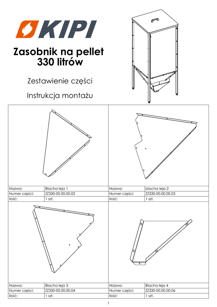 Zasobnik na pellet 330 litrów Zestawienie części Instrukcja montażu Nazwa: Numer części: Ilość: Blacha leja 1 ZZ330-00.00.00.02 1 szt. Nazwa: Numer części: Ilość: blacha leja 2 ZZ330-00.00.00.03 1 szt. Nazwa: Numer części: Ilość: Blacha leja 3 ZZ330-00.00.00.04 1 szt. Nazwa: Numer części: Ilość: Blacha leja 4 ZZ330-00.00.00.06 1 szt. 1 Nazwa: Numer części: Ilość: Blacha leja 5 ZZ330-00.00.00.05 1 szt. Nazwa: Numer części: Ilość: Pokrywa górna ZZ330-00.01.00.01 1 szt. Nazwa: Numer części: Ilość: Blacha górna ZZ330-00.00.00.01 4 szt. Nazwa: Numer części: Ilość: Noga zasobnika ZZ330-00.00.00.09 4 szt. Nazwa: Numer części: Ilość: Zaczep łańcucha ZZ330-00.00.00.07 1 szt. Nazwa: Numer części: Ilość: Zaczep łańcucha-lewy ZZ330-00.00.00.08 1 szt. Nazwa: Numer części: Ilość: Rączka ZZ330-00.00.00.10 1 szt. Nazwa: Numer części: Ilość: Zaślepka górna ZZ330-00.00.00.11 4 szt. 2 Nazwa: Numer części: Ilość: Nóżka ZZ330-00.00.00.12 4 szt. Nazwa: Numer części: Ilość: Śruba M6x40 ZZ330-00.00.00.13 16 szt. Nazwa: Numer części: Ilość: Śruba M6x12 ZZ330-00.00.00.14 29 szt. Nazwa: Numer części: Ilość: Śruba imbusowa M8x16 ZZ330-00.00.00.15 2 szt. Nazwa: Numer części: Ilość: Podkładka M8 ZZ330-00.00.00.16 2 szt. Nazwa: Numer części: Ilość: Podkładka M6 ZZ330-00.00.00.17 88 szt. Nazwa: Numer części: Ilość: Nakrętka M8 ZZ330-00.00.00.18 2 szt. Nazwa: Numer części: Ilość: Nakrętka M6 ZZ330-00.00.00.19 45 szt. Montaż zasobnika powinien odbyć się w krokach przedstawionych na poniższych schematach. Dokonać go należy na podłożu płaskim, które nie spowoduje zarysowań poszczególnych elementów (np. na kartonie). Podczas skręcania samego zasobnika nie należy dokręcać śrub do końca. Dopiero po złożeniu wszystkich blach śruby dokręcić. Montaż zaślepki i nóżki można wykonać za pomocą gumowego młotka lub młotka zwykłego wbijając wymienione elementy przez element pośredni (np. drewno). Nóżkę należy wbijać bez elementu wkręconego w nią. Po zmontowaniu zasobnika i ustawieniu go w docelowym miejscu należy go wypoziomować poprzez pokręcanie regulowanych nóżek. Do montażu zasobnika potrzebne są: - klucz płaski lub oczkowy rozmiar 10 - 2 szt. - klucz płaski lub oczkowy rozmiar 13 - 1 szt. - klucz imbusowy rozmiar 6 - 1 szt. - młotek gumowy lub zwykły - 1 szt. 3 Zaślepka górna Noga zasobnika Nóżka Śruba imbusowa M8x16 Rączka Pokrywa górna Podkładka M6 Nakrętka M6 4 Blacha górna Zaczep łańcucha Nakrętka M6 Podkładka M6 Podkładka M6 Śruba M6x40 Zaczep łańcucha-lewy 5 Blacha leja 1 Blacha leja 3 Blacha leja 2 Nakrętka M6 Podkładka M6 Blacha leja 5 Podkładka M6 Śruba M6x12 6 Śruba M6x12 Podkładka M6 Podkładka M6 Nakrętka M6 7 Blacha leja 4 Śruba M6x12 Podkładka M6 Nakrętka M6 Podkładka M6 8