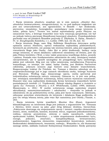o. prof. Dr hab. Piotr Liszka CMF o. prof. Dr hab. Piotr Liszka CMF 51-611 Wrocław, ul. Wieniawskiego 38 www.piotr-liszka.strefa.pl + Racja istnienia absolutu znajduje się w nim samym „Absolut (łac. absolutus bezwarunkowy, nieograniczony), to, co pod żadnym względem nie jest ani uwarunkowane, ani ograniczone; w filozofii – byt doskonały, pierwotny, niezależny, bezwzględny, posiadający rację swego istnienia w sobie, pełnia bytu.” Termin ten został wprowadzony przez Plotyna na oznaczenie bytu, z którego wszystkie inne byty emanują (prajednia); nie był on jednak twórcą pierwszej filozoficznej koncepcji absolutu. Prawdopodobnie pochodzi ona od jońskich filozofów przyrody Z. Zdybicka, S. Zięba, Absolut IIV, w: Encyklopedia Katolicka, t.1, Lublin 1989, kol. 32-36, kol. 32. + Racja istnienia Boga, sam Bóg. Refleksja filozoficzna dotycząca próby opisania natury Absolutu, oprócz wskazania najbardziej podstawowych, bytowych jej atrybutów, nie pomija tak istotnej kwestii, jaką jest zagadnienie rozumienia Boga jako Osoby. Jako Byt w pełni doskonały, będący racją swego istnienia, w swym działaniu całkowicie niezależny od świata, jawi się jako Pełnia Intelektu i Woli, a więc także przyczyna wszelkiego dobra, prawdy i piękna. Posiada więc fundamentalne odniesienie do całej, istniejącej realnie rzeczywistości, ale w sposób szczególny do przygodnego bytu osobowego, jakim jest człowiek. Bóg jest nie tylko ostateczną, metafizyczną Przyczyną wszystkiego, co istnieje, ale także, będąc Osobą, jest Boskim Partnerem człowieka, jedynym sensem jego historii oraz dziejów wszechświata. Rozpoczynając traktat De Trinitate, św. Tomasz z Akwinu odwołuje się do rozpowszechnionego już w jego czasach określenia osoby, którego Autorem jest Boecjusz. Według tego, klasycznego ujęcia, osoba (persona) jest indywidualną substancją natury rozumnej. Oznacza to, iż jest ona pełną, tzn. istniejącą samodzielnie substancją, której naturę wyznacza rozumność. Stanowi więc ona najbardziej doskonałą formę bytowania wszystkich bytów posiadających intelekt /J. Tupikowski, Relacje między Bogiem a światem w ujęciu św. Tomasza z Akwinu u A.N. Whiteheada, Lublin 1999, doktorat. Maszynopis, s. 202/. W osobie substancja osiąga najwyższy stopień aktualizacji, samowystarczalności i odrębności – wszystko to jednak w odniesieniu do jej podstawowej cechy, jaką jest bycie rozumnym. Akwinata, odnosząc powyższe stwierdzenia do istnienia i działania Boga podkreśla, iż jest On swoją własną istotą; jako więc Byt samoistny jest Osobą /Tamże, s. 203. + Racja istnienia bytów wszelkich Maxime Ens (Esse). Argument klimakologiczny za istnieniem Boga jest jednym z argumentów św. Tomasza z Akwinu, które znane są jako „pięć dróg [klimax: drabina, hierarchia]. „Faktycznie dostrzega się stopniowanie rzeczy i istnień: cząstka elementarna atomu, atom, molekuła, kamień, kryształ, wirus, organizm jednokomórkowy, roślina, zwierzę prymitywne, zwierzę z rzędu naczelnych, człowiek, społeczność ludzka, Wszechbyt…, a także stopniowanie doskonałości bytu, energii, jedności, zwartości, kompleksyfikacji, wewnętrzności, podmiotowości, bogactwa elementów, wspaniałości konstrukcji, wolności, doskonałości działaniowych, tworzenia, rozwoju…Wszystko to, nie tłumacząc samego siebie, zakłada realność Subsystencji Doskonałości. Kiedy patrzymy 1 o. prof. Dr hab. Piotr Liszka CMF na byty „w dół” według ich doskonałości, to widzimy, że stopnie niższe zmierzają jakby w kierunku „niebytu”, natomiast kiedy patrzymy „w górę”, to stopnie wyższe zmierzają ku Subsystencji. Najlepiej widać to na istnieniu. „Mały” stopień istnienia (bytu) jest na granicy nicości, „wyższy” stopień istnienia zmierza ku Istnieniu samoistnemu (ad Maxime Ens). Oczywiście, Byt Najdoskonalszy nie leży na prostym „przedłużeniu” tej drabiny stopni. „Więcej” przechodzi w Maxime Ens na mocy konstytutywnego procesu tego, co bytuje. I Maxime Ens (Esse) określa i tłumaczy wszystkie niższe stopnie w zakresie ich bytowości. Maxime Ens nazywamy Bogiem (G. Siewerth, Cz. Szczęsny)” /Cz. S. Bartnik, Dogmatyka katolicka, t. 1. Lublin 1999, s. 107. + Racja istnienia bytów wszelkich Maxime Ens (Esse). Argument klimakologiczny za istnieniem Boga jest jednym z argumentów św. Tomasza z Akwinu, które znane są jako „pięć dróg [klimax: drabina, hierarchia]. „Faktycznie dostrzega się stopniowanie rzeczy i istnień: cząstka elementarna atomu, atom, molekuła, kamień, kryształ, wirus, organizm jednokomórkowy, roślina, zwierzę prymitywne, zwierzę z rzędu naczelnych, człowiek, społeczność ludzka, Wszechbyt…, a także stopniowanie doskonałości bytu, energii, jedności, zwartości, kompleksyfikacji, wewnętrzności, podmiotowości, bogactwa elementów, wspaniałości konstrukcji, wolności, doskonałości działaniowych, tworzenia, rozwoju…Wszystko to, nie tłumacząc samego siebie, zakłada realność Subsystencji Doskonałości. Kiedy patrzymy na byty „w dół” według ich doskonałości, to widzimy, że stopnie niższe zmierzają jakby w kierunku „niebytu”, natomiast kiedy patrzymy „w górę”, to stopnie wyższe zmierzają ku Subsystencji. Najlepiej widać to na istnieniu. „Mały” stopień istnienia (bytu) jest na granicy nicości, „wyższy” stopień istnienia zmierza ku Istnieniu samoistnemu (ad Maxime Ens). Oczywiście, Byt Najdoskonalszy nie leży na prostym „przedłużeniu” tej drabiny stopni. „Więcej” przechodzi w Maxime Ens na mocy konstytutywnego procesu tego, co bytuje. I Maxime Ens (Esse) określa i tłumaczy wszystkie niższe stopnie w zakresie ich bytowości. Maxime Ens nazywamy Bogiem (G. Siewerth, Cz. Szczęsny)” /Cz. S. Bartnik, Dogmatyka katolicka, t. 1. Lublin 1999, s. 107. + Racja istnienia człowieka według paradygmatu hebrajskiego. Paradygmat hel