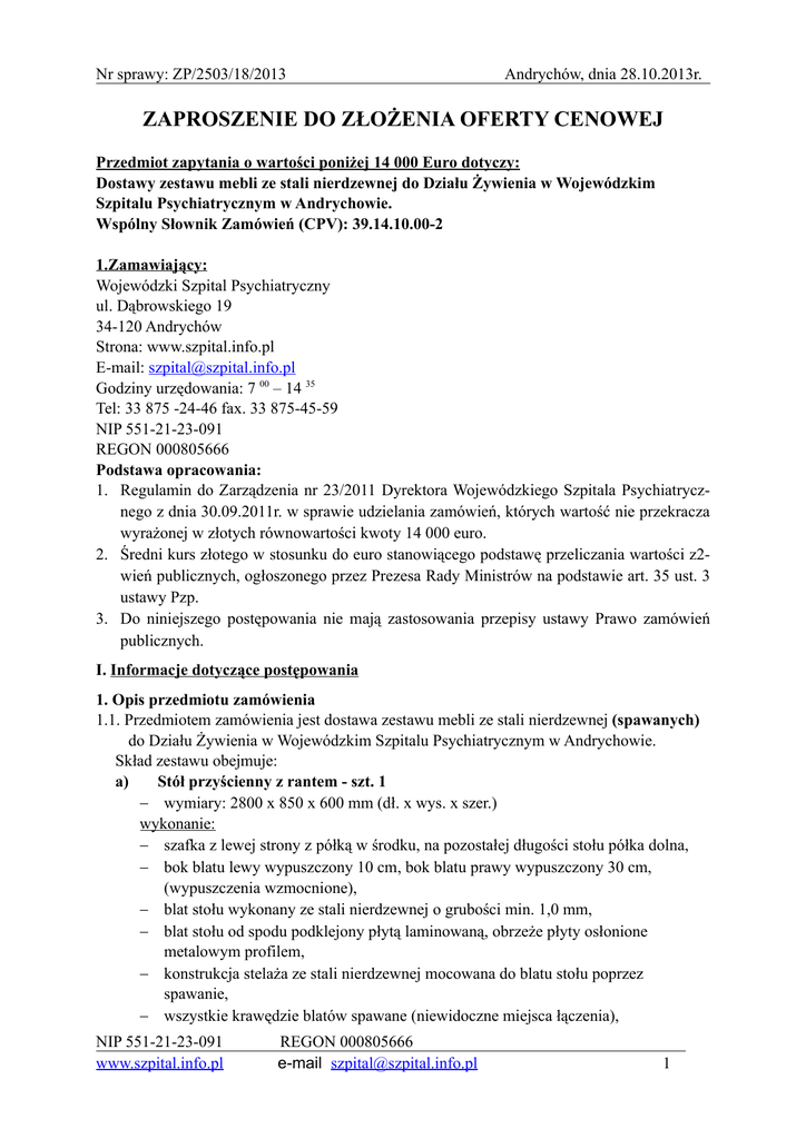 Nr sprawy: ZP/2503/18/2013 Andrychów, dnia 28.10.2013r. ZAPROSZENIE DO ZŁOŻENIA OFERTY CENOWEJ Przedmiot zapytania o wartości poniżej 14 000 Euro dotyczy: Dostawy zestawu mebli ze stali nierdzewnej do Działu Żywienia w Wojewódzkim Szpitalu Psychiatrycznym w Andrychowie. Wspólny Słownik Zamówień (CPV): 39.14.10.00-2 1.Zamawiający: Wojewódzki Szpital Psychiatryczny ul. Dąbrowskiego 19 34-120 Andrychów Strona: www.szpital.info.pl E-mail: [email protected] Godziny urzędowania: 7 00 – 14 35 Tel: 33 875 -24-46 fax. 33 875-45-59 NIP 551-21-23-091 REGON 000805666 Podstawa opracowania: 1. Regulamin do Zarządzenia nr 23/2011 Dyrektora Wojewódzkiego Szpitala Psychiatrycznego z dnia 30.09.2011r. w sprawie udzielania zamówień, których wartość nie przekracza wyrażonej w złotych równowartości kwoty 14 000 euro. 2. Średni kurs złotego w stosunku do euro stanowiącego podstawę przeliczania wartości z2wień publicznych, ogłoszonego przez Prezesa Rady Ministrów na podstawie art. 35 ust. 3 ustawy Pzp. 3. Do niniejszego postępowania nie mają zastosowania przepisy ustawy Prawo zamówień publicznych. I. Informacje dotyczące postępowania 1. Opis przedmiotu zamówienia 1.1. Przedmiotem zamówienia jest dostawa zestawu mebli ze stali nierdzewnej (spawanych) do Działu Żywienia w Wojewódzkim Szpitalu Psychiatrycznym w Andrychowie. Skład zestawu obejmuje: a) Stół przyścienny z rantem - szt. 1 − wymiary: 2800 x 850 x 600 mm (dł. x wys. x szer.) wykonanie: − szafka z lewej strony z półką w środku, na pozostałej długości stołu półka dolna, − bok blatu lewy wypuszczony 10 cm, bok blatu prawy wypuszczony 30 cm, (wypuszczenia wzmocnione), − blat stołu wykonany ze stali nierdzewnej o grubości min. 1,0 mm, − blat stołu od spodu podklejony płytą laminowaną, obrzeże płyty osłonione metalowym profilem, − konstrukcja stelaża ze stali nierdzewnej mocowana do blatu stołu poprzez spawanie, − wszystkie krawędzie blatów spawane (niewidoczne miejsca łączenia), NIP 551-21-23-091 www.szpital.info.pl REGON 000805666 e-mail [email protected] 1 Nr sprawy: ZP/2503/18/2013 Andrychów, dnia 28.10.2013r. − półka „wcinana” w szkielet konstrukcji, − w nodze ochronny kołek uziemiający, − nogi mebli zakończone stopkami z regulacją wysokości. b) Stół przyścienny z rantem z dolną półką – szt. 1 − wymiary: 2000 x 850 x 600 mm (dł. x wys. x szer.) wykonanie: − blat stołu wykonany ze stali nierdzewnej o grubości min. 1,0 mm, − blat stołu od spodu podklejony płytą laminowaną, obrzeże płyty osłonione metalowym profilem, − konstrukcja stelaża ze stali nierdzewnej mocowana do blatu stołu poprzez spawanie, − wszystkie krawędzie blatów spawane (niewidoczne miejsca łączenia), − półka „wcinana” w szkielet konstrukcji, − w nodze ochronny kołek uziemiający, − nogi mebli zakończone stopkami z regulacją wysokości. c) Szafa na pieczywo z drzwiami dwuskrzydłowymi uchylnymi, otworami wentylacyjnymi w górnej części drzwi – szt. 1 − wymiary: 1200x2000x600 mm (dł. x wys. x gł.) wykonanie: − trzy półki, obciążenie na półkę min. 70kg/m2, − wykonana ze stali nierdzewnej o grubości min. 1,0 mm, − konstrukcja ze stali nierdzewnej scalona przez spawanie (niewidoczne miejsca) łączenia, − półki „wcinane” w szkielet konstrukcji, − nogi mebli zakończone stopkami z regulacją wysokości, − zawiasy – spawane tłoczone w formie klocka pozwalające na łatwy demontaż drzwi. d) Szafa na artykuły spożywcze z drzwiami dwuskrzydłowymi uchylnymi z przegrodą w środku – szt. 1 − wymiary: 1200x2000x600 mm dł. x wys. x gł.) wykonanie: − trzy półki, obciążenie na półkę min. 70kg/m2, − wykonana ze stali nierdzewnej o grubości min. 1,0 mm, − konstrukcja ze stali nierdzewnej scalona przez spawanie (niewidoczne miejsca) łączenia, − półki „wcinane” w szkielet konstrukcji, − nogi mebli zakończone stopkami z regulacją wysokości, − zawiasy – spawane tłoczone w formie klocka pozwalające na łatwy demontaż drzwi. e) Szafka z rantem, drzwiami dwuskrzydłowymi uchylnymi z półką w środku – szt. 1 − wymiary: 900 x 850 x 600 mm (dł. x wys. x gł.) wykonanie: NIP 551-21-23-091 www.szpital.info.pl REGON 000805666 e-mail [email protected] 2 Nr sprawy: ZP/2503/18/2013 Andrychów, dnia 28.10.2013r. − wykonana ze stali nierdzewnej o grubości min. 1,0 mm, − konstrukcja ze stali nierdzewnej scalona przez spawanie (niewidoczne miejsca) łączenia, − półka w środku „wcinana” w szkielet konstrukcji, − nogi mebli zakończone stopkami z regulacją wysokości, − zawiasy – spawane tłoczone w formie klocka pozwalające na łatwy demontaż drzwi. 2. Warunki dostawy 2.1 Wykonawca zobowiązany jest dostarczyć przedmiot zamówienia na swój koszt do siedziby Zamawiającego – loco magazyn. 3. Cena oferty. 3.1 Cena oferty ma zawierać koszt: dostawy przedmiotu zamówienia do siedziby Zamawiającego, pozostałe koszty związane z realizacją zamówienia. 4. Oferty częściowe. 4.1 Zamawiający nie dopuszcza składania oferty częściowej. 5. Termin wykonania zamówienia. 5.1 Wymagany termin realizacji zamówienia – do 3 tygodni od dnia podpisania umowy. 5.2 Miejsce realizacji zamówienia: Wojewódzki Szpital Psychiatryczny w Andrychowie ul. Dąbrowskiego 19. II. Informacje o oświadczeniach i dokumentach, jakie mają dostarczyć wykonawcy − Prawidłowo wypełniony i podpisany Formularz oferty – stanowiący załącznik nr 1. − Prawidłowo wypełniony i podpisany Formularz cenowy – stanowiący załącznik nr 1a. − Zaakceptowany projekt umowy - stanowiący załącznik nr 2. III. Pracownicy Zamawiającego uprawnieni do bezpośredniego kontaktowania się z wykonawcami − w sprawach przedmiotu zamówienia: Bazydło Beata tel. 33/875-24-46 wew. 218 − w sprawach postępowania: Bury Marzena, Mamica Zbigniew tel. 33/875-75-42 IV. Sposób przygotowania