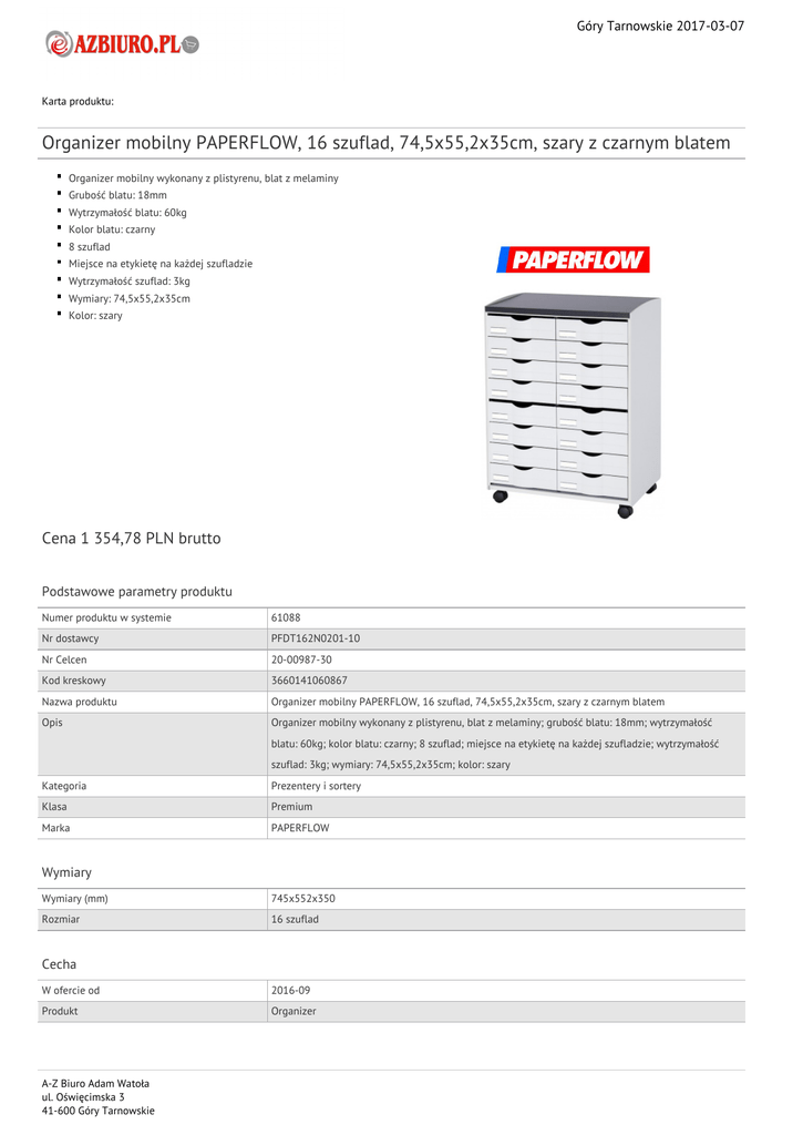 Góry Tarnowskie 2017-03-07 Karta produktu: Organizer mobilny PAPERFLOW, 16 szuflad, 74,5x55,2x35cm, szary z czarnym blatem Organizer mobilny wykonany z plistyrenu, blat z melaminy Grubość blatu: 18mm Wytrzymałość blatu: 60kg Kolor blatu: czarny 8 szuflad Miejsce na etykietę na każdej szufladzie Wytrzymałość szuflad: 3kg Wymiary: 74,5x55,2x35cm Kolor: szary Cena 1 354,78 PLN brutto Podstawowe parametry produktu Numer produktu w systemie 61088 Nr dostawcy PFDT162N0201-10 Nr Celcen 20-00987-30 Kod kreskowy 3660141060867 Nazwa produktu Organizer mobilny PAPERFLOW, 16 szuflad, 74,5x55,2x35cm, szary z czarnym blatem Opis Organizer mobilny wykonany z plistyrenu, blat z melaminy; grubość blatu: 18mm; wytrzymałość blatu: 60kg; kolor blatu: czarny; 8 szuflad; miejsce na etykietę na każdej szufladzie; wytrzymałość szuflad: 3kg; wymiary: 74,5x55,2x35cm; kolor: szary Kategoria Prezentery i sortery Klasa Premium Marka PAPERFLOW Wymiary Wymiary (mm) 745x552x350 Rozmiar 16 szuflad Cecha W ofercie od 2016-09 Produkt Organizer A-Z Biuro Adam Watoła ul. Oświęcimska 3 41-600 Góry Tarnowskie Góry Tarnowskie 2017-03-07 Karta katalogowa produktu cd. Organizer mobilny PAPERFLOW, 16 szuflad, 74,5x55,2x35cm, szary z czarnym blatem Typ Mobilny Przegrody 16 Wspólny słownik zamówień CPV 30193500-3 Stojak na materiały reklamowe Certyfikaty Nowy produkt w ofercie Standard Hit Standard Kolor Kolor Pozostałe zdjęcia produktu Serdecznie zapraszamy do współpracy A-Z Biuro Adam Watoła zespół. A-Z Biuro Adam Watoła ul. Oświęcimska 3 41-600 Góry Tarnowskie Szary