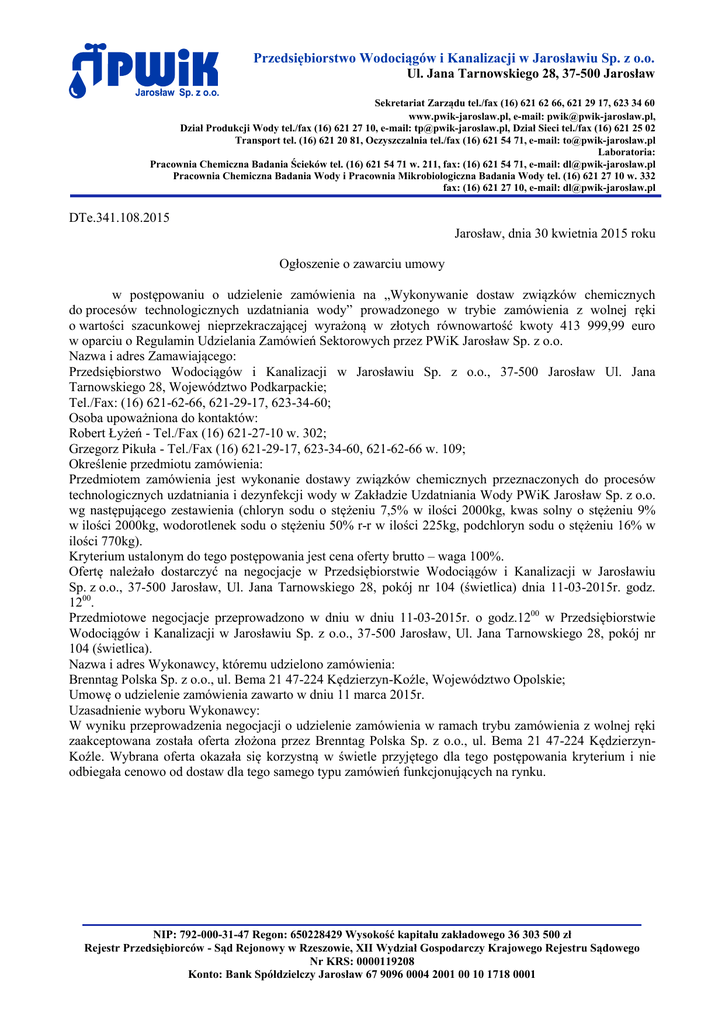 Przedsiębiorstwo Wodociągów i Kanalizacji w Jarosławiu Sp. z o.o. Ul. Jana Tarnowskiego 28, 37-500 Jarosław Sekretariat Zarządu tel./fax (16) 621 62 66, 621 29 17, 623 34 60 www.pwik-jaroslaw.pl, e-mail: [email protected], Dział Produkcji Wody tel./fax (16) 621 27 10, e-mail: [email protected], Dział Sieci tel./fax (16) 621 25 02 Transport tel. (16) 621 20 81, Oczyszczalnia tel./fax (16) 621 54 71, e-mail: [email protected] Laboratoria: Pracownia Chemiczna Badania Ścieków tel. (16) 621 54 71 w. 211, fax: (16) 621 54 71, e-mail: [email protected] Pracownia Chemiczna Badania Wody i Pracownia Mikrobiologiczna Badania Wody tel. (16) 621 27 10 w. 332 fax: (16) 621 27 10, e-mail: [email protected] DTe.341.108.2015 Jarosław, dnia 30 kwietnia 2015 roku Ogłoszenie o zawarciu umowy w postępowaniu o udzielenie zamówienia na „Wykonywanie dostaw związków chemicznych do procesów technologicznych uzdatniania wody” prowadzonego w trybie zamówienia z wolnej ręki o wartości szacunkowej nieprzekraczającej wyrażoną w złotych równowartość kwoty 413 999,99 euro w oparciu o Regulamin Udzielania Zamówień Sektorowych przez PWiK Jarosław Sp. z o.o. Nazwa i adres Zamawiającego: Przedsiębiorstwo Wodociągów i Kanalizacji w Jarosławiu Sp. z o.o., 37-500 Jarosław Ul. Jana Tarnowskiego 28, Województwo Podkarpackie; Tel./Fax: (16) 621-62-66, 621-29-17, 623-34-60; Osoba upoważniona do kontaktów: Robert Łyżeń - Tel./Fax (16) 621-27-10 w. 302; Grzegorz Pikuła - Tel./Fax (16) 621-29-17, 623-34-60, 621-62-66 w. 109; Określenie przedmiotu zamówienia: Przedmiotem zamówienia jest wykonanie dostawy związków chemicznych przeznaczonych do procesów technologicznych uzdatniania i dezynfekcji wody w Zakładzie Uzdatniania Wody PWiK Jarosław Sp. z o.o. wg następującego zestawienia (chloryn sodu o stężeniu 7,5% w ilości 2000kg, kwas solny o stężeniu 9% w ilości 2000kg, wodorotlenek sodu o stężeniu 50% r-r w ilości 225kg, podchloryn sodu o stężeniu 16% w ilości 770kg). Kryterium ustalonym do tego postępowania jest cena oferty brutto – waga 100%. Ofertę należało dostarczyć na negocjacje w Przedsiębiorstwie Wodociągów i Kanalizacji w Jarosławiu Sp. z o.o., 37-500 Jarosław, Ul. Jana Tarnowskiego 28, pokój nr 104 (świetlica) dnia 11-03-2015r. godz. 1200. Przedmiotowe negocjacje przeprowadzono w dniu w dniu 11-03-2015r. o godz.1200 w Przedsiębiorstwie Wodociągów i Kanalizacji w Jarosławiu Sp. z o.o., 37-500 Jarosław, Ul. Jana Tarnowskiego 28, pokój nr 104 (świetlica). Nazwa i adres Wykonawcy, któremu udzielono zamówienia: Brenntag Polska Sp. z o.o., ul. Bema 21 47-224 Kędzierzyn-Koźle, Województwo Opolskie; Umowę o udzielenie zamówienia zawarto w dniu 11 marca 2015r. Uzasadnienie wyboru Wykonawcy: W wyniku przeprowadzenia negocjacji o udzielenie zamówienia w ramach trybu zamówienia z wolnej ręki zaakceptowana została oferta złożona przez Brenntag Polska Sp. z o.o., ul. Bema 21 47-224 KędzierzynKoźle. Wybrana oferta okazała się korzystną w świetle przyjętego dla tego postępowania kryterium i nie odbiegała cenowo od dostaw dla tego samego typu zamówień funkcjonujących na rynku. NIP: 792-000-31-47 Regon: 650228429 Wysokość kapitału zakładowego 36 303 500 zł Rejestr Przedsiębiorców - Sąd Rejonowy w Rzeszowie, XII Wydział Gospodarczy Krajowego Rejestru Sądowego Nr KRS: 0000119208 Konto: Bank Spółdzielczy Jarosław 67 9096 0004 2001 00 10 1718 0001