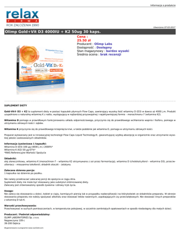 Informacje o produkcie Utworzono 07-03-2017 Olimp Gold+Vit D3 4000IU + K2 50ug 30 kaps. Cena : 25.50 zł Producent : Olimp Labs Dostępność : Dostępny Stan magazynowy : bardzo wysoki Średnia ocena : brak recenzji SUPLEMENT DIETY Gold-Vit® D3 + K2 to suplement diety w postaci kapsułek płynnych Flow Caps, zawierający wysoką ilość witaminy D (D3) w dawce aż 4000 j.m. Produkt uzupełniono o naturalną witaminę K z natto, występującą w najbardziej przyswajalnej i najaktywniejszej formie – menachinonu-7 (witamina K2). Witamina D pomaga w prawidłowym funkcjonowaniu układu odpornościowego, przyczynia się do prawidłowego wchłaniania wapnia i fosforu, pomaga w utrzymaniu zdrowych kości i zębów. Witamina K przyczynia się do prawidłowego krzepnięcia krwi, a także podobnie jak witamina D, pomaga w utrzymaniu zdrowych kości. Preparat wytwarzany jest w innowacyjnej technologii Flow Caps Liquid Technology®, gwarantującej szybką absorpcję w organizmie oraz utrzymanie wysokiej jakości zastosowanych składników. Informacja żywieniowa 1 kapsułki: Witamina D (D3) 100 µg (4000 j.m.) 2000%* Witamina K (K2) 50 µg 67%* *RWS Referencyjne Wartości Spożycia Składniki: olej słonecznikowy, witamina K (menachinon-7 – witamina K2 otrzymywana z soi przez fermentację), witamina D (cholekalcyferol – witamina D3), przeciwutleniacz – mieszanina tokoferoli; składnik otoczki – żelatyna. Zalecana dzienna porcja: 1 kapsułka raz dziennie po posiłku. Nie należy przekraczać zalecanej porcji do spożycia w ciągu dnia. Suplement diety nie może być stosowany jako substytut zróżnicowanej diety. Zalecany jest zrównoważony sposób żywienia i zdrowy tryb życia. Uwaga: Nie zaleca się stosowania u dzieci, kobiet w ciąży, karmiących piersią lub w przypadku nadwrażliwości na którykolwiek ze składników preparatu. W okresie stosowania preparatu nie należy spożywać alkoholu oraz stosować leków nasennych, uspokajających czy przeciwlękowych. Nie stosować innych preparatów z witaminą D lub K. Warunki przechowywania: Przechowywać w suchych pomieszczeniach, w temperaturze pokojowej, w szczelnie zamkniętych opakowaniach w sposób niedostępny dla małych dzieci. Producent / Podmiot odpowiedzialny: OLIMP LABORATORIES Sp. z o.o. Nagawczyna 109 c 39-200 Dębica Wygenerowano w programie www.oscGold.com Opakowanie: 30 kapsułek