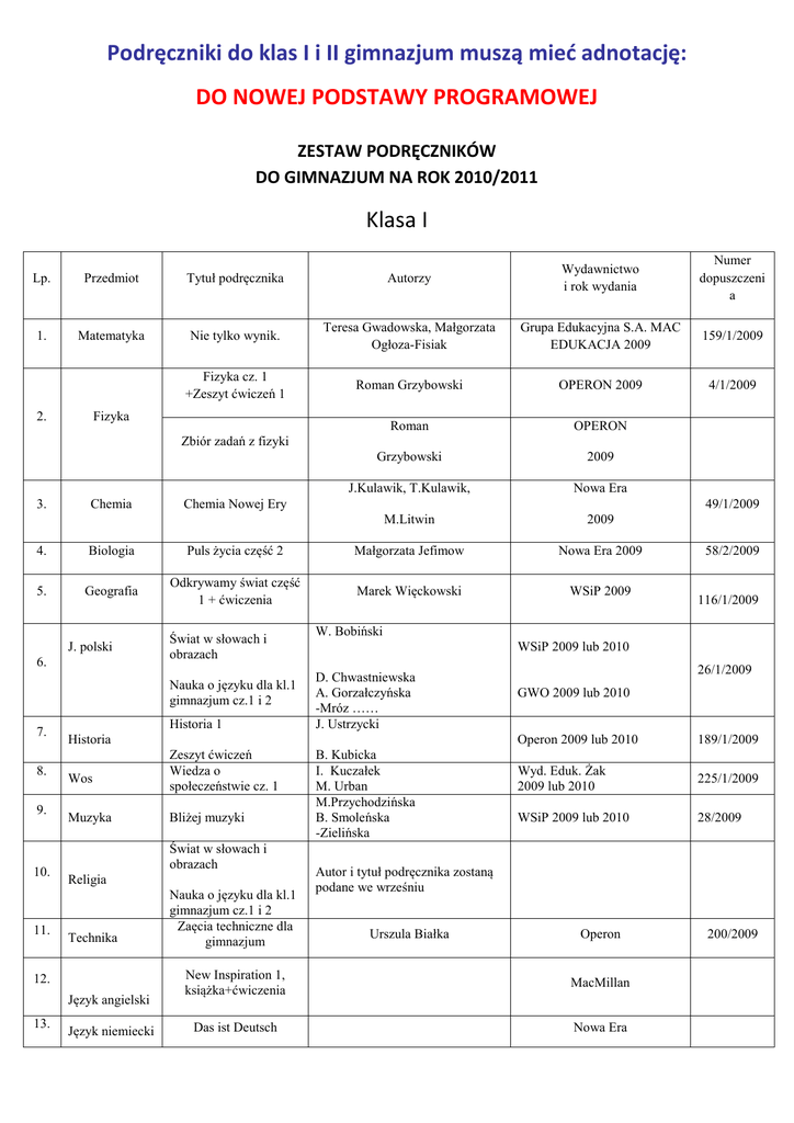 Podręczniki do klas I i II gimnazjum muszą mieć adnotację: DO NOWEJ PODSTAWY PROGRAMOWEJ ZESTAW PODRĘCZNIKÓW DO GIMNAZJUM NA ROK 2010/2011 Klasa I Lp. Przedmiot Tytuł podręcznika Autorzy Wydawnictwo i rok wydania Numer dopuszczeni a 1. Matematyka Nie tylko wynik. Teresa Gwadowska, Małgorzata Ogłoza-Fisiak Grupa Edukacyjna S.A. MAC EDUKACJA 2009 159/1/2009 Fizyka cz. 1 +Zeszyt ćwiczeń 1 Roman Grzybowski OPERON 2009 4/1/2009 Roman OPERON Grzybowski 2009 J.Kulawik, T.Kulawik, Nowa Era M.Litwin 2009 2. Fizyka Zbiór zadań z fizyki 3. Chemia Chemia Nowej Ery 49/1/2009 4. Biologia Puls życia część 2 Małgorzata Jefimow Nowa Era 2009 5. Geografia Odkrywamy świat część 1 + ćwiczenia Marek Więckowski WSiP 2009 J. polski 6. Świat w słowach i obrazach Nauka o języku dla kl.1 gimnazjum cz.1 i 2 7. 8. 9. 10. 11. Historia 1 Wos Muzyka Świat w słowach i obrazach Religia Technika 12. Język angielski 13. Bliżej muzyki Język niemiecki Nauka o języku dla kl.1 gimnazjum cz.1 i 2 Zaęcia techniczne dla gimnazjum 116/1/2009 W. Bobiński WSiP 2009 lub 2010 D. Chwastniewska A. Gorzałczyńska -Mróz …… J. Ustrzycki Historia Zeszyt ćwiczeń Wiedza o społeczeństwie cz. 1 58/2/2009 B. Kubicka I. Kuczałek M. Urban M.Przychodzińska B. Smoleńska -Zielińska 26/1/2009 GWO 2009 lub 2010 Operon 2009 lub 2010 189/1/2009 Wyd. Eduk. Żak 2009 lub 2010 225/1/2009 WSiP 2009 lub 2010 28/2009 Autor i tytuł podręcznika zostaną podane we wrześniu Urszula Białka Operon New Inspiration 1, książka+ćwiczenia MacMillan Das ist Deutsch Nowa Era 200/2009 Klasa II Lp. Przedmiot Tytuł podręcznika Autorzy Wydawnictwo i rok wydania 1. Matematyka Nie tylko wynik. Teresa Gwadowska, Małgorzata Ogłoza-Fisiak Grupa Edukacyjna S.A. MAC EDUKACJA 2010 Fizyka cz. 2 +Zeszyt ćwiczeń 2 Roman Grzybowski OPERON 2010 Roman OPERON Grzybowski 2009 J.Kulawik, T.Kulawik, Nowa Era M.Litwin 2010 2. Fizyka Numer dopuszczeni a Zbiór zadań z fizyki 3. Chemia Chemia Nowej Ery 42/2/2009 4. Biologia Puls życia część 1 Małgorzata Jefimow, Marian Sęktas Nowa Era 2009 5. Geografia Odkrywamy świat część 2 + ćwiczenia Marek Więckowski WSiP 2010 J. polski 6. 7. 8. 9. 10. Świat w słowach i obrazach kl. II W. Bobiński Nauka o języku kl. II – zeszyt ćwiczeń Historia 2 + zeszyt ćwiczeń Wiedza o społeczeństwie cz.2 Świat w słowach i obrazach kl. II D. Chwastniewska D. Rożek WSiP 2010 26/2/2009 Historia Wiedza o społeczeństwie Religia Technika Nauka o języku kl. II – zeszyt ćwiczeń Zaęcia techniczne dla gimnazjum kontunuacja GWO 2010 Operon 2010 E. Dobrzycka K. Makara Operon 2010 English in Mind 3, książka+ćwiczenia 11. Język angielski Urszula Białka Operon Język niemiecki Cambridge II New Inspiration 2, książka+ćwiczenia Das ist Deutsch 2 96/2/2010 Autor i tytuł podręcznika zostaną podane we wrześniu II B 12. 58/1/2009 MacMillan Nowa Era 200/2009 Klasa III Lp. Przedmiot Tytuł podręcznika Wydawnictwo i rok wydania Autorzy Numer dopuszczeni a Anna Drążek, WSiP Warszawa 1. Matematyka Matematyka wokół nas Ewa Durnjak, 62/2/2009 2009 Ewa Kokiernak- Jurkiewicz M.Rozenbajger, Fizyka dla gimnazjum część 3 2. ZAMKOR 249/000 R.Rozenbajger Fizyka Roman OPERON Grzybowski 2009 Zbiór zadań z fizyki J.Kulawik, T.Kulawik, Nowa Era 3. Chemia Chemia Nowej Ery 4. Biologia Biologia część 2 5. Geografia Odkrywamy świat część 3 + ćwiczenia M.Litwin 23/08 Waldemar Lewiński, Jan Prokop 6. 7. 8. 9. Świat w słowach i obrazach kl. III Marek Więckowski W. Bobiński OPERON 382/02 WSiP 23/03 WSiP od 2009 J. polski Historia Muzyka 4/09 Nauka o języku kl. II – zeszyt ćwiczeń Historia 3 . Przez wieki + zeszyt ćwiczeń Świat muzyki kl. III Język niemiecki GWO od 2009 J. Wendt Wydawnictwo Rożak 160/04 W. Panek WSiP 50/02 Autor i tytuł podręcznika zostaną podane we wrześniu Religia Język angielski D.Chwastniewska D. Rożek New Inspiration 3, książka+ćwiczenia Das ist Deutsch kontynuacja MacMillan Nowa Era
