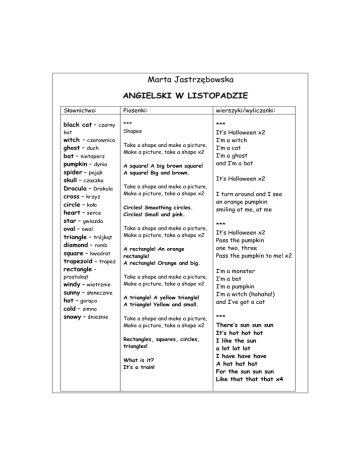 Marta Jastrzębowska ANGIELSKI W LISTOPADZIE Słownictwo: Piosenki: wierszyki/wyliczanki: black cat – czarny *** Shapes *** It’s Halloween x2 I’m a witch I’m a cat I’m a ghost and I’m a bat kot witch – czarownica ghost – duch bat – nietoperz pumpkin – dynia spider – pająk skull – czaszka Dracula – Drakula cross – krzyż circle – koło heart – serce star – gwiazda oval – owal triangle – trójkąt diamond – romb square – kwadrat trapezoid – trapez rectangle prostokąt windy – wietrznie sunny – słonecznie hot – gorąco cold – zimno snowy – śnieżnie Take a shape and make a picture, Make a picture, take a shape x2 A square! A big brown square! A square! Big and brown. It’s Halloween x2 Take a shape and make a picture, Make a picture, take a shape x2 Circles! Smoothing circles. Circles! Small and pink. Take a shape and make a picture, Make a picture, take a shape x2 A rectangle! An orange rectangle! A rectangle! Orange and big. Take a shape and make a picture, Make a picture, take a shape x2 A triangle! A yellow triangle! A triangle! Yellow and small. Take a shape and make a picture, Make a picture, take a shape x2 Rectangles, squares, circles, triangles! What is it? It’s a train! I turn around and I see an orange pumpkin smiling at me, at me *** It’s Halloween x2 Pass the pumpkin one two, three Pass the pumpkin to me! x2 I’m a monster I’m a bat I’m a pumpkin I’m a witch (hahaha!) and I’ve got a cat *** There’s sun sun sun It’s hot hot hot I like the sun a lot lot lot I have have have A hat hat hat For the sun sun sun Like that that that x4