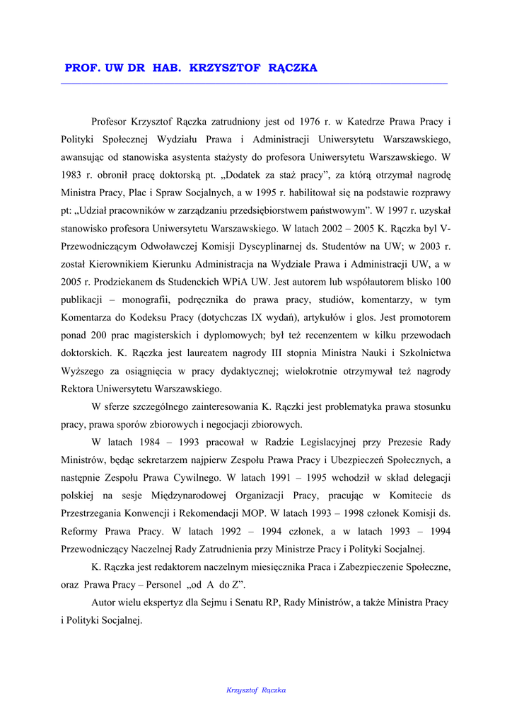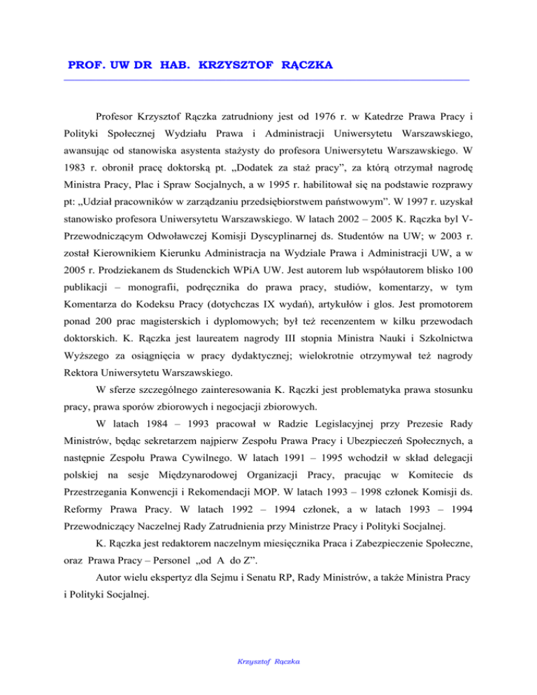 PROF. UW DR HAB. KRZYSZTOF RĄCZKA ___________________________________________________________________________ Profesor Krzysztof Rączka zatrudniony jest od 1976 r. w Katedrze Prawa Pracy i Polityki Społecznej Wydziału Prawa i Administracji Uniwersytetu Warszawskiego, awansując od stanowiska asystenta stażysty do profesora Uniwersytetu Warszawskiego. W 1983 r. obronił pracę doktorską pt. „Dodatek za staż pracy”, za którą otrzymał nagrodę Ministra Pracy, Plac i Spraw Socjalnych, a w 1995 r. habilitował się na podstawie rozprawy pt: „Udział pracowników w zarządzaniu przedsiębiorstwem państwowym”. W 1997 r. uzyskał stanowisko profesora Uniwersytetu Warszawskiego. W latach 2002 – 2005 K. Rączka byl VPrzewodniczącym Odwoławczej Komisji Dyscyplinarnej ds. Studentów na UW; w 2003 r. został Kierownikiem Kierunku Administracja na Wydziale Prawa i Administracji UW, a w 2005 r. Prodziekanem ds Studenckich WPiA UW. Jest autorem lub współautorem blisko 100 publikacji – monografii, podręcznika do prawa pracy, studiów, komentarzy, w tym Komentarza do Kodeksu Pracy (dotychczas IX wydań), artykułów i glos. Jest promotorem ponad 200 prac magisterskich i dyplomowych; był też recenzentem w kilku przewodach doktorskich. K. Rączka jest laureatem nagrody III stopnia Ministra Nauki i Szkolnictwa Wyższego za osiągnięcia w pracy dydaktycznej; wielokrotnie otrzymywał też nagrody Rektora Uniwersytetu Warszawskiego. W sferze szczególnego zainteresowania K. Rączki jest problematyka prawa stosunku pracy, prawa sporów zbiorowych i negocjacji zbiorowych. W latach 1984 – 1993 pracował w Radzie Legislacyjnej przy Prezesie Rady Ministrów, będąc sekretarzem najpierw Zespołu Prawa Pracy i Ubezpieczeń Społecznych, a następnie Zespołu Prawa Cywilnego. W latach 1991 – 1995 wchodził w skład delegacji polskiej na sesje Międzynarodowej Organizacji Pracy, pracując w Komitecie ds Przestrzegania Konwencji i Rekomendacji MOP. W latach 1993 – 1998 członek Komisji ds. Reformy Prawa Pracy. W latach 1992 – 1994 członek, a w latach 1993 – 1994 Przewodniczący Naczelnej Rady Zatrudnienia przy Ministrze Pracy i Polityki Socjalnej. K. Rączka jest redaktorem naczelnym miesięcznika Praca i Zabezpieczenie Społeczne, oraz Prawa Pracy – Personel „od A do Z”. Autor wielu ekspertyz dla Sejmu i Senatu RP, Rady Ministrów, a także Ministra Pracy i Polityki Socjalnej. Krzysztof Rączka