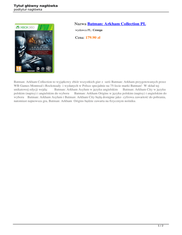 Tytuł główny nagłówka podtytuł nagłówka Nazwa Batman: Arkham Collection PL wydawca PL: Cenega Cena: 179.90 zł Batman: Arkham Collection to wyjątkowy zbiór wszystkich gier z serii Batman: Arkham przygotowanych przez WB Games Montreal i Rocksteady i wydanych w Polsce specjalnie na 75-lecie marki Batman! W skład tej unikatowej edycji wejdą: Batman: Arkham Asylum w języku angielskim Batman: Arkham City w języku polskim (napisy) i angielskim do wyboru Batman: Arkham Origins w języku polskim (napisy) i angielskim do wyboru Batman: Arkham Asylum i Batman: Arkham City będą dostępne jako cyfrowa zawartość do pobrania, natomiast najnowsza gra, Batman: Arkham Origins będzie zawarta na fizycznym nośniku. 1/2 Tytuł główny nagłówka podtytuł nagłówka Nazwa Wartość Wydawca PL Cenega Poland Data premiery 05.09.2014 Producent Tryb gry Kategoria wiekowa Wersja językowa Wymagania sprzętowe Format WB Games Montreal Single / Multiplayer 16+ PL (napisy) Konsola Xbox 360 DVD 2/2
