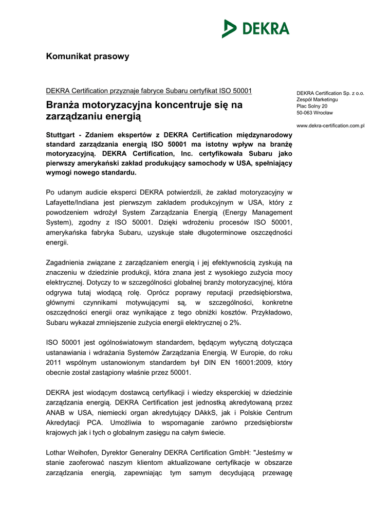 Komunikat prasowy DEKRA Certification przyznaje fabryce Subaru certyfikat ISO 50001 BranŜa motoryzacyjna koncentruje się na zarządzaniu energią DEKRA Certification Sp. z o.o. Zespół Marketingu Plac Solny 20 50-063 Wrocław www.dekra-certification.com.pl Stuttgart - Zdaniem ekspertów z DEKRA Certification międzynarodowy standard zarządzania energią ISO 50001 ma istotny wpływ na branŜę motoryzacyjną. DEKRA Certification, Inc. certyfikowała Subaru jako pierwszy amerykański zakład produkujący samochody w USA, spełniający wymogi nowego standardu. Po udanym audicie eksperci DEKRA potwierdzili, Ŝe zakład motoryzacyjny w Lafayette/Indiana jest pierwszym zakładem produkcyjnym w USA, który z powodzeniem wdroŜył System Zarządzania Energią (Energy Management System), zgodny z ISO 50001. Dzięki wdroŜeniu procesów ISO 50001, amerykańska fabryka Subaru, uzyskuje stałe długoterminowe oszczędności energii. Zagadnienia związane z zarządzaniem energią i jej efektywnością zyskują na znaczeniu w dziedzinie produkcji, która znana jest z wysokiego zuŜycia mocy elektrycznej. Dotyczy to w szczególności globalnej branŜy motoryzacyjnej, która odgrywa tutaj wiodącą rolę. Oprócz poprawy reputacji przedsiębiorstwa, głównymi czynnikami motywującymi są, w szczególności, konkretne oszczędności energii oraz wynikające z tego obniŜki kosztów. Przykładowo, Subaru wykazał zmniejszenie zuŜycia energii elektrycznej o 2%. ISO 50001 jest ogólnoświatowym standardem, będącym wytyczną dotycząca ustanawiania i wdraŜania Systemów Zarządzania Energią. W Europie, do roku 2011 wspólnym ustanowionym standardem był DIN EN 16001:2009, który obecnie został zastąpiony właśnie przez 50001. DEKRA jest wiodącym dostawcą certyfikacji i wiedzy eksperckiej w dziedzinie zarządzania energią. DEKRA Certification jest jednostką akredytowaną przez ANAB w USA, niemiecki organ akredytujący DAkkS, jak i Polskie Centrum Akredytacji PCA. UmoŜliwia to wspomaganie zarówno przedsiębiorstw krajowych jak i tych o globalnym zasięgu na całym świecie. Lothar Weihofen, Dyrektor Generalny DEKRA Certification GmbH: "Jesteśmy w stanie zaoferować naszym klientom aktualizowane certyfikacje w obszarze zarządzania energią, zapewniając tym samym decydującą przewagę konkurencyjną. Dzięki naszemu wieloletniemu doświadczeniu w branŜy i międzynarodowej sieci ekspertów moŜemy pomóc branŜy motoryzacyjnej, w szczególności w tym obszarze." Spółka zaleŜna DEKRA, DEKRA Solutions pomaga równieŜ przedsiębiorstwom we wdraŜaniu działań dotyczących trwałości i wydajności energii. KONTAKT: Wrocław, 02 lipiec 2012 /Nr 090 Filip Wesołowski +48.71.780-47-72 +49.71.780-47-77 do 78 [email protected] Strona 2