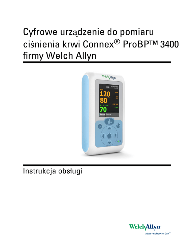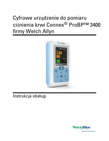 Cyfrowe urządzenie do pomiaru ciśnienia krwi Connex® ProBP™ 3400 firmy Welch Allyn Instrukcja obsługi © 2011 Welch Allyn. Wszelkie prawa zastrzeżone. Aby ułatwić stosowanie opisanego w niniejszej publikacji produktu zgodnie z przeznaczeniem, nabywca produktu ma prawo kopiować niniejszą publikację (wyłącznie do użytku wewnętrznego) z nośnika dostarczonego przez firmę Welch Allyn. Zabrania się innego użytkowania, reprodukowania lub rozpowszechniania niniejszej publikacji ani żadnej jej części bez uzyskania pisemnej zgody firmy Welch Allyn. Firma Welch Allyn nie ponosi odpowiedzialności za jakiekolwiek obrażenia ciała jakichkolwiek osób oraz nielegalne lub nieprawidłowe korzystanie z produktu, które mogłoby wynikać z niestosowania się do instrukcji obsługi, ostrzeżeń, przestróg lub oświadczeń dotyczących przeznaczenia, zamieszczonych w niniejszej instrukcji. Welch Allyn, SureBP Technology i Welch Allyn FlexiPort są zarejestrowanymi znakami towarowymi firmy Welch Allyn. Termin Bluetooth® i loga są zarejestrowanymi znakami towarowymi będącymi w posiadaniu firmy Bluetooth SIG, Inc. i każde wykorzystanie tych znaków przez firmę Welch Allyn jest licencjonowane. Prawa autorskie (2011) do oprogramowania w produkcie należą do firmy Welch Allyn lub jej dostawców. Wszelkie prawa zastrzeżone. Oprogramowanie chronione jest prawem autorskim Stanów Zjednoczonych oraz umowami międzynarodowymi obowiązującymi na całym świecie. W ramach przepisów licencjobiorca ma prawo korzystać z kopii oprogramowania stanowiącej element urządzenia zgodnie z przeznaczeniem produktu, w którym jest ono zainstalowane. Oprogramowania nie można kopiować, dekompilować, poddawać procesowi inżynierii wstecznej, dezasemblacji ani w żaden inny sposób przetwarzać na postać zrozumiałą dla człowieka. Sprzedaż nie obejmuje oprogramowania ani żadnej jego kopii; wszelkie prawa i tytuły własności do oprogramowania należą do firmy Welch Allyn lub jej dostawców. W celu uzyskania informacji na temat dowolnych produktów firmy Welch Allyn proszę kontaktować się z Pomocą Techniczną firmy Welch Allyn(www.welchallyn.com/support) lub dzwonić pod numer: USA +1 800 535 6663 +1 315 685 4560 Kanada +1 800 561 8797 Europejskie Centrum Tel. +353 46 90 67790 Niemcy +49 695 098 5132 Japonia +81 4 2703 6084 Malezja +603 7875 3341 Singapur +65 6419 8100 Hiszpania +34 917 499 357 Wielka Brytania +44 207 365 6780 Australia +61 2 9638 3000 Chiny Francja Włochy Ameryka Łacińska Holandia RPA Szwecja 103701 (CD) DIR 80016221 Ver. B Przedstawiciel ds. urzędowych Welch Allyn, Inc. 4341 State Street Road Welch Allyn, Limited Skaneateles Falls, NY 13153-0220 USA Dublin Road www.welchallyn.com Navan, County Meath Navan Business Park Republika Irlandii +86 21 6327 9631 +33 155 69 58 49 +39 026 968 2425 +1 305 669 9003 +31 202 061 360 +27 11 777 7555 +46 85 853 6551 iii Spis treści Wstępna konfiguracja urządzenia .......................................................... 1 Wprowadzenie ......................................................................................... 3 Przeznaczenie .................................................................................................................................... 3 Symbole ................................................................................................... 5 Ogólne ostrzeżenia i przestrogi .............................................................. 9 Ostrzeżenia i przestrogi dotyczące nieinwazyjnego pomiaru ciśnienia tętniczego ............................................................................................... 13 Lista kontrolna zawartości .................................................................... 15 Przyciski sterujące i wskaźniki .............................................................. 17 Elementy dostępne na ekranie ............................................................. 19 Złącza ...................................................................................................... 21 Przewód i mankiet do pomiaru ciśnienia tętniczego krwi .................. 23 Wybór mankietu do pomiaru ciśnienia tętniczego .................................................................... 23 Transformator zasilania ........................................................................ 25 Podłączanie transformatora zasilającego i wtyczki ściennej/przewodu zasilania sieciowego ....................................................................................................................................... 25 Ładowanie urządzenia .................................................................................................................... 26 Przygotowanie do pracy ....................................................................... 27 Montaż akumulatora ...................................................................................................................... 27 Mocowanie urządzenia .................................................................................................................. 28 Podłączanie przewodu zasilającego i wtyczki ściennej/przewodu zasilania sieciowego .. 28 Ładowanie urządzenia ProBP 3400 .............................................................................................. 28 Pierwsze uruchomienie ................................................................................................................. 28 iv Spis treści Cyfrowe urządzenie do pomiaru ciśnienia krwi Connex® ProBP™ 3400 firmy Welch Allyn Akumulator ........................................................................................... 31 Uruchomienie ........................................................................................ 33 Tryb gotowości ...................................................................................... 35 Pomiar ciśnienia krwi .........................................