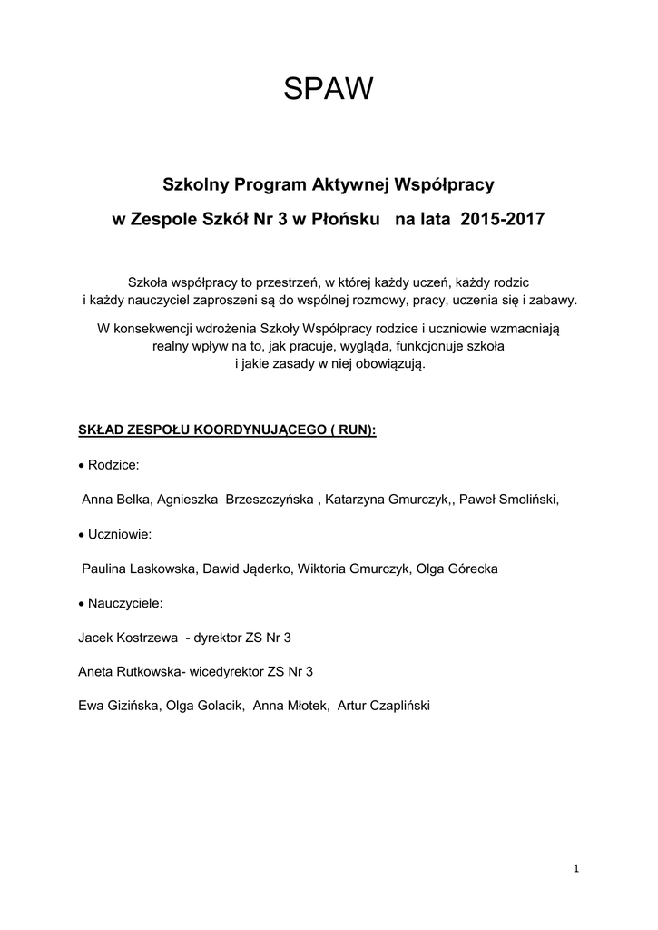 SPAW Szkolny Program Aktywnej Współpracy w Zespole Szkół Nr 3 w Płońsku na lata 2015-2017 Szkoła współpracy to przestrzeń, w której każdy uczeń, każdy rodzic i każdy nauczyciel zaproszeni są do wspólnej rozmowy, pracy, uczenia się i zabawy. W konsekwencji wdrożenia Szkoły Współpracy rodzice i uczniowie wzmacniają realny wpływ na to, jak pracuje, wygląda, funkcjonuje szkoła i jakie zasady w niej obowiązują. SKŁAD ZESPOŁU KOORDYNUJĄCEGO ( RUN): Rodzice: Anna Belka, Agnieszka Brzeszczyńska , Katarzyna Gmurczyk,, Paweł Smoliński, Uczniowie: Paulina Laskowska, Dawid Jąderko, Wiktoria Gmurczyk, Olga Górecka Nauczyciele: Jacek Kostrzewa - dyrektor ZS Nr 3 Aneta Rutkowska- wicedyrektor ZS Nr 3 Ewa Gizińska, Olga Golacik, Anna Młotek, Artur Czapliński 1 ZASADY WSPÓŁPRACY RUN: Otwartość - dzielimy się swoimi pomysłami i opiniami, słuchamy siebie nawzajem. Rytmiczność spotkań - stałe miejsce, określone terminy, przygotowywanie materiałów Dzielimy się zadaniami, obowiązkami. Angażujemy się wszyscy we wspólnie zaplanowane do realizacji zadania, zgodnie z podziałem zadań. Dotrzymujemy zobowiązań Zdanie uczniów jest tak samo ważne jak nauczycieli i rodziców. Wybieramy pomysły demokratycznie. Informowanie społeczności szkolnej o prowadzonych działaniach. Systematyczne dokumentowanie realizacji programu (prowadzenie notatek, sporządzanie raportów, rozliczanie odpowiedzialnych, robienie zdjęć). CELE WSPÓLPRACY : budowanie partnerstwa i zintegrowanie społeczności szkolnej Wzmocnienie wpływu rodziców na to, jak pracuje, wygląda, funkcjonuje szkoła i jakie zasady w niej obowiązują. poprawa klimatu szkoły poprzez kształtowanie pozytywnych relacji pomiędzy wszystkimi podmiotami w szkole, opartych na zaufaniu, życzliwości i szacunku; usprawnienie komunikacji wewnątrzszkolnej między członkami społeczności szkolnej wspólna realizacja zadań ważnych dla szkoły; promocja szkoły w środowisku lokalnym. 2 SZKOLNY PROGRAM AKTYWNEJ WSPÓŁPRACY REALIZOWANY BĘDZIE W OBSZARACH: I. OBSZAR : NAUCZANIE, UCZENIE SIĘ I WYCHOWANIE Zadanie do realizacji: Zajęcia pozalekcyjne prowadzone z udziałem / lub przez rodziców „Starsi-młodszym” Starsi uczniowie po lekcjach czytają młodszym kolegom książki, bawią się z nimi. Zajęcia otwarte dla rodziców Zajęcia pozaszkolne na basenie II. OBSZAR : ORGANIZACJA ŻYCIA SZKOLNEGO Zadania do realizacji: Organizacja cyklicznych debat RUN w sprawach ważnych dla wszystkich członków społeczności szkolnej; Organizowanie aktywnych spotkań – imprezy sportowo-integracyjne z udziałem rodziców, nauczycieli i uczniów; Włączenie się rodziców i uczniów w przygotowanie i organizację imprez i uroczystości szklonych, dni otwartych szkoły Powołanie „Klubu Rodzica” III. OBSZAR : PRZESTRZEŃ SZKOLNA Zadania do realizacji: Wspólne zagospodarowanie terenu wokół szkoły Organizacja zebrań z rodzicami w klimacie sprzyjającym współpracy Doposażenie biblioteki i świetlicy szkolnej EFEKTY WSPÓŁPRACY: Ważne dla szkoły decyzje podejmowane są wspólnie z poszanowaniem wszystkich członków społeczności szkolnej. Upowszechnienie idei partnerstwa dla zapewnienia realizacji zadań statutowych szkoły. Samorząd Uczniowski i Rada Rodziców są pełnoprawnymi współorganizatorami procesów dydaktycznych, wychowawczych i opiekuńczych. Szkoła modeluje postawy uczniów 3 poprzez upowszechnienie idei wspólnej pracy nauczycieli i rodziców. W środowisku lokalnym szkoła postrzegana jest jako placówka przyjazna i otwarta na innowacyjne metody działania. EWALUACJA: Po zakończeniu działań zaplanowanych na rok szkolny 2015/2016 przeprowadzona zostanie ankieta ewaluacyjna wśród uczniów, nauczycieli i rodziców. Wyniki ankiety zostaną przedstawione członkom społeczności szkolnej. Wnioski i rekomendacje wynikające z ankiety wykorzystane zostanę przy projektowaniu zadań na następne lata. SZCZEGÓŁOWY PLAN DZIAŁANIA NA ROK SZKOLNY 2015/2016 I. OBSZAR : NAUCZANIE, UCZENIE SIĘ I WYCHOWANIE DZIAŁANIE NR 1: Zajęcia pozalekcyjne prowadzone z udziałem / lub przez rodziców Na czym będzie polegało wspólne działanie: Rodzice przygotowują dla uczniów propozycje zajęć, które mogą dla nich przygotować i poprowadzić. Zajęcia będą mogli prowadzić także dziadkowie, lub inni członkowie rodziny oraz przyjaciele rodziny uczniów. Przy tej okazji wszyscy prowadzący będą mogli wykorzystać własną wiedzę i umiejętności zawodowe, dzieląc się nimi z dziećmi. W ramach zajęć będą mogły być prowadzone m. in. spotkania poświęcone tradycjom, warsztaty z zakresu bezpieczeństwa na drodze, warsztaty kosmetyczne, modelarskie, kulinarne, rękodzielnicze itd. Propozycje zajęć wraz z harmonogram zostaną przekazane nauczycielom, a Ci przedstawią je uczniom. Biorąc pod uwagę zainteresowanie uczniów, odbędą się te zajęcia, na które zgłoszą się chętni uczniowie. Nauczyciele pomogą rodzicom w organizacji zajęć. 4 Co trzeba zrobić ? (kolejne kroki) Kto co zrobi? Termin przygotowań i realizacji - październik 2015 1. Przygotować propozycje tematów wraz harmonogram zajęć prowadzonych przez rodziców 2. Przedstawienie propozycji zajęć uczniom, stworzenie listy zainteresowanych Wychowawcy klas -listopad 2015 3. Zorganizowanie przestrzeni do prowadzenia zajęć 4. Działania informacyjnodoradcze Dyrekcja -listopad 2015 - listopad 2015 5. Prowadzenie zajęć przez członków rodziny według harmonogramu Rodzice ( wg potrzeb) Nauczyciele, Uczniowie ( działania promujące, plakaty, ulotki , informacje na stronie szkoły i facebooku) Członkowie rodziny Opieka merytoryczn0doradcza – wychowawcy Ewaluacja zadaniapo czym poznamy, że się udało? Rada Rodziców, p. Anna Belka Uwagi -koszty własne - od grudnia do czerwca 2015/16 według harmonogramu Zainteresowanie ofertą Realizacja zadania Ewaluacja w formie ankiety skierowanej do uczniów bior