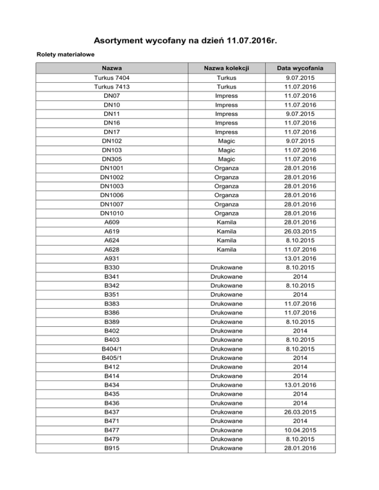 Asortyment wycofany na dzień 11.07.2016r. Rolety materiałowe Nazwa Nazwa kolekcji Data wycofania Turkus 7404 Turkus 9.07.2015 Turkus 7413 Turkus 11.07.2016 DN07 Impress 11.07.2016 DN10 Impress 11.07.2016 DN11 Impress 9.07.2015 DN16 Impress 11.07.2016 DN17 Impress 11.07.2016 DN102 Magic 9.07.2015 DN103 Magic 11.07.2016 DN305 Magic 11.07.2016 DN1001 Organza 28.01.2016 DN1002 Organza 28.01.2016 DN1003 Organza 28.01.2016 DN1006 Organza 28.01.2016 DN1007 Organza 28.01.2016 DN1010 Organza 28.01.2016 A609 Kamila 28.01.2016 A619 Kamila 26.03.2015 A624 Kamila 8.10.2015 A628 Kamila 11.07.2016 A931 13.01.2016 B330 Drukowane 8.10.2015 B341 Drukowane 2014 B342 Drukowane 8.10.2015 B351 Drukowane 2014 B383 Drukowane 11.07.2016 B386 Drukowane 11.07.2016 B389 Drukowane 8.10.2015 B402 Drukowane 2014 B403 Drukowane 8.10.2015 B404/1 Drukowane 8.10.2015 B405/1 Drukowane 2014 B412 Drukowane 2014 B414 Drukowane 2014 B434 Drukowane 13.01.2016 B435 Drukowane 2014 B436 Drukowane 2014 B437 Drukowane 26.03.2015 B471 Drukowane 2014 B477 Drukowane 10.04.2015 B479 Drukowane 8.10.2015 B915 Drukowane 28.01.2016 B1009 Drukowane 26.03.2015 B1010 Drukowane 26.03.2015 B1013 Drukowane 2014 B1015 Drukowane 8.10.2015 B1018 Drukowane 2014 B1020 Drukowane 19.08.2015 B1021 Drukowane 11.07.2016 B1022 Drukowane 19.11.2015 B479 Drukowane 2014 C307 Kinga 11.07.2016 M101 Oliwia 28.01.2016 M102 Oliwia 2014 M103 Oliwia 28.01.2016 M104 Oliwia 28.01.2016 M204 Oliwia 11.07.2016 001 11.07.2016 109 Woale 19.11.2015 110 Aurum 11.07.2016 113 11.07.2016 114 19.11.2015 305 Calamus/Naturae 11.07.2016 308 Calamus/Naturae 11.07.2016 403 Decorum 11.07.2016 518 8.10.2015 603 Decorum 11.07.2016 604 Decorum 19.11.2015 605 Decorum 13.01.2016 606 Decorum 2014 610 Decorum 13.01.2016 611 Decorum 11.07.2016 702 13.01.2016 802 Decorum 11.07.2016 803 Decorum 11.07.2016 Kolekcja Nitidus 200 Nitidus 8.10.2015 Nazwa kolekcji Data wycofania Żaluzje plisowane Nazwa Stockholm 7305 9.07.2015 Rainbow 781 Femi 101 23.02.2015 Femi 102 8.06.2015 Femi 105 - Femi 106 24.08.2015 Femi 111 8.06.2015 Kamari Pearl CP221 13.01.2016 23.02.2015 Metis 320 8.10.2015 Neo 205 8.10.2015 Kolekcja Harmonia - Kolekcja Harmonia BO - Paris 2302 2303 2304 2306 2307 - Kolekcja Icona - Kolekcja Icona BO - Kamari P21 - Żaluzje drewniane / laminowane / bambusowe Nazwa Nazwa kolekcji Data wycofania 013 Green 25mm Basswood 13.01.2016 013 Green 50mm Basswood 13.01.2016 103 Red Cypress 25mm Laminted 13.01.2016 103 Red Cypress 50mm Laminted 11.07.2016 Nazwa kolekcji Data wycofania Żaluzje aluminiowe Nazwa kolor 776 – 25mm 28.01.2016 Kolor 592 – 25mm 28.01.2016 kolor 1926 – 16mm 28.01.2016 kolor 172 – 16mm 28.01.2016