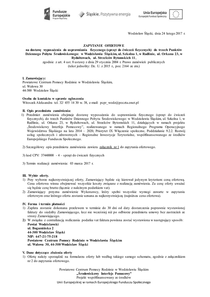 Wodzisław Śląski, dnia 24 lutego 2017 r. ZAPYTANIE OFERTOWE na dostawę wyposażenia do usprawniania fizycznego (sprzęt do ćwiczeń fizycznych) do trzech Punktów Dziennego Pobytu Środowiskowego: w Wodzisławiu Śląskim, ul. Szkolna 1, w Radlinie, ul. Orkana 23, w Rydułtowach, ul. Strzelców Bytomskich 11, zgodnie z art. 4 ust. 8 ustawy z dnia 29 stycznia 2004 r. Prawo zamówień publicznych (tekst jednolity: Dz. U. z 2015 r., poz. 2164 ze zm.) I. Zamawiający: Powiatowe Centrum Pomocy Rodzinie w Wodzisławiu Śląskim, ul. Wałowa 30 44-300 Wodzisław Śląski Osoba do kontaktu w sprawie ogłoszenia Witoszek Aleksandra tel. 32/ 455 14 30 w. 38, e-mail: [email protected] II. Opis przedmiotu zamówienia: 1) Przedmiot zamówienia obejmuje dostawę wyposażenia do usprawniania fizycznego (sprzęt do ćwiczeń fizycznych), do trzech Punktów Dziennego Pobytu Środowiskowego: w Wodzisławiu Śląskim, ul. Szkolna 1, w Radlinie, ul. Orkana 23, w Rydułtowach, ul. Strzelców Bytomskich 11, działających w ramach projektu „Środowiskowy Interfejs Pomocowy”, realizowanego w ramach Regionalnego Programu Operacyjnego Województwa Śląskiego na lata 2014 – 2020, Priorytet IX Włączenie społeczne, Poddziałanie 9.2.2. Rozwój usług społecznych i zdrowotnych - Regionalne Inwestycje Terytorialne, współfinansowanego ze środków Europejskiego Funduszu Społecznego. 2) Szczegółowy opis przedmiotu zamówienia zawiera załącznik nr 1 do zapytania ofertowego. 3) kod CPV: 37440000 - 4 – sprzęt do ćwiczeń fizycznych 3) Termin realizacji zamówienia: 03 marca 2017 r. III. Wybór oferty. 1) Przy wyborze najkorzystniejszej oferty, Zamawiający będzie się kierował jedynym kryterium: ceną ofertową. Cena ofertowa winna obejmować wszystkie koszty związane z realizacją zamówienia. Za cenę oferty uważać się będzie cenę brutto (łącznie z należnym podatkiem vat). 2) Zamawiający przyzna zamówienie Wykonawcy, który spełni wszystkie wymogi zawarte w zapytaniu ofertowym oraz którego oferta zostanie uznana za najkorzystniejszą (najniższa cena ofertowa). IV. Forma i termin płatności 1) Zapłata zostanie dokonana przelewem w terminie do 30 dni od daty dostarczenia poprawnie wystawionej faktury do siedziby Zamawiającego, lecz nie wcześniej niż po odbiorze przedmiotu umowy bez zastrzeżeń ze strony Zamawiającego. 2) W związku z centralizacją rozliczania podatku vat faktura powinna zostać wystawiona w następujący sposób: Powiat Wodzisławski ul. Bogumińska 2 44-300 Wodzisław Śląski NIP: 647-21-75-218 Powiatowe Centrum Pomocy Rodzinie w Wodzisławiu Śląskim ul. Wałowa 30, 44-300 Wodzisław Śląski V. Dane dotyczące złożenia oferty 1) Ofertę należy sporządzić na formularzu oferty lub według takiego samego schematu, zgodnie z załącznikiem nr 2 do zapytania ofertowego. Powiatowe Centrum Pomocy Rodzinie w Wodzisławiu Śląskim „Środowiskowy Interfejs Pomocowy” Projekt współfinansowany ze środków Unii Europejskiej w ramach Europejskiego Funduszu Społecznego Do oferty należy dołączyć dokumentację o której mowa w załączniku Nr 1 zamówienia o fertowego - Opis przedmiotu zamówienia – pkt. IV. 2) Oferta musi być podpisana przez osobę/y upoważnione do reprezentowania Wykonawcy. 3) Miejsce, sposób i termin składania ofert Ofertę należy złożyć w jeden z następujących sposobów: - osobiście w siedzibie Zamawiającego tj. Powiatowym Centrum Pomocy Rodzinie w Wodzisławiu Śląskim przy ul. Wałowej 30, 44-300 Wodzisław Śląski, w sekretariacie (pokój nr 11), - za pośrednictwem poczty na adres Zamawiającego: Powiatowe Centrum Pomocy Rodzinie w Wodzisławiu Śląskim, ul. Wałowa 30, 44-300 Wodzisław Śląski, - elektronicznie na adres mailowy [email protected] – skan podpisanej oferty zgodnie z wymogami zapytania ofertowego; zaleca się przesłać ofertę za pośrednictwem poczty na adres Zamawiającego, j.w. 4) Termin składania ofert upływa w dniu 28.02.2017 roku, o godzinie 10.00 …......................…………………………. (dyrektor PCPR w Wodzisławiu Śląskim) Załączniki: Załącznik 1 Załącznik 2 Opis przedmiotu zamówienia Formularz ofertowy Powiatowe Centrum Pomocy Rodzinie w Wodzisławiu Śląskim „Środowiskowy Interfejs Pomocowy” Projekt współfinansowany ze środków Unii Europejskiej w ramach Europejskiego Funduszu Społecznego