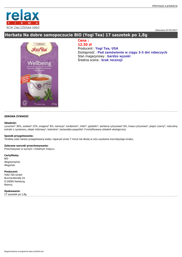 Informacje o produkcie Utworzono 07-03-2017 Herbata Na dobre samopoczucie BIO (Yogi Tea) 17 saszetek po 1,8g Cena : 12.50 zł Producent : Yogi Tea, USA Dostępność : Pod zamówienie w ciągu 3-5 dni roboczych Stan magazynowy : bardzo wysoki Średnia ocena : brak recenzji ZDROWA ŻYWNOŚĆ Składniki: cynamon* 30%, szałwia* 23%, oregano* 8%, lukrecja*, kardamon*, imbir*, goździki*, werbena cytrynowa* 6%, trawa cytrynowa*, pieprz czarny*, naturalny extrakt z cynamonu, olejek imbirowy*, kolendra*, koziaradka pospolita* (*certyfikowany składnik ekologiczny) Sposób przygotowania: Torebkę zalać świeżo przegotowaną wodą i zaparzać przez 7 minut lub dłużej w celu uzyskania mocniejszego smaku. Zalecane warunki przechowywania: Przechowywać w suchym i chłodnym miejscu. Certyfikaty: BIO Wegetariański Wegański Producent: YOGI TEA GmbH Burchardstraße 24 D-20095 Hamburg Niemcy Opakowanie: 17 saszetek po 1,8g Wygenerowano w programie www.oscGold.com