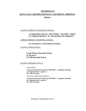INFORMACJA DOTYCZĄCA BEZPIECZEŃSTWA I OCHRONY ZDROWIA (BIOZ) NAZWA OBIEKTU BUDOWLANEGO: „ZABEZPIECZENIA OSUWISKA SKARPY PRZY UL.ORZECHOWEJ W DUSZNIKACH ZDROJU” ADRES OBIEKTU BUDOWLANEGO : ul. Orzechowa w Dusznikach Zdroju NAZWA INWESTORA: Urząd Miasta Duszniki-Zdrój ul. Rynek 6 57-340 Duszniki-Zdrój NAZWA PROJEKTANTA: Adres siedziby: Centrum InŜynierii Lądowej TENSOR – Arkadiusz DróŜdŜ ul. śegiestowska 3, piętro 1 50 - 542 Wrocław Adres biura i adres do korespondencji: Centrum InŜynierii Lądowej TENSOR – Arkadiusz DróŜdŜ ul. śegiestowska 3, piętro 1 50 - 542 Wrocław Wrocław, Październik 2011 r. INFORMACJA DOTYCZĄCA BEZPIECZEŃSTWA I OCHRONY ZDROWIA l. Zakres robót oraz kolejność realizacji Projekt obejmuje : 1.1. Roboty geodezyjne. 1.2. Roboty rozbiórkowe. 1.3. Roboty ziemne. 1.4. Roboty instalacyjne. 1.5. Roboty przy układaniu konstrukcji. 1.6. Roboty wykończeniowe. Kolejność wykonywania robót objętych opracowaniem: 1.7. rozebranie istniejących elementów nawierzchni i podbudowy oraz istniejącej palisady, 1.8. wytyczenie nowej trasy w terenie, 1.9. wykonanie robót ziemnych (nasypy, wykopy), 1.10. wykonanie elementów odwodnienia, 1.11. wykonanie robót instalacyjnych, 1.12. wykonanie elementów konstrukcji inŜ., 1.13. ułoŜenie warstwy odsączającej i zabezpieczającej skarpę, 1.14. wykonanie podbudowy i nawierzchni jezdni, 1.15. -- , 1.16. wykonanie prac wykończeniowych, ogólnobudowlanych i rekultywacja terenu, 1.17. prace porządkowe. 2. Wykaz istniejących obiektów budowlanych W obrębie przedmiotowych terenów istnieją fragmenty dróg twardych bitumicznych. Wokół w/w ternu występują kubaturowe obiekty budowlane o charakterze mieszkalnym oraz usługowo - przemysłowym. W obrębie opracowania drewniana palisada poddana zostanie rozbiórce a istniejące obiekty drogowe remontowi. 3. Elementy zagospodarowania działki stanowiące zagroŜenie Zagospodarowanie placu budowy stwarza następujące zagroŜenia związane z : • robotami za i wyładunkowymi podczas przewozu materiałów budowlanych, • składowaniem materiałów budowlanych w obrębie placu budowy , • osunięcie się przebudowywanej skarpy. Przy urządzaniu placu budowy, jak teŜ w trakcie realizacji budowy naleŜy uwzględnić następujące załoŜenia: • roboty naleŜy prowadzić przy załoŜeniu placu zgodnie z decyzją Inwestora, • składowanie materiałów naleŜy wykonać w sposób wykluczający moŜliwość wywrócenia bądź obsunięcia się składowanych elementów, • między stosami lub elementami naleŜy pozostawić przejścia o szerokości min. 1,00 m, • roboty ziemne prowadzić ze szczególną ostroŜnością – w kaŜdym przypadku zabezpieczyć skarpę przed niekontrolowanym obsunięciem mas ziemnych, • miejsce pracy oraz plac budowy i drogi komunikacyjne powinny być oświetlone zgodnie z obowiązującymi przepisami, gdy światło dzienne jest niewystarczające. Od zmroku i w porze nocnej naleŜy zapewnić sztuczne oświetlenie. 4. ZagroŜenia występujące podczas realizacji robót L.p. Rodzaj zagroŜeń Miejsce występowania Czas występowania Roboty rozbiórkowe Praca sprzętu budowlanego i środków transportowych - roboty pod ruchem Cały obszar budowy Początkowy okres budowy Roboty ziemne Praca równiarki, spycha i koparki Cały obszar budowy Do zakończenia budowy Praca wibratorów i walców, transport wewnętrzny Cały obszar budowy Do zakończenia budowy Rodzaj robót l. 3. 4. Roboty montaŜowe W trakcie realizacji budowy naleŜy uwzględnić następujące załoŜenia: • teren budowy naleŜy oczyszczać ze wszelkich zbędnych materiałów i urządzeń, • przestrzegać wyposaŜenia pracowników we właściwe ubiory ; hełm ochronny , rękawice, • do robót specjalistycznych kierować tylko pracowników zakwalifikowanych przez lekarza, • niedozwolone są czynności montaŜowe i prace dźwigowe przy prędkości wiatru pow. 15 m/s. 5. InstruktaŜ pracowników przed przystąpieniem do realizacji robót: W trakcie trwania robót budowlanych naleŜy prowadzić systematyczne szkolenie pracowników zatrudnionych na budowie oraz przyjmowanych do pracy: • pracownicy zatrudnieni na budowie powinni być „przed dopuszczeniem do pracy” przeszkoleni na stanowisku pracy oraz zapoznani z ogólnymi warunkami na budowie, pracownicy powinni posiadać aktualne badania lekarskie stwierdzające brak przeciwwskazań do pracy na budowie na określonym stanowisku • pracownicy powinni być wyposaŜeni w odzieŜ ochronna i roboczą ; rękawice , kaski, szelki bezpieczeństwa NaleŜy określić miejsce i dostęp do środków łączności. 6. Środki techniczne i organizacyjne zabezpieczające budowę: 1. Kontrola uŜywanych narzędzi i maszyn - zgodnie z DTR. 2. Tablice informacyjne o zakazie wstępu na budowę osobom postronnym. 3. Wskazanie dróg w terenie dla sprzętu i środków transportowych i utrzymanie ich przejezdności. 4. Ustanowienie przynajmniej jednego punktu p-poŜ. ze środkami gaśniczymi do substancji ropopochodnych. 5. Budowę naleŜy zaopatrzyć w apteczkę pierwszej pomocy wyposaŜoną w środki opatrunkowe niezbędne do udzielenia pierwszej pomocy obsługiwaną przez osoby przeszkolone w tym zakresie. 6. 7. Stosować narzędzia oraz sprzęt ze znakiem bezpieczeństwa „B". Pomieszczenia socjalne załogi urządzić w przewoźnym barakowozie lub w pomieszczeniach kontenerowych. Wrocław, Październik 2011 r. Opracowanie sporządził: