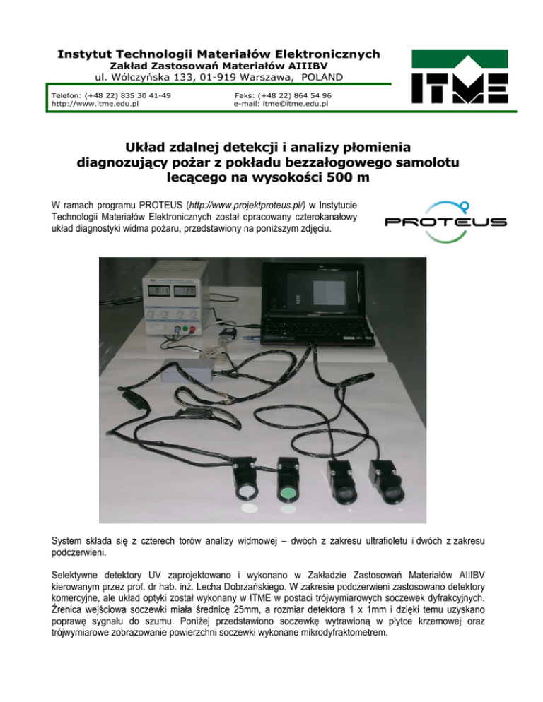 Instytut Technologii Materiałów Elektronicznych Zakład Zastosowań Materiałów AIIIBV ul. Wólczyńska 133, 01-919 Warszawa, POLAND Telefon: (+48 22) 835 30 41-49 http://www.itme.edu.pl Faks: (+48 22) 864 54 96 e-mail: [email protected] Układ zdalnej detekcji i analizy płomienia diagnozujący pożar z pokładu bezzałogowego samolotu lecącego na wysokości 500 m W ramach programu PROTEUS (http://www.projektproteus.pl/) w Instytucie Technologii Materiałów Elektronicznych został opracowany czterokanałowy układ diagnostyki widma pożaru, przedstawiony na poniższym zdjęciu. System składa się z czterech torów analizy widmowej – dwóch z zakresu ultrafioletu i dwóch z zakresu podczerwieni. Selektywne detektory UV zaprojektowano i wykonano w Zakładzie Zastosowań Materiałów AIIIBV kierowanym przez prof. dr hab. inż. Lecha Dobrzańskiego. W zakresie podczerwieni zastosowano detektory komercyjne, ale układ optyki został wykonany w ITME w postaci trójwymiarowych soczewek dyfrakcyjnych. Źrenica wejściowa soczewki miała średnicę 25mm, a rozmiar detektora 1 x 1mm i dzięki temu uzyskano poprawę sygnału do szumu. Poniżej przedstawiono soczewkę wytrawioną w płytce krzemowej oraz trójwymiarowe zobrazowanie powierzchni soczewki wykonane mikrodyfraktometrem. Na poniższym wykresie przedstawiono przykładową analizę płomienia świecy, który zawiera emisję ciała doskonale czarnego (sadza) oraz emisję molekuły CO2. Informacja z czterech torów pomiarowych umożliwia diagnostykę pięciu rodzajów pożaru: • sadza (emisja emisja ciała doskonale czarnego pochodząca od sadzy), • płomień węglowodorów (np. paląca się ropa naftowa) • pożar ``klasyczny`` (palący palący się węgiel lub drewno), • pożar ``chemiczny`` (brak w widmie emisji CO2), • wybuch lub wyładowanie elektryczne. System zdalnej detekcji i analizy pożaru został przetestowany w Centrum Naukowo Badawczym Ochrony O Przeciwpożarowej (CNBOP) i przeszedł pozytywnie badania mechaniczne, mechaniczne klimatyczne, klimatyczne elektromagnetyczne oraz został zakwalifikowany do pierwszej klasy czułości przeciwpożarowej zgodnie z normą PN-EN PN 54. Obecnie system jest integrowany z kamerami wizyjnymi na pokładzie samolotu. ______________________________________________________________________________________ PROJEKT ROJEKT WSPÓŁFINANSOWANY PRZEZ UNIĘ UNI EUROPEJSKĄ EUROPEJSK ZE ŚRODKÓW RODKÓW EUROPEJSKIEGO FUNDUSZU ROZWOJU REGIONALNEGO