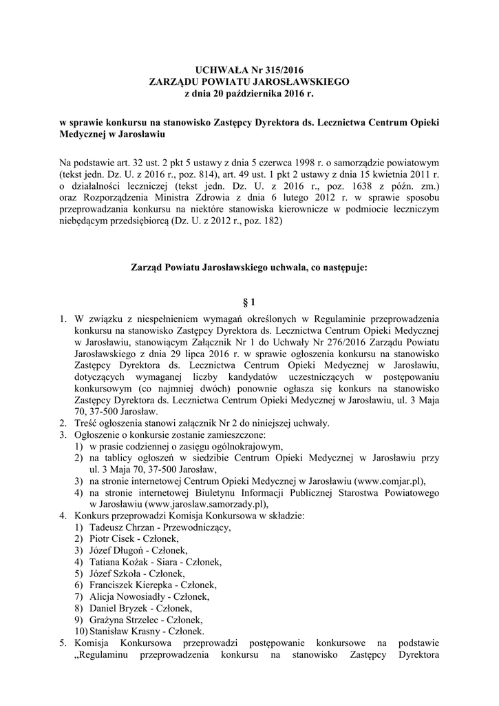 UCHWAŁA Nr 315/2016 ZARZĄDU POWIATU JAROSŁAWSKIEGO z dnia 20 października 2016 r. w sprawie konkursu na stanowisko Zastępcy Dyrektora ds. Lecznictwa Centrum Opieki Medycznej w Jarosławiu Na podstawie art. 32 ust. 2 pkt 5 ustawy z dnia 5 czerwca 1998 r. o samorządzie powiatowym (tekst jedn. Dz. U. z 2016 r., poz. 814), art. 49 ust. 1 pkt 2 ustawy z dnia 15 kwietnia 2011 r. o działalności leczniczej (tekst jedn. Dz. U. z 2016 r., poz. 1638 z późn. zm.) oraz Rozporządzenia Ministra Zdrowia z dnia 6 lutego 2012 r. w sprawie sposobu przeprowadzania konkursu na niektóre stanowiska kierownicze w podmiocie leczniczym niebędącym przedsiębiorcą (Dz. U. z 2012 r., poz. 182) Zarząd Powiatu Jarosławskiego uchwala, co następuje: §1 1. W związku z niespełnieniem wymagań określonych w Regulaminie przeprowadzenia konkursu na stanowisko Zastępcy Dyrektora ds. Lecznictwa Centrum Opieki Medycznej w Jarosławiu, stanowiącym Załącznik Nr 1 do Uchwały Nr 276/2016 Zarządu Powiatu Jarosławskiego z dnia 29 lipca 2016 r. w sprawie ogłoszenia konkursu na stanowisko Zastępcy Dyrektora ds. Lecznictwa Centrum Opieki Medycznej w Jarosławiu, dotyczących wymaganej liczby kandydatów uczestniczących w postępowaniu konkursowym (co najmniej dwóch) ponownie ogłasza się konkurs na stanowisko Zastępcy Dyrektora ds. Lecznictwa Centrum Opieki Medycznej w Jarosławiu, ul. 3 Maja 70, 37-500 Jarosław. 2. Treść ogłoszenia stanowi załącznik Nr 2 do niniejszej uchwały. 3. Ogłoszenie o konkursie zostanie zamieszczone: 1) w prasie codziennej o zasięgu ogólnokrajowym, 2) na tablicy ogłoszeń w siedzibie Centrum Opieki Medycznej w Jarosławiu przy ul. 3 Maja 70, 37-500 Jarosław, 3) na stronie internetowej Centrum Opieki Medycznej w Jarosławiu (www.comjar.pl), 4) na stronie internetowej Biuletynu Informacji Publicznej Starostwa Powiatowego w Jarosławiu (www.jaroslaw.samorzady.pl), 4. Konkurs przeprowadzi Komisja Konkursowa w składzie: 1) Tadeusz Chrzan - Przewodniczący, 2) Piotr Cisek - Członek, 3) Józef Długoń - Członek, 4) Tatiana Kożak - Siara - Członek, 5) Józef Szkoła - Członek, 6) Franciszek Kierepka - Członek, 7) Alicja Nowosiadły - Członek, 8) Daniel Bryzek - Członek, 9) Grażyna Strzelec - Członek, 10) Stanisław Krasny - Członek. 5. Komisja Konkursowa przeprowadzi postępowanie konkursowe na podstawie „Regulaminu przeprowadzenia konkursu na stanowisko Zastępcy Dyrektora ds. Lecznictwa Centrum Opieki Medycznej w Jarosławiu”, stanowiącego załącznik Nr 1 do niniejszej uchwały. §2 Upoważnia się Panią Irenę Stysiał - Głównego księgowego w Centrum Opieki Medycznej w Jarosławiu, do udostępniania kandydatom zgłaszającym się do konkursu na stanowisko Zastępcy Dyrektora ds. Lecznictwa Centrum Opieki Medycznej w Jarosławiu, ul. 3 Maja 70, 37-500 Jarosław materiałów informacyjnych o stanie prawnym, organizacyjnym i ekonomicznym Centrum Opieki Medycznej w Jarosławiu. §3 Na podstawie art. 37 ustawy z dnia 29 sierpnia 1997 r. o ochronie danych osobowych (tekst jedn. Dz. U. z 2016 r., poz. 922), upoważnia się Członków Komisji Konkursowej wymienionych w § 1 ust. 4 oraz protokolanta, do przetwarzania danych osobowych kandydatów na stanowisko Zastępcy Dyrektora ds. Lecznictwa Centrum Opieki Medycznej w Jarosławiu, w ramach konkursu na w/w stanowisko, w czasie niezbędnym do jego rozstrzygnięcia. §4 Wykonanie uchwały powierza się Przewodniczącemu Komisji Konkursowej. §5 Uchwała wchodzi w życie z dniem podjęcia. Przewodniczący Zarządu Powiatu Jarosławskiego Tadeusz Chrzan Załącznik nr 1 do Uchwały Nr 315/2016 Zarządu Powiatu Jarosławskiego z dnia 20 października 2016 r. Regulamin przeprowadzenia konkursu na stanowisko Zastępcy Dyrektora ds. Lecznictwa Centrum Opieki Medycznej w Jarosławiu §1 1. Postępowanie konkursowe na stanowisko Zastępcy Dyrektora ds. Lecznictwa Centrum Opieki Medycznej w Jarosławiu przeprowadza się zgodnie z art. 49 ustawy z dnia 15 kwietnia 2011 r. o działalności leczniczej (tekst jedn. Dz. U. z 2016 r., poz. 1638 z późn. zm.) oraz Rozporządzeniem Ministra Zdrowia z dnia 6 lutego 2012 r. w sprawie przeprowadzenia konkursu na niektóre stanowiska kierownicze w podmiocie leczniczym niebędącym przedsiębiorcą (Dz. U. z 2012 r., poz. 182). 2. Postępowanie konkursowe na stanowisko Zastępcy Dyrektora ds. Lecznictwa Centrum Opieki Medycznej w Jarosławiu przeprowadza Komisja Konkursowa, zwana dalej Komisją, powołana przez Zarząd Powiatu Jarosławskiego Uchwałą Nr 269/2016 Zarządu Powiatu Jarosławskiego z dnia 15 czerwca 2016 r. w sprawie powołania Komisji Konkursowej do przeprowadzenia postępowania konkursowego na stanowisko Zastępcy Dyrektora ds. Lecznictwa Centrum Opieki Medycznej w Jarosławiu, w następującym składzie: 1. Tadeusz Chrzan – przedstawiciel Rady Powiatu Jarosławskiego, przewodniczący Komisji. 2. Piotr Cisek – lekarz – przedstawiciel Rady Powiatu Jarosławskiego, członek Komisji. 3. Józef Długoń – przedstawiciel Rady Powiatu Jarosławskiego, członek Komisji. 4. Tatiana Kożak – Siara – przedstawiciel Rady Powiatu Jarosławskiego, członek Komisji. 5. Józef Szkoła – przedstawiciel Rady Powiatu Jarosławskiego, członek Komisji. 6. Franciszek Kierepka – przedstawiciel Okręgowej Rady Lekarskiej w Krakowie, członek Komisji. 7. Alicja Nowosiadły – przedstawiciel Podkarpackiej Okręgowej Rady Pielęgniarek i Położnych w Przeworsku, członek Komisji. 8. Daniel Bryzek – przedstawiciel zakładowych organizacji związkowych w Centrum Opieki Medycznej w Jarosławiu, członek Komisji. 9. Grażyna Strzelec – przedstawiciel Rady Społecznej Centrum Opieki Medycznej w Jarosławiu, członek Komisji. 10. Stanisław Krasny – Dyrektor Centrum Opieki Medycznej w Jarosławiu, członek Komisji. 3. Do zadań Komisji należy: 1. Opracowanie i przyjęcie regulaminu konkursu. 2. Opracowanie i przyjęcie projektu ogłoszenia o konkursie. 3. Rozpatrzeni