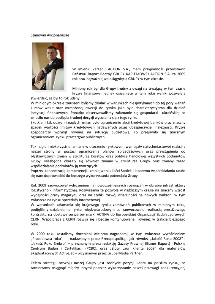 Szanowni Akcjonariusze! W imieniu Zarządu ACTION S.A., mam przyjemność przedstawić Państwu Raport Roczny GRUPY KAPITAŁOWEJ ACTION S.A. za 2009 rok oraz najważniejsze osiągnięcia GRUPY w tym okresie. Miniony rok był dla Grupy trudny z uwagi na trwający w tym czasie kryzys finansowy, jednak osiągnięte w tym roku wyniki pozwalają stwierdzić, że był to rok udany. W minionym okresie zmuszeni byliśmy działać w warunkach niespotykanych do tej pory wahań kursów walut oraz wzmożonej awersji do ryzyka jaka była charakterystyczna dla działań instytucji finansowych. Ponadto obserwowaliśmy załamanie się gospodarki ukraińskiej co zmusiło nas do podjęcia trudnej decyzji wycofania się z tego rynku. Skutkiem tak dużych i nagłych zmian było ograniczenie akcji kredytowej banków oraz znaczny spadek wartości limitów kredytowych nadawanych przez ubezpieczycieli należności. Kryzys gospodarczy wpłynął również na sytuację budżetową, co przejawiło się znacznym ograniczeniem rynku przetargów publicznych. Tak nagłe i niekorzystne zmiany w otoczeniu rynkowym, wymagały natychmiastowej reakcji z naszej strony w postaci ograniczenia planów sprzedażowych oraz przystąpienia do błyskawicznych zmian w strukturze kosztów oraz polityce handlowej wszystkich podmiotów Grupy. Niezbędne okazały się również zmiany w strukturze Grupy oraz zmiany zasad współdziałania podmiotów ją tworzących. Poprzez koncentrację kompetencji, zmniejszeniu ilości Spółek i lepszemu współdziałaniu udało się nam doprowadzić do lepszego wykorzystania potencjału Grupy. Rok 2009 zaowocował wdrożeniem najnowocześniejszych rozwiązań w obrębie infrastruktury logistyczno - informatycznej. Rozwiązania te pozwolą w najbliższym czasie na znaczny wzrost wydajności pracy magazynu oraz na szybki rozwój działalności na nowych rynkach, w tym zwłaszcza na rynku sprzedaży internetowej. W warunkach załamania się krajowego rynku zamówień publicznych w minionym roku, podjęliśmy działania na rynku międzynarodowym co zaowocowało realizacją prestiżowego kontraktu na dostawy serwerów marki ACTINA do Europejskiej Organizacji Badań Jądrowych CERN. Współpraca z CERN rozwija się i będzie kontynuowana również w trakcie bieżącego roku. W 2009 roku zostaliśmy docenieni wieloma nagrodami, w tym zwłaszcza wyróżnieniem „Pracodawca roku” - nadawanym przez Rzeczpospolitą, jak również „Jakość Roku 2008” i „Jakość Roku Srebro” – przyznanym przez redakcję Gazety Prawnej (Biznes Raport) i Polskie Centrum Badań i Certyfikacji (PCBC), oraz „Złoty Laur Klienta 2009” dla materiałów eksploatacyjnych ActiveJet – przyznanym przez Grupę Media Partner. Celem strategii rozwoju naszej Grupy jest zdobycie pozycji lidera na polskim rynku, co zamierzamy osiągnąć między innymi poprzez wykorzystanie naszej przewagi konkurencyjnej wynikającej z istniejącej nowoczesnej infrastruktury logistyczno - informatycznej. Planujemy również w dalszym ciągu rozszerzać zakres prowadzonej działalności poprzez wzrost sprzedaży towarów i usług z innych branż. Podobnie jak do tej pory, będziemy szczególnie mocno rozwijali udział sprzedaży towarów oferowanych pod własnymi markami. W imieniu Zarządu, pragnę jak co roku podziękować wszystkim, którzy przyczynili się do osiągnięcia tak pomyślnych wyników. Ponownie szczególne podziękowania za wysokie zaufanie dla Zarządu ślę pod adresem Akcjonariuszy. Jestem przekonany, że wspólnie działając powtórzymy sukcesy minionego roku. Z poważaniem, Prezes Zarządu Piotr Bieliński
