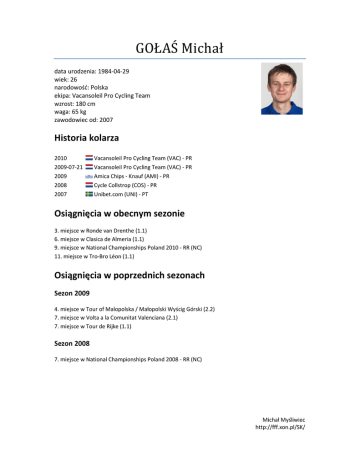 GOŁAŚ Michał data urodzenia: 1984-04-29 wiek: 26 narodowość: Polska ekipa: Vacansoleil Pro Cycling Team wzrost: 180 cm waga: 65 kg zawodowiec od: 2007 Historia kolarza 2010 2009-07-21 2009 2008 2007 Vacansoleil Pro Cycling Team (VAC) - PR Vacansoleil Pro Cycling Team (VAC) - PR Amica Chips - Knauf (AMI) - PR Cycle Collstrop (COS) - PR Unibet.com (UNI) - PT Osiągnięcia w obecnym sezonie 3. miejsce w Ronde van Drenthe (1.1) 6. miejsce sce w Clasica de Almeria (1.1) 9. miejsce w National Championships Poland 2010 - RR (NC) 11. miejsce w Tro-Bro Léon (1.1) Osiągnięcia w poprzednich sezonach Sezon 2009 4. miejsce w Tour of Malopolska / Małopolski Wyścig Górski (2.2) 7. miejsce w Volta a la Comunitat Valenciana (2.1) 7. miejsce w Tour de Rijke (1.1) Sezon 2008 7. miejsce w National Championships Poland 2008 - RR (NC) Michał Myśliwiec http://fff.xon.pl/SK/