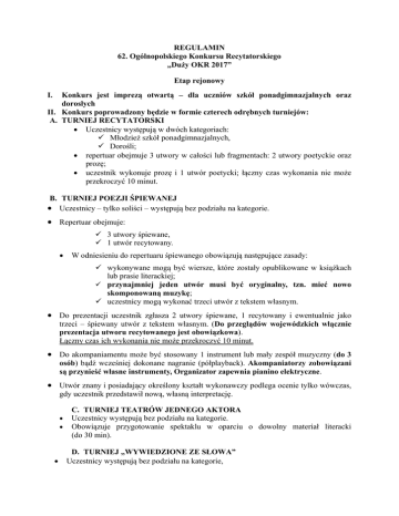 REGULAMIN 62. Ogólnopolskiego Konkursu Recytatorskiego „Duży OKR 2017” Etap rejonowy Konkurs jest imprezą otwartą – dla uczniów szkół ponadgimnazjalnych oraz dorosłych II. Konkurs poprowadzony będzie w formie czterech odrębnych turniejów: A. TURNIEJ RECYTATORSKI • Uczestnicy występują w dwóch kategoriach: Młodzież szkół ponadgimnazjalnych, Dorośli; • repertuar obejmuje 3 utwory w całości lub fragmentach: 2 utwory poetyckie oraz prozę; • uczestnik wykonuje prozę i 1 utwór poetycki; łączny czas wykonania nie może przekroczyć 10 minut. I. B. TURNIEJ POEZJI ŚPIEWANEJ • Uczestnicy – tylko soliści – występują bez podziału na kategorie. • Repertuar obejmuje: 3 utwory śpiewane, 1 utwór recytowany. • W odniesieniu do repertuaru śpiewanego obowiązują następujące zasady: wykonywane mogą być wiersze, które zostały opublikowane w książkach lub prasie literackiej; przynajmniej jeden utwór musi być oryginalny, tzn. mieć nowo skomponowaną muzykę; uczestnicy mogą wykonać trzeci utwór z tekstem własnym. • Do prezentacji uczestnik zgłasza 2 utwory śpiewane, 1 recytowany i ewentualnie jako trzeci – śpiewany utwór z tekstem własnym. (Do przeglądów wojewódzkich włącznie prezentacja utworu recytowanego jest obowiązkowa). Łączny czas ich wykonania nie może przekroczyć 10 minut. • Do akompaniamentu może być stosowany 1 instrument lub mały zespół muzyczny (do 3 osób) bądź wcześniej dokonane nagranie (półplayback). Akompaniatorzy zobowiązani są przynieść własne instrumenty, Organizator zapewnia pianino elektryczne. • Utwór znany i posiadający określony kształt wykonawczy podlega ocenie tylko wówczas, gdy uczestnik przedstawił nową, własną interpretację. • • • C. TURNIEJ TEATRÓW JEDNEGO AKTORA Uczestnicy występują bez podziału na kategorie. Obowiązuje przygotowanie spektaklu w oparciu o dowolny materiał literacki (do 30 min). D. TURNIEJ „WYWIEDZIONE ZE SŁOWA” Uczestnicy występują bez podziału na kategorie, • repertuar jest dowolny (np. wiersz lub jego fragment, monolog literacki, collage tekstów); • dowolna forma prezentacji (np. teatr jednego wiersza, łączenie słowa mówionego ze śpiewem, z dźwiękiem, ruchem, rekwizytem); • czas występu nie może przekroczyć 7 minut. III. Warunki uczestnictwa: • Przygotowanie interpretacji repertuaru lub zrealizowanie monodramu – którego uczestnik nie prezentował w poprzednich latach bądź innych konkursach; • Zgłoszenie poprzez złożenie wypełnionej karty zgłoszenia w poniżej podanym terminie we wskazanej placówce kulturalno-oświatowej; w szkołach. IV. Sądy konkursowe. 1. Do oceny wykonawców powołane zostaną przez organizatorów przeglądów Sądy Konkursowe, właściwe dla stopnia przeglądu. 2. W skład Sądów wchodzą fachowcy z dziedziny recytacji, kultury mowy, literatury, reżyserii oraz muzyki. 3. W skład Sądów stopnia wojewódzkiego powinni wejść: • przedstawiciel organizatorów przeglądów niższego stopnia; • przedstawiciel krajowego komitetu organizacyjnego. 4. Nie mogą być jurorami: a. wykonawcy uczestniczący w Konkursie; b. instruktorzy – w przeglądzie, w którym biorą udział ich recytatorzy. 5. Sądy Konkursowe dokonują oceny wg następujących kryteriów: • dobór repertuaru (wartości artystyczne utworów oraz ich dobór do możliwości wykonawczych uczestnika); • interpretacja utworów; • kultura słowa; • ogólny wyraz artystyczny. W turnieju wywiedzione ze słowa Sądy Konkursowe uwzględnią ponadto: • celowość użycia środków pozasłownych (np. kostiumu, dźwięku, elementów scenografii i innych) wspomagających interpretację; • kompozycję sceniczną występu. W turnieju teatrów jednego aktora Sądy Konkursowe uwzględnią również: • opracowanie dramaturgiczne; • opracowanie reżyserskie; • wykonanie zadań aktorskich; • pozasłowne elementy spektaklu – scenografia, muzyka. W turnieju poezji śpiewanej Sądy Konkursowe uwzględnią także: • zgodność muzyki z charakterem wiersza; • muzykalność i warunki głosowe wykonawcy; • wartości artystyczne muzyki. 6. Podstawą do sformułowania werdyktu jest wysłuchanie przez każdego członka Sądu Konkursowego – wszystkich uczestników przeglądu. 7. Ostateczny werdykt jest ustalany w drodze wspólnej dyskusji członków Sądu Konkursowego. W przypadku równego podziału głosów, rozstrzyga głos przewodniczącego. 8. Decyzja Sądu jest ostateczna. 9. Sąd konkursowy ma obowiązek uzasadnienia werdyktu ogólnego. 10.Uczestnicy mają prawo zwracania się do Sądu Konkursowego o uzasadnienie oceny swojej prezentacji. V. Konkurs prowadzony jest w drodze wielostopniowych przeglądów: • środowiskowych, miejskich, gminnych; • powiatowych i/lub rejonowych – wg ustalenia wojewódzkiego organizatora konkursu; • wojewódzkich - powinny zakończyć się nie później niż 7 maja 2017r.; • spotkań finałowych. VI. Etap rejonowy odbędzie się na sali widowiskowej Powiatowego Centrum Kultury w Strzelcach Opolskich (ul. Dworcowa 23, 47-100 Strzelce Opolskie) w dniu 6.04.2017 r. (czwartek). VII. Zgłoszenia przyjmowane będą do dnia 28.03.2017 r. (wtorek). w Powiatowym Centrum Kultury w Strzelcach Opolskich (ul. Dworcowa 23, 47-100 Strzelce Opolskie). Harmonogram poszczególnych turniejów zostanie opublikowany dnia 31.03.2017 r. na stronie internetowej PCK (www.centrum-kultury.eu). Listy startowe Organizator wywiesi w dniu konkursu. VIII. Interpretacja Regulaminu przysługuje Organizatorowi. IX. Informacje uzupełniające Spotkania Finałowe odbędą się: • turniej poezji śpiewanej – 06 – 10 czerwca 2017 roku we Włocławku; • turniej teatrów jednego aktora – 15 – 18 czerwca 2017 roku w Słupsku; • turnieje recytatorski i wywiedzione ze słowa – 21 – 24 czerwca 2017 roku w Ostrołęce.