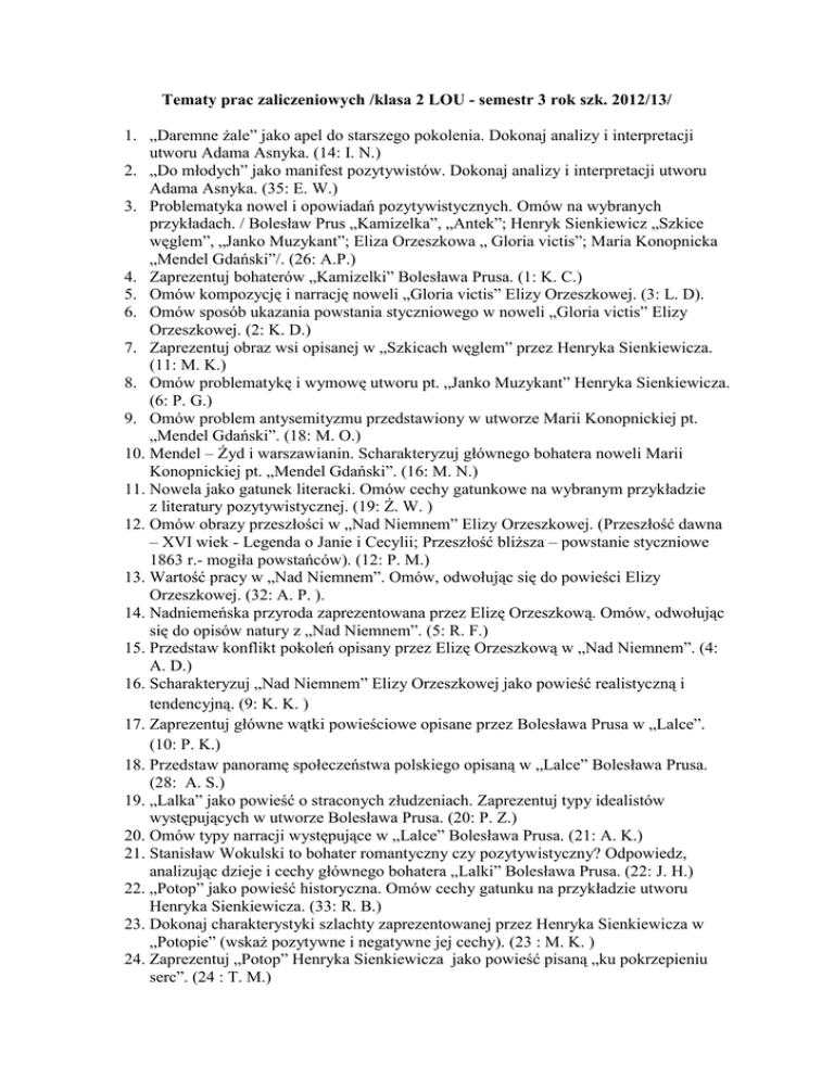 Tematy prac zaliczeniowych /klasa 2 LOU - semestr 3 rok szk. 2012/13/ 1. „Daremne żale” jako apel do starszego pokolenia. Dokonaj analizy i interpretacji utworu Adama Asnyka. (14: I. N.) 2. „Do młodych” jako manifest pozytywistów. Dokonaj analizy i interpretacji utworu Adama Asnyka. (35: E. W.) 3. Problematyka nowel i opowiadań pozytywistycznych. Omów na wybranych przykładach. / Bolesław Prus „Kamizelka”, „Antek”; Henryk Sienkiewicz „Szkice węglem”, „Janko Muzykant”; Eliza Orzeszkowa „ Gloria victis”; Maria Konopnicka „Mendel Gdański”/. (26: A.P.) 4. Zaprezentuj bohaterów „Kamizelki” Bolesława Prusa. (1: K. C.) 5. Omów kompozycję i narrację noweli „Gloria victis” Elizy Orzeszkowej. (3: L. D). 6. Omów sposób ukazania powstania styczniowego w noweli „Gloria victis” Elizy Orzeszkowej. (2: K. D.) 7. Zaprezentuj obraz wsi opisanej w „Szkicach węglem” przez Henryka Sienkiewicza. (11: M. K.) 8. Omów problematykę i wymowę utworu pt. „Janko Muzykant” Henryka Sienkiewicza. (6: P. G.) 9. Omów problem antysemityzmu przedstawiony w utworze Marii Konopnickiej pt. „Mendel Gdański”. (18: M. O.) 10. Mendel – Żyd i warszawianin. Scharakteryzuj głównego bohatera noweli Marii Konopnickiej pt. „Mendel Gdański”. (16: M. N.) 11. Nowela jako gatunek literacki. Omów cechy gatunkowe na wybranym przykładzie z literatury pozytywistycznej. (19: Ż. W. ) 12. Omów obrazy przeszłości w „Nad Niemnem” Elizy Orzeszkowej. (Przeszłość dawna – XVI wiek - Legenda o Janie i Cecylii; Przeszłość bliższa – powstanie styczniowe 1863 r.- mogiła powstańców). (12: P. M.) 13. Wartość pracy w „Nad Niemnem”. Omów, odwołując się do powieści Elizy Orzeszkowej. (32: A. P. ). 14. Nadniemeńska przyroda zaprezentowana przez Elizę Orzeszkową. Omów, odwołując się do opisów natury z „Nad Niemnem”. (5: R. F.) 15. Przedstaw konflikt pokoleń opisany przez Elizę Orzeszkową w „Nad Niemnem”. (4: A. D.) 16. Scharakteryzuj „Nad Niemnem” Elizy Orzeszkowej jako powieść realistyczną i tendencyjną. (9: K. K. ) 17. Zaprezentuj główne wątki powieściowe opisane przez Bolesława Prusa w „Lalce”. (10: P. K.) 18. Przedstaw panoramę społeczeństwa polskiego opisaną w „Lalce” Bolesława Prusa. (28: A. S.) 19. „Lalka” jako powieść o straconych złudzeniach. Zaprezentuj typy idealistów występujących w utworze Bolesława Prusa. (20: P. Z.) 20. Omów typy narracji występujące w „Lalce” Bolesława Prusa. (21: A. K.) 21. Stanisław Wokulski to bohater romantyczny czy pozytywistyczny? Odpowiedz, analizując dzieje i cechy głównego bohatera „Lalki” Bolesława Prusa. (22: J. H.) 22. „Potop” jako powieść historyczna. Omów cechy gatunku na przykładzie utworu Henryka Sienkiewicza. (33: R. B.) 23. Dokonaj charakterystyki szlachty zaprezentowanej przez Henryka Sienkiewicza w „Potopie” (wskaż pozytywne i negatywne jej cechy). (23 : M. K. ) 24. Zaprezentuj „Potop” Henryka Sienkiewicza jako powieść pisaną „ku pokrzepieniu serc”. (24 : T. M.) 25. Opisz przebieg wątku romansowo – przygodowego w „Potopie” Henryka Sienkiewicza. (25: N. P.) 26. Czy Kmicica można uznać za bohatera romantycznego? Odpowiedz, śledząc losy i analizując cechy tej postaci z „Potopu” Henryka Sienkiewicza. (27: P. R.) 27. Omów problem gatunku i kompozycję „Potopu” Henryka Sienkiewicza. (29: J. Sz.) 28. Dlaczego Raskolnikow zabił? Odpowiedz, analizując motywy postępowania bohatera „Zbrodni i kary” Fiodora Dostojewskiego. (30 : M. S. ) 29. „Zbrodnia i kara” jako powieść polifoniczna. Omów zagadnienie na podstawie powieści Fiodora Dostojewskiego. (13: J. M.) 30. Przedstaw wizję Petersburga zaprezentowaną w powieści Fiodora Dostojewskiego „Zbrodnia i kara”. (31: A. D.) 31. Opisz wątek miłości Soni i Raskolnikowa. (Fiodor Dostojewski „Zbrodnia i kara”). (34: D. B. ) 32. Dokonaj analizy i interpretacji „Roty” Marii Konopnickiej. (7: E. G.) 33. Jakie problemy społeczne zostały przedstawione w wierszu pt. „Wolny najmita”? Zinterpretuj i zanalizuj wiersz Marii Konopnickiej. (36: R. L.) 34. Henryk Sienkiewicz – polski Noblista. Zaprezentuj dorobek literacki tego pisarza.(15: J. N.) 35. Bolesław Prus – wielki prozaik okresu pozytywizmu. Zaprezentuj dorobek literacki tego pisarza. (8. M. H.) 36. Zaprezentuj dorobek pisarski Elizy Orzeszkowej. (17: R. O.)