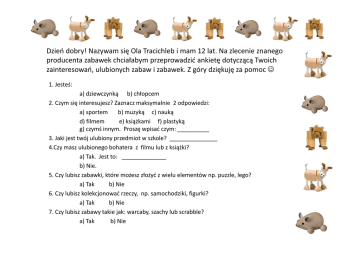 Dzień dobry! Nazywam się Ola Tracichleb i mam 12 lat. Na zlecenie znanego producenta zabawek chciałabym przeprowadzić ankietę dotyczącą Twoich zainteresowań, ulubionych zabaw i zabawek. Z góry dziękuję za pomoc ☺ 1. Jesteś: a) dziewczynką b) chłopcem 2. Czym się interesujesz? Zaznacz maksymalnie 2 odpowiedzi: a) sportem b) muzyką c) nauką d) filmem e) książkami f) plastyką g) czymś innym. Proszę wpisać czym: __________ 3. Jaki jest twój ulubiony przedmiot w szkole? _______________ 4.Czy masz ulubionego bohatera z filmu lub z książki? a) Tak. Jest to: ______________ b) Nie. 5. Czy lubisz zabawki, które możesz złożyć z wielu elementów np. puzzle, lego? a) Tak b) Nie 6. Czy lubisz kolekcjonować rzeczy, np. samochodziki, figurki? a) Tak b) Nie 7. Czy lubisz zabawy takie jak: warcaby, szachy lub scrabble? a) Tak b) Nie 8. Gdzie trzymasz drobiazgi? a) W pudełkach, w większych pojemnikach. b) W szufladkach, na półkach. c) Gdzie popadnie. 9. Wolisz spędzać swój wolny czas: a) Samemu. b) Z kolegami/koleżankami. 10. Czy masz ulubioną zabawkę? a) Tak. Jest to : _________________ b) Nie. 11. Lubisz zajęcia, które wymagają Twojej kreatywności np. zajęcia plastyczne, zajęcia techniczne? a) Tak. b) Nie 12. Mój ulubiony kolor to: ____________________ 13. Zabawki najczęściej kupuję w: a) Galerii handlowej (Plaza, Felicity) b) Przez internet c) W supermarketach d) W dużych sklepach z zabawkami (np. Smyk) 14. Jeśli mógłbyś/mogłabyś wybrać swój prezent bożonarodzeniowy, byłby to… ( proszę NIE wpisywać elektronicznych gadżetów ) _________________________ DZIĘKUJĘ! Grafika - Źródło www.penny.pl, www.pieluszki-ekologiczne.pl, www.domoswera.pl