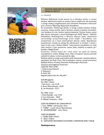 WSPÓLNIE BAWILIŚMY SIĘ NA ŚNIEGU PODCZAS RODZINNEGO PIKNIKU W WIEŻYCY data: 2014-02-20 Rodzinne Walentynki trwale wpiszą się w kalendarz imprez w naszym powiecie. Wyśmienicie bawili się wszyscy, którzy znaleźli czas, aby skorzystać z szeregu atrakcji przygotowanych przez Starostwo Powiatowe w Kartuzach wraz z Centrum Aktywnego Wypoczynku Koszałkowo. Na uczestników I Rodzinnego pikniku na śniegu czekało mnóstwo atrakcji: muzyczny, zimowy aerobik, zjazd z bananem, zawody w slalomie narciarskim, rzut śnieżkami do celu, konkurs lepienia bałwanów. Podczas festynu można było również skorzystać z porad kardiologicznych NZOZ Neptun - Oddziału Rehabilitacji Kardiologicznej w Wieżycy, obejrzeć pokaz ratownictwa narciarskiego przeprowadzonego przez zespół z Koszałkowa oraz zarejestrować się w bazie potencjalnych dawców szpiku. Największym powodzeniem cieszyły się wyścigi dla zakochanych na workach z sianem i zjazd na byle czym z Radiem Gdańsk. Tutaj inwencja zawodników nie miała sobie równych. Z góry zjechał koń, wanna, łóżko, wielebny na sedesie, jak i kociołek z Magdą Gessler. Uczestnicy, zarówno dzieci jak i nieco starsi, nie oparli się również niewątpliwemu urokowi Białego misia. Pełen entuzjazmu śnieżny puchatek zachęcał do zabawy i ochoczo pozował do zdjęć. Rodzinny piknik na śniegu poprowadził Jarek Janiszewski, natomiast gościem specjalnym był Paolo Cozza. Nad przebiegiem imprezy czuwali pracownicy Wydziału Kultury i Promocji Starostwa Powiatowego w Kartuzach. Zwycięzcy poszczególnych konkursów: ZJAZD NA "BYLE CZYM": I. Stadnina koni Kolano!!! II. Radiowóz!! III. Piofil 102! Nagroda publiczności dla „Muszelki” SLALOM (gigant): Kat. 2001 i młodsi: I. Nina Arcisz - czas 21,40 II. Bruno Wojciechowski - 22,93 III. Jan Koszowski - 23,27 Kat. 2000 i starsi: I. Paweł Koszałka - czas 17,02 II. Irena Hołczubiec - 18,04 III. Mikołaj Frankiewicz - 18,45 ZJAZD NA WORKACH DLA ZAKOCHANYCH: I. Team "PARKA" czyli Krzysiek i Artur II. "TURBO" - Leszek i Bruno Wojciechowscy III. "WEJHEROWIANIE" - Ania i Stasiu ZJAZD NA BANANIE: I. "TURBO TEAM" 0:44,53 II. "JALILI" 0:48,01 III. "ZRZESZENIE KASZUBSKICH KUCZERÓW I HODOWCÓW KONI" 0:48,08 Współorganizatorzy: Radio Gdańsk Fundacja DKMS Szkoła Narciarska Mixtura NZOZ Neptun - Oddział Rehabilitacji Kardiologicznej w Wieżycy Zrzeszenie Kaszubskich Kuczerów i Hodowców Koni - Piotr Kupper PIKNIK NA ŚNIEGU data publikacji: 2014-02-20 .