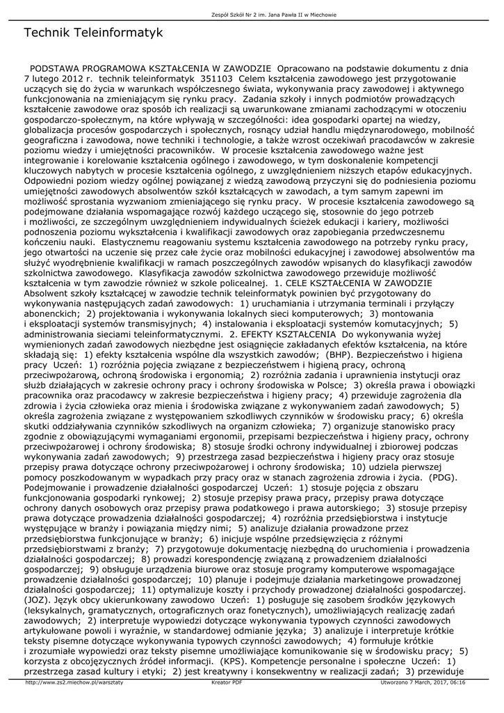 Zespół Szkół Nr 2 im. Jana Pawła II w Miechowie Technik Teleinformatyk PODSTAWA PROGRAMOWA KSZTAŁCENIA W ZAWODZIE Opracowano na podstawie dokumentu z dnia 7 lutego 2012 r. technik teleinformatyk 351103 Celem kształcenia zawodowego jest przygotowanie uczących się do życia w warunkach współczesnego świata, wykonywania pracy zawodowej i aktywnego funkcjonowania na zmieniającym się rynku pracy. Zadania szkoły i innych podmiotów prowadzących kształcenie zawodowe oraz sposób ich realizacji są uwarunkowane zmianami zachodzącymi w otoczeniu gospodarczo-społecznym, na które wpływają w szczególności: idea gospodarki opartej na wiedzy, globalizacja procesów gospodarczych i społecznych, rosnący udział handlu międzynarodowego, mobilność geograficzna i zawodowa, nowe techniki i technologie, a także wzrost oczekiwań pracodawców w zakresie poziomu wiedzy i umiejętności pracowników. W procesie kształcenia zawodowego ważne jest integrowanie i korelowanie kształcenia ogólnego i zawodowego, w tym doskonalenie kompetencji kluczowych nabytych w procesie kształcenia ogólnego, z uwzględnieniem niższych etapów edukacyjnych. Odpowiedni poziom wiedzy ogólnej powiązanej z wiedzą zawodową przyczyni się do podniesienia poziomu umiejętności zawodowych absolwentów szkół kształcących w zawodach, a tym samym zapewni im możliwość sprostania wyzwaniom zmieniającego się rynku pracy. W procesie kształcenia zawodowego są podejmowane działania wspomagające rozwój każdego uczącego się, stosownie do jego potrzeb i możliwości, ze szczególnym uwzględnieniem indywidualnych ścieżek edukacji i kariery, możliwości podnoszenia poziomu wykształcenia i kwalifikacji zawodowych oraz zapobiegania przedwczesnemu kończeniu nauki. Elastycznemu reagowaniu systemu kształcenia zawodowego na potrzeby rynku pracy, jego otwartości na uczenie się przez całe życie oraz mobilności edukacyjnej i zawodowej absolwentów ma służyć wyodrębnienie kwalifikacji w ramach poszczególnych zawodów wpisanych do klasyfikacji zawodów szkolnictwa zawodowego. Klasyfikacja zawodów szkolnictwa zawodowego przewiduje możliwość kształcenia w tym zawodzie również w szkole policealnej. 1. CELE KSZTAŁCENIA W ZAWODZIE Absolwent szkoły kształcącej w zawodzie technik teleinformatyk powinien być przygotowany do wykonywania następujących zadań zawodowych: 1) uruchamiania i utrzymania terminali i przyłączy abonenckich; 2) projektowania i wykonywania lokalnych sieci komputerowych; 3) montowania i eksploatacji systemów transmisyjnych; 4) instalowania i eksploatacji systemów komutacyjnych; 5) administrowania sieciami teleinformatycznymi. 2. EFEKTY KSZTAŁCENIA Do wykonywania wyżej wymienionych zadań zawodowych niezbędne jest osiągnięcie zakładanych efektów kształcenia, na które składają się: 1) efekty kształcenia wspólne dla wszystkich zawodów; (BHP). Bezpieczeństwo i higiena pracy Uczeń: 1) rozróżnia pojęcia związane z bezpieczeństwem i higieną pracy, ochroną przeciwpożarową, ochroną środowiska i ergonomią; 2) rozróżnia zadania i uprawnienia instytucji oraz służb działających w zakresie ochrony pracy i ochrony środowiska w Polsce; 3) określa prawa i obowiązki pracownika oraz pracodawcy w zakresie bezpieczeństwa i higieny pracy; 4) przewiduje zagrożenia dla zdrowia i życia człowieka oraz mienia i środowiska związane z wykonywaniem zadań zawodowych; 5) określa zagrożenia związane z występowaniem szkodliwych czynników w środowisku pracy; 6) określa skutki oddziaływania czynników szkodliwych na organizm człowieka; 7) organizuje stanowisko pracy zgodnie z obowiązującymi wymaganiami ergonomii, przepisami bezpieczeństwa i higieny pracy, ochrony przeciwpożarowej i ochrony środowiska; 8) stosuje środki ochrony indywidualnej i zbiorowej podczas wykonywania zadań zawodowych; 9) przestrzega zasad bezpieczeństwa i higieny pracy oraz stosuje przepisy prawa dotyczące ochrony przeciwpożarowej i ochrony środowiska; 10) udziela pierwszej pomocy poszkodowanym w wypadkach przy pracy oraz w stanach zagrożenia zdrowia i życia. (PDG). Podejmowanie i prowadzenie działalności gospodarczej Uczeń: 1) stosuje pojęcia z obszaru funkcjonowania gospodarki rynkowej; 2) stosuje przepisy prawa pracy, przepisy prawa dotyczące ochrony danych osobowych oraz przepisy prawa podatkowego i prawa autorskiego; 3) stosuje przepisy prawa dotyczące prowadzenia działalności gospodarczej; 4) rozróżnia przedsiębiorstwa i instytucje występujące w branży i powiązania między nimi; 5) analizuje działania prowadzone przez przedsiębiorstwa funkcjonujące w branży; 6) inicjuje wspólne przedsięwzięcia z różnymi przedsiębiorstwami z branży; 7) przygotowuje dokumentację niezbędną do uruchomienia i prowadzenia działalności gospodarczej; 8) prowadzi korespondencję związaną z prowadzeniem działalności gospodarczej; 9) obsługuje urządzenia biurowe oraz stosuje programy komputerowe wspomagające prowadzenie działalności gospodarczej; 10) planuje i podejmuje działania marketingowe prowadzonej działalności gospodarczej; 11) optymalizuje koszty i przychody prowadzonej działalności gospodarczej. (JOZ). Język obcy ukierunkowany zawodowo Uczeń: 1) posługuje się zasobem środków językowych (leksykalnych, gramatycznych, ortograficznych oraz fonetycznych), umożliwiających realizację zadań zawodowych; 2) interpretuje wypowiedzi dotyczące wykonywania typowych czynności zawodowych artykułowane powoli i wyraźnie, w standardowej odmianie języka; 3) analizuje i interpretuje krótkie teksty pisemne dotyczące wykonywania typowych czynności zawodowych; 4) formułuje krótkie i zrozumiałe wypowiedzi oraz teksty pisemne umożliwiające komunikowanie się w środowisku pracy; 5) korzysta z obcojęzycznych źródeł informacji. (KPS). Kompetencje personalne i społeczne Uczeń: 1) przestrzega zasad kultury i etyki; 2) jest kre