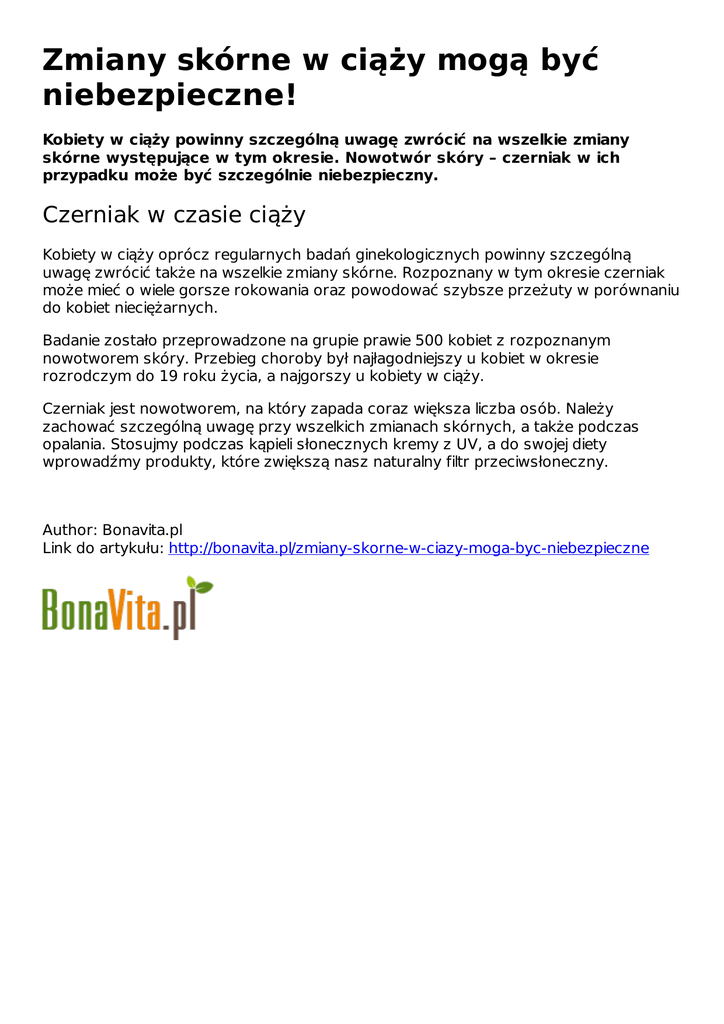 Zmiany skórne w ciąży mogą być niebezpieczne! Kobiety w ciąży powinny szczególną uwagę zwrócić na wszelkie zmiany skórne występujące w tym okresie. Nowotwór skóry – czerniak w ich przypadku może być szczególnie niebezpieczny. Czerniak w czasie ciąży Kobiety w ciąży oprócz regularnych badań ginekologicznych powinny szczególną uwagę zwrócić także na wszelkie zmiany skórne. Rozpoznany w tym okresie czerniak może mieć o wiele gorsze rokowania oraz powodować szybsze przeżuty w porównaniu do kobiet nieciężarnych. Badanie zostało przeprowadzone na grupie prawie 500 kobiet z rozpoznanym nowotworem skóry. Przebieg choroby był najłagodniejszy u kobiet w okresie rozrodczym do 19 roku życia, a najgorszy u kobiety w ciąży. Czerniak jest nowotworem, na który zapada coraz większa liczba osób. Należy zachować szczególną uwagę przy wszelkich zmianach skórnych, a także podczas opalania. Stosujmy podczas kąpieli słonecznych kremy z UV, a do swojej diety wprowadźmy produkty, które zwiększą nasz naturalny filtr przeciwsłoneczny. Author: Bonavita.pl Link do artykułu: http://bonavita.pl/zmiany-skorne-w-ciazy-moga-byc-niebezpieczne