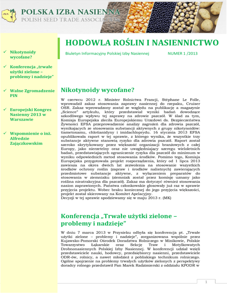 HODOWLA ROŚLIN I NASIENNICTWO Nikotynoidy wycofane? Biuletyn Informacyjny Polskiej Izby Nasiennej NUMER 1 /2013 Konferencja „trwałe użytki zielone – problemy i nadzieje” Walne Zgromadzenie PIN Europejski Kongres Nasienny 2013 w Warszawie Wspomnienie o inż. Alfredzie Zajączkowskim Nikotynoidy wycofane? W czerwcu 2012 r. Minister Rolnictwa Francji, Stéphane Le Folle, wprowadził zakaz stosowania zaprawy nasiennej do rzepaku, Cruiser OSR. Zakaz wprowadzony został ze względu na publikację a magazynie „Science” artykułu, który przedstawiał wyniki badań dowodzące szkodliwego wpływu tej zaprawy na zdrowie pszczół. W ślad za tym, Komisja Europejska zleciła Europejskiemu Urzędowi ds. Bezpieczeństwa Żywności EFSA przeprowadzenie analizy zagrożeń dla zdrowia pszczół, wynikających ze stosowania substancji aktywnych z grupy nikotynoidów: tiametoxamu, chlotianidyny i imidachloprydu. 16 stycznia 2013 EFSA opublikowała raport w tej sprawie, z którego wynika, że wszystkie trzy substancje aktywne stanowią ryzyko dla zdrowia pszczół. Raport został szeroko skrytykowany przez większość organizacji branżowych z całej Europy, jako nierzetelny oraz nie uwzględniający szeregu wieloletnich badań, przedstawiających ograniczenie ryzyka dla pszczół do minimum w wyniku odpowiednich metod stosowania środków. Pomimo tego, Komisja Europejska przygotowała projekt rozporządzenia, który od 1 lipca 2013 zawiesza na okres dwóch lat zezwolenia na stosowanie wszystkich środków ochrony roślin (zapraw i środków nalistnych) zawierających przedmiotowe substancje aktywne, z wyłączeniem preparatów do stosowania w ziemniaku (ziemniak został przez komisję uznany jako roślina nieatrakcyjna dla pszczół). Zakaz ma dotyczyć również stosowania nasion zaprawionych. Państwa członkowskie głosowały już raz w sprawie przyjęcia projektu. Wobec braku koniecznej do jego przyjęcia większości, projekt został skierowany na Komitet Apelacyjny. Decyzji w tej sprawie spodziewamy się w maju 2013 r. (MK) Konferencja „Trwałe użytki zielone – problemy i nadzieje” W dniu 7 marca 2013 w Przysieku odbyła się konferencja pt. „Trwałe użytki zielone – problemy i nadzieje”, zorganizowana wspólnie przez Kujawsko-Pomorski Ośrodek Doradztwa Rolniczego w Minikowie, Polskie Towarzystwo Łąkarskie oraz Sekcję Traw i Motylkowatych Drobnonasiennych Polskiej Izby Nasiennej. W konferencji udział wzięli przedstawiciele nauki, hodowcy, przedsiębiorcy nasienni, przedstawiciele ODR-ów, rolnicy, a nawet młodzież z pobliskiego technikum rolniczego. Ogólne spojrzenie na problemy trwałych użytków zielonych z perspektywy doradcy rolnego przedstawił Pan Marek Radzimierski z oddziału KPODR w 1 Przysieku. Współczesne problemy łąkarstwa w świetle 24. Kongresu Europejskiej Federacji Łąkarskiej omówił prof. dr hab. Piotr Goliński z Katedry Łąkarstwa UP w Poznaniu. Rolę i możliwości wykorzystania białka z TUZ w żywieniu zwierząt zaprezentował prof. dr hab. Jan Mikołajczak z Katedry Żywienia Zwierząt i Gospodarki Paszowej UTP w Bydgoszczy. Potencjał produkcyjny łąk i pastwisk – możliwości i zagrożenia – zaprezentował prof. dr hab. Roman Łyszczarz z Wydziału Rolnictwa i Biotechnologii UTP w Bydgoszczy. Forum dyskusyjne poprowadził prof. dr hab. Stanisław Kozłowski z Katedry łąkarstwa UP w Poznaniu. Kolejna konferencja tematyczna organizowana przez Sekcję Traw i Motylkowatych Drobnonasiennych PIN odbędzie się 6 czerwca br. w Peplinie. (MK) Fot.: L. Chmielnicki Walne Zgromadzenie PIN W dniach 25 – 26 kwietnia 2013 odbędzie się Walne Zgromadzenie Polskiej Izby Nasiennej. W części otwartej będzie można wysłuchać prezentacji zaproszonych gości krajowych i zagranicznych. Pierwszym z nich będzie Sekretarz Generalny European Seed Association (ESA), Pan Garlich von Essen, który przedstawi funkcjonowanie Europejskiego Systemu jakości Kontroli Zaprawiania. System jest dobrowolny, na chwilę obecną przystąpiły do niego pierwsze przedsiębiorstwa. Wystąpienie będzie tym ciekawsze, że odbywa się podczas trwającej w całej Europie dyskusji na temat zagrożeń jakie stwarzają dla zdrowia pszczół substancje aktywne z grupy neonikotynoidów zawarte w zaprawach. Zagrożenia te można 2 całkowicie wyeliminować właśnie dzięki poprawie jakości zaprawiania. Kolejnym ważnym dla branży tematem są ostatnie zmiany w krajowym prawie nasiennym, które omówi Pan Adam Wąsik z Głównego Inspektoratu Ochrony Roślin i Nasiennictwa. Pani Jolanta Wyszatkiewicz z Ministerstwa Rolnictwa i Rozwoju Wsi wskaże kierunki w których zmierza unijne prawodawstwo nasienne czyli jak będzie wyglądała przyszłość branży. Na zakończenie Pani Katharina Bednarz z ESA przekaże informacje i zachęci uczestników do wzięcia udziału w Europejskim kongresie Nasiennym, o którym piszemy niżej. (MK) Europejski Kongres Nasienny w 2013 w Warszawie W dniach 13 – 15 października 2013 w Warszawie odbędzie się doroczny Kongres nasienny organizowany przez European Seed Association. W Polsce gościć będą przedstawiciele branży hodowlano nasiennej nie tylko z Europy, ale również z innych kontynentów. W zeszłorocznym kongresie wzięło udział ponad 750 uczestników. Już dzisiaj serdecznie zachęcamy państwa do skorzystania z okazji i wzięcia udziału w jednych z największych targach nasiennych na świecie. Program, ofertę wynajmu stolików handlowych oraz możliwość zgłoszenia uczestnictwa znajdą Państwo na stronie internetowej http://esa.conceptum.eu/ (MK) Wspomnienie o inż. Alfredzie Zajączkowskim W dniu 31 grudnia 2011 zmarł w Kluczborku Alfred Zajączkowski. Inżynier Alfred Zajączkowski urodził się 25.01.1927 r. w Jezierzanach pow. Tłumocz w woj. Stanisławowskim – na pięknych terenach Kresów. Był jedynakiem. Jego dziadek i ojciec byli dróżnikami i rolnikami. Matka była krawcową. Tam chodził do szkoł