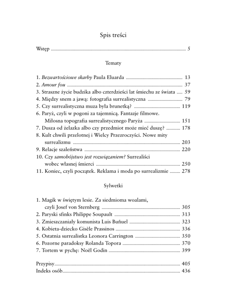 Spis treści Wstęp ..................................................................................................................... 5 Tematy 1. Bezwartościowe skarby Paula Eluarda .................................................. 13 2. Amour fou ..................................................................................................... 37 3. Straszne życie budzika albo czterdzieści lat śmiechu ze świata . .... 59 4. Między snem a jawą: fotografia surrealistyczna ............................... 79 5. Czy surrealistyczna muza była brunetką? ......................................... 119 6. Paryż, czyli w pogoni za tajemnicą. Fantazje filmowe. Miłosna topografia surrealistycznego Paryża ................................ 151 7. Dusza od żelazka albo czy przedmiot może mieć duszę? ............. 178 8. Kult chwili przelotnej i Wielcy Przezroczyści. Nowe mity surrealizmu .............................................................................................. 203 9. Relacje szaleństwa .................................................................................... 220 10. Czy samobójstwo jest rozwiązaniem? Surrealiści wobec własnej śmierci .......................................................................... 250 11. Koniec, czyli początek. Reklama i moda po surrealizmie ......... 278 Sylwetki 1. Magik w świętym lesie. Za siedmioma woalami, czyli Josef von Sternberg ..................................................................... 2. Paryski sfinks Philippe Soupault .......................................................... 3. Zmieszczaniały komunista Luis Buñuel . ........................................... 4. Kobieta-dziecko Gisèle Prassinos ........................................................ 5. Ostatnia surrealistka Leonora Carrington ........................................ 6. Pozorne paradoksy Rolanda Topora .................................................. 7. Tortem w pychę: Noël Godin .............................................................. 305 313 323 336 350 370 399 Przypisy............................................................................................................. 405 Indeks osób...................................................................................................... 436