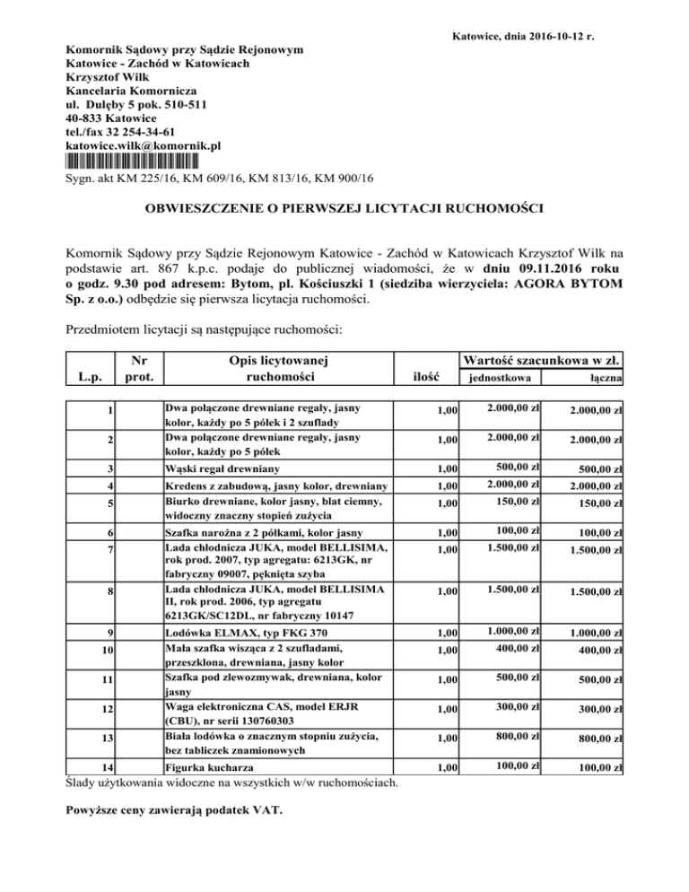 Katowice, dnia 2016-10-12 r. Komornik Sądowy przy Sądzie Rejonowym Katowice - Zachód w Katowicach Krzysztof Wilk Kancelaria Komornicza ul. Dulęby 5 pok. 510-511 40-833 Katowice tel./fax 32 254-34-61 [email protected] *3016101200276* Sygn. akt KM 225/16, KM 609/16, KM 813/16, KM 900/16 OBWIESZCZENIE O PIERWSZEJ LICYTACJI RUCHOMOŚCI Komornik Sądowy przy Sądzie Rejonowym Katowice - Zachód w Katowicach Krzysztof Wilk na podstawie art. 867 k.p.c. podaje do publicznej wiadomości, że w dniu 09.11.2016 roku o godz. 9.30 pod adresem: Bytom, pl. Kościuszki 1 (siedziba wierzyciela: AGORA BYTOM Sp. z o.o.) odbędzie się pierwsza licytacja ruchomości. Przedmiotem licytacji są następujące ruchomości: Nr prot. L.p. Opis licytowanej ruchomości Wartość szacunkowa w zł. ilość jednostkowa łączna Dwa połączone drewniane regały, jasny kolor, każdy po 5 półek i 2 szuflady Dwa połączone drewniane regały, jasny kolor, każdy po 5 półek 1,00 2.000,00 zł 2.000,00 zł 1,00 2.000,00 zł 2.000,00 zł 3 Wąski regał drewniany 1,00 500,00 zł 500,00 zł 4 Kredens z zabudową, jasny kolor, drewniany Biurko drewniane, kolor jasny, blat ciemny, widoczny znaczny stopień zużycia 1,00 2.000,00 zł 2.000,00 zł 1,00 150,00 zł 150,00 zł Szafka narożna z 2 półkami, kolor jasny Lada chłodnicza JUKA, model BELLISIMA, rok prod. 2007, typ agregatu: 6213GK, nr fabryczny 09007, pęknięta szyba Lada chłodnicza JUKA, model BELLISIMA II, rok prod. 2006, typ agregatu 6213GK/SC12DL, nr fabryczny 10147 1,00 100,00 zł 100,00 zł 1,00 1.500,00 zł 1.500,00 zł 1,00 1.500,00 zł 1.500,00 zł Lodówka ELMAX, typ FKG 370 Mała szafka wisząca z 2 szufladami, przeszklona, drewniana, jasny kolor Szafka pod zlewozmywak, drewniana, kolor jasny Waga elektroniczna CAS, model ERJR (CBU), nr serii 130760303 Biała lodówka o znacznym stopniu zużycia, bez tabliczek znamionowych 1,00 1.000,00 zł 1.000,00 zł 1,00 400,00 zł 400,00 zł 1,00 500,00 zł 500,00 zł 1,00 300,00 zł 300,00 zł 1,00 800,00 zł 800,00 zł Figurka kucharza 1,00 100,00 zł 100,00 zł 1 2 5 6 7 8 9 10 11 12 13 14 Ślady użytkowania widoczne na wszystkich w/w ruchomościach. Powyższe ceny zawierają podatek VAT. Ceną wywoławczą każdej ruchomości w powyższej licytacji jest 3/4 wartości szacunkowej podanej w obwieszczeniu. Przystępujący do licytacji winni wpłacić rękojmię w wysokości jednej dziesiątej sumy oszacowania, do momentu rozpoczęcia licytacji. Po rozpoczęciu licytacji rękojmia nie będzie przyjmowana. Rękojmię można wpłacić w kasie kancelarii lub na rachunek Komornika: ING Bank Śląski S.A. Oddział w Katowicach, ul. Mickiewicza 3 49 1050 1214 1000 0091 3741 4067. Przy wpłacie należy podać sygnaturę akt sprawy: KM 225/16, dokładny adres wpłacającego oraz ruchomość, której dotyczy rękojmia. Ruchomości będące przedmiotem niniejszej licytacji można oglądać w dniu licytacji pod adresem: Bytom, pl. Kościuszki 1 (siedziba wierzyciela: AGORA BYTOM Sp. z o.o.). Na zakupione ruchomości Komornik nie udziela gwarancji ani nie odpowiada za ich stan techniczny. Zastrzega się prawo odwołania licytacji bez podania przyczyny. Jednocześnie informuje, że prawa osób trzecich nie będą przeszkodą do przeprowadzenia licytacji i przybicia na rzecz nabywcy bez zastrzeżeń, jeżeli osoby te przed rozpoczęciem przetargu nie złożą dowodu, że wniosły powództwo o zwolnienie ruchomości od egzekucji i uzyskały w tym zakresie orzeczenie wstrzymujące egzekucję. ASESOR KOMORNICZY Magdalena Kolek Otrzymują: - dłużnik; - wierzyciel; - dozorca; - a/a. ASESOR KOMORNICZY KOMORNIK SĄDOWY Agnieszka Zachariasz-Fogel Krzysztof Wilk