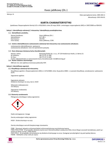Brenntag Polska Sp. z o.o. ul. J. Bema 21, 47-224 Kędzierzyn-Koźle tel (48/77) 4721500, fax (48/77) 4721600 Kwas jabłkowy (DL-) Wersja: III Data sporządzenia karty: 2001-08-11 Aktualizacja: 2015-06-01 KARTA CHARAKTERYSTYKI (podstawa: Rozporządzenie Komisji UE nr 453/2010 z dnia 20 maja 2010r. zmieniające rozporządzenie (WE) nr 1907/2006 ws REACH) Sekcja 1. Identyfikacja substancji / mieszaniny i identyfikacja przedsiębiorstwa. 1.1. Identyfikator produktu. Nazwa handlowa: Identyfikator: Kod towaru: Inne nazwy: Kwas jabłkowy (DL-) 617-48-1 501765 kwas jabłkowy, E296 1.2. Istotne zidentyfikowane zastosowania substancji lub mieszaniny oraz zastosowania odradzane. zastosowania zidentyfikowane: spożywcze zastosowania odradzane: inne niż wymienione powyżej 1.3. Dane dotyczące dostawcy karty charakterystyki. Nazwa i adres: Brenntag Polska Sp. z o.o., 47-224 Kedzierzyn-Koźle, ul. Bema 21 Nr telefonu: 48 (77) 47 21 500 Nr faxu: 48 (77) 47 21 600 Osoba odpowiedzialna za opracowanie karty charakterystyki: [email protected] 1.4. Numer telefonu alarmowego. 998 lub 112, lub najbliższa terenowa jednostka PSP. Sekcja 2. Identyfikacja zagrożeń. 2.1. Klasyfikacja substancji lub mieszaniny. Klasyfikacja zgodnie z Rozporządzeniem (WE) nr 1272/2008 z dnia 16 grudnia 2008 r. w sprawie klasyfikacji, oznakowania i pakowania (CLP) Zagrożenie ogólnie: Zagrożenie zdrowia: Działanie drażniące na oczy, kat.2, H319 Własności niebezpieczne: nie dotyczy Zagrożenie środowiska: nie dotyczy 2.2. Elementy oznakowania Piktogramy określające rodzaj zagrożenia: Hasło ostrzegawcze: Uwaga Zwroty wskazujące rodzaj zagrożenia: H319 - Działa drażniąco na oczy Zwroty określające warunki bezpiecznego stosowania: P280 - Stosować rękawice ochronne/odzież ochronną/ochronę oczu/ochronę twarzy. P305+P351+P338 - W przypadku dostania się do oczu: Ostrożnie płukać wodą przez kilka minut.Wyjąć soczewki kontaktowe, jeżeli są i można je łatwo usunąć. nadal płukać. P337+P313 - W przypadku utrzymywania się działania drażniącego na oczy: Zasięgnąć porady/zgłosić się pod opiekę lekarza P264b - Dokładnie umyć ciało po użyciu Karta opracowana przez firmę Brenntag Polska Sp. z o.o. Strona 1 z 6 Brenntag Polska Sp. z o.o. ul. J. Bema 21, 47-224 Kędzierzyn-Koźle tel (48/77) 4721500, fax (48/77) 4721600 Kwas jabłkowy (DL-) 2.3. Inne zagrożenia. brak dostępnych danych Sekcja 3. Skład / informacja o składnikach. Skład wg Rozporządzenia 1272/2008. >99,5% kwas jabłkowy Nr CAS: 617-48-1 Nr indeksowy: nie dotyczy Nr WE: 210-514-9 Sekcja 4. Środki pierwszej pomocy. 4.1. Opis środków pierwszej pomocy. Wdychanie: W razie narażenia inhalacyjnego zapewnić dostęp świeżego powietrza. Skontaktować się z lekarzem. Jeżeli poszkodowany nie oddycha zastosować sztuczne oddychanie. Zapewnić pomoc lekarską. Kontakt ze skórą: Zdjąć zanieczyszczoną odzież. W przypadku kontaktu ze skórą dokładnie zmyć wodą z mydłem . Gdy podrażnienie nie ustępuje skontaktować się z lekarzem . Kontakt z oczami: W przypadku dostania się do oczu płukać dużą ilością wody przez co najmniej 15 minut, przytrzymując odchylone powieki. Skontaktować się z lekarzem. Spożycie: W razie spożycia wypić dużą ilość wody. Zapewnić pomoc lekarską. Nie wywoływać wymiotów bez konsultacji z lekarzem. Nie podawać niczego do ust osobie nieprzytomnej. 4.2. Najważniejsze ostre i opóźnione objawy oraz skutki narażenia. brak dostępnych danych 4.3. Wskazania dotyczące wszelkiej natychmiastowej pomocy lekarskiej i szczególnego postępowania z poszkodowanym. brak dostępnych danych Sekcja 5. Postępowanie w przypadku pożaru. 5.1. Środki gaśnicze. woda, dwutlenek węgla, piany i proszki gaśnicze 5.2. Szczególne zagrożenia związane z substancją lub mieszaniną. Substancja palna. Opary produktu są cięższe od powietrza. Tworzy z powietrzem mieszaniny wybuchowe przy intensywnym ogrzewaniu. Podczas pożaru może uwalniać się tlenek i dwutlenek węgla. Ryzyko wybuchu pyłu 5.3. Informacje dla straży pożarnej. Nie dopuścić do przedostania się zanieczyszczonej wody gaśniczej do wód gruntowych i powierzchniowych. Stosować niezależny aparat oddechowy oraz pełną odzież ochronną Sekcja 6. Postępowanie w przypadku niezamierzonego uwolnienia do środowiska. 6.1. Indywidualne środki ostrożności, wyposażenie ochronne i procedury w sytuacjach awaryjnych. Unikać kontaktu z substancją oraz wzniecania pyłów. Zapewnić odpowiednią wentylację. Stosować środki ochrony osobistej. Trzymać ludzi z dala od strony nawietrznej. Usunąć źródła zapłonu. 6.2. Środki ostrożności w zakresie ochrony środowiska. Zapobiec przedostaniu się produktu do wód powierzchniowych i kanalizacji. 6.3. Metody i materiały zapobiegające rozprzestrzenianiu się skażenia i służące do usuwania skażenia. Stlumić kurz strumieniem rozpylonej wody. Rozsypany produkt zebrać do zamykanego pojemnika i przekazać do zniszczenia. 6.4. Odniesienia do innych sekcji. Informacje dotyczące odpowiedniego sprzętu ochrony osobistej podano w sekcji 8. Usuwać zgodnie z zaleceniami przedstawionymi w sekcji 13 Sekcja 7. Postępowanie z substancjami i mieszaninami oraz ich magazynowanie. 7.1. Środki ostrożności dotyczące bezpiecznego postępowania. Zapewnić odpowiednią wentylację. Unikać wzniecania pyłów oraz kontaktu ze skórą i oczami. Nie wdychać pyłów. Nie jeśc, nie pić i nie palić podczas pracy z produktem. Myć ręce przed przerwą i po zakończeniu pracy z produktem. Trzymać z dala od źródeł ognia i zapłonu. Przedsięwziąść środki ostrożności przeciwko wyładowaniomstatycznym. Karta opracowana przez firmę Brenntag Polska Sp. z o.o. Strona 2 z 6 Brenntag Polska Sp. z o.o. ul. J. Bema 21, 47-224 Kędzierzyn-Koźle tel (48/77) 4721500, fax (48/77) 4721600 Kwas jabłkowy (DL-) 7.2. Warunki bezpiecznego magazynowania, łącznie z informacjami dotyczącymi wszelkic