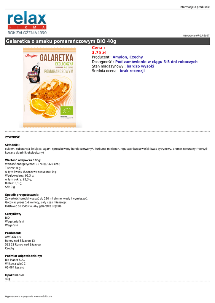 Informacje o produkcie Utworzono 07-03-2017 Galaretka o smaku pomarańczowym BIO 40g Cena : 3.75 zł Producent : Amylon, Czechy Dostępność : Pod zamówienie w ciągu 3-5 dni roboczych Stan magazynowy : bardzo wysoki Średnia ocena : brak recenzji ŻYWNOŚĆ Składniki: cukier*, substancja żelująca: agar*, sproszkowany burak czerwony*, kurkuma mielona*, regulator kwasowości: kwas cytrynowy, aromat naturalny (*certyfikowany składnik ekologiczny) Wartość odżywcza 100g: Wartość energetyczna: 1574 kJ / 370 kcal; Tłuszcz: 0 g; w tym kwasy tłuszczowe nasycone: 0 g Węglowodany: 92,3 g; w tym cukry: 92,3 g; Białko: 0,1 g; Sól: 0 g Sposób przygotowania: Zawartość torebki wsypać do 250 ml zimnej wody i wymieszać. Gotować przez 1-2 minuty, cały czas mieszając. Odstawić do lodówki, aby galaretka stężała. Certyfikaty: BIO Wegetariański Wegański Producent: AMYLON a.s. Ronov nad Sázavou 13 582 22 Ronov nad Sázavou Czechy Podmiot odpowiedzialny: Bio Planet S.A.. Wilkowa Wieś 7, 05-084 Leszno Opakowanie: 40g Wygenerowano w programie www.oscGold.com