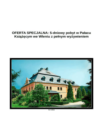 OFERTA SPECJALNA: 5-dniowy pobyt w Pałacu Książęcym we Wleniu z pełnym wyżywieniem fot. K.Bełz 1. 5 dni dla 2 osób w Pałacu Książęcym we Wleniu cena: 1220zł 790zł • 5 dni dla 2 osób w Pałacu Książęcym we Wleniu • Zakwaterowanie w renesansowym pałacu otoczonym urokliwym parkiem, w dolinie zamków i pałaców • Bezpłatny pobyt dziecka do 4 roku życia • Noclegi w przytulnym, dwuosobowym pokoju z łazienką (prysznic) • Dostępna dla wszystkich klimatyczna sala kominkowa oraz świetlica z telewizorem • 4 śniadania i 4 obiadokolacje z opcją wegetariańską, wegańską, bezglutenową • Miejsce na grilla i ognisko • Darmowe WiFi w części obiektu • W pobliżu wypożyczalnia kajaków, stadniny koni, szlaki Karkonoskiego Parku Narodowego • W miejscowości najstarszy w Polsce murowany zamek, piękne trasy spacerowe • • • • • • • • • • Szczegóły oferty: Cena obejmuje 5-dniowy pobyt dla 2 osób w Pałacu Książęcym we Wleniu w dniach 13.08-17.08 lub 14.08-18.08.2014: 4 noclegi w pokoju dwuosobowym, ze śniadaniami, obiadokolacjami i możliwością korzystania ze świetlicy, sali kominkowej oraz sprzętu do grillowania i miejsca na ognisko Dzieci do 4 roku (bez dostawki) – bez opłat Możliwość przedłużenia pobytu – 190 zł/doba Możliwość organizacji grillowania lub dodatkowych posiłków – cena do negocjacji Akceptujemy zwierzęta bez dodatkowych opłat Na Państwa życzenie zorganizujemy spływ kajakowy lub rajd konny Pokoje dla niepalących – palaczy zapraszamy do parku! Doba hotelowa w godz. 13.00 – 12.00, po uzgodnieniu możliwość wcześniejszego zakwaterowania Możliwość zamówienia dodatkowego sprzątania ze zmianą ręczników – 10zł lub wraz ze zmianą pościeli - 20zł Wszelkie pytania prosimy kierować na numer telefonu 668 851 639 lub drogą mailową na [email protected] 2. 5 dni dla 2 osób w Pałacu Książęcym we Wleniu cena: 1220zł 880zł • 5 dni dla 2 osób w Pałacu Książęcym we Wleniu • Zakwaterowanie w renesansowym pałacu otoczonym urokliwym parkiem, w dolinie zamków i pałaców • Bezpłatny pobyt dziecka do 4 roku życia • Dostawka i wyżywienie dla dziecka w wieku 4-12 lat – rabat 50% • Noclegi w przytulnym, dwuosobowym pokoju z łazienką (prysznic) • Dostępna dla wszystkich klimatyczna sala kominkowa oraz świetlica z telewizorem • 4 śniadania i 4 obiadokolacje z opcją wegetariańską, wegańską, bezglutenową • Miejsce na grilla i ognisko • Darmowe WiFi w części obiektu • W pobliżu wypożyczalnia kajaków, stadniny koni, szlaki Karkonoskiego Parku Narodowego • W miejscowości najstarszy w Polsce murowany zamek, piękne trasy spacerowe • • • • • • • • • • • Szczegóły oferty: Cena obejmuje 5-dniowy pobyt dla 2 osób w Pałacu Książęcym we Wleniu w dniach 13.08-17.08 lub 14.08-18.08.2014: 4 noclegi w pokoju dwuosobowym, ze śniadaniami, obiadokolacjami i możliwością korzystania ze świetlicy, sali kominkowej oraz sprzętu do grillowania i miejsca na ognisko Dzieci do 4 roku życia (bez dostawki) – bez opłat Dzieci w wieku 4-12 lat (dostawka i wyżywienie) – rabat 50% Możliwość przedłużenia pobytu – 220 zł/doba Możliwość organizacji grillowania lub dodatkowych posiłków – cena do negocjacji Akceptujemy zwierzęta bez dodatkowych opłat Na Państwa życzenie zorganizujemy spływ kajakowy lub rajd konny Pokoje dla niepalących – palaczy zapraszamy do parku! Doba hotelowa w godz. 13.00 – 12.00, po uzgodnieniu możliwość wcześniejszego zakwaterowania Możliwość zamówienia dodatkowego sprzątania ze zmianą ręczników – 10zł lub wraz ze zmianą pościeli - 20zł Wszelkie pytania prosimy kierować na numer telefonu 668 851 639 lub drogą mailową na [email protected] 3. 5 dni dla 3 osób w Pałacu Książęcym we Wleniu cena: 1680zł 1190zł • 5 dni dla 3 osób w Pałacu Książęcym we Wleniu • Zakwaterowanie w renesansowym pałacu otoczonym urokliwym parkiem, w dolinie zamków i pałaców • Bezpłatny pobyt dziecka do 4 roku życia • Dostawka i wyżywienie dla dziecka w wieku 4-12 lat – rabat 50% • Noclegi w przytulnym, trzyosobowym pokoju z łazienką (prysznic) • Dostępna dla wszystkich klimatyczna sala kominkowa oraz świetlica z telewizorem • 4 śniadania i 4 obiadokolacje z opcją wegetariańską, wegańską, bezglutenową • Miejsce na grilla i ognisko • Darmowe WiFi w części obiektu • W pobliżu wypożyczalnia kajaków, stadniny koni, szlaki Karkonoskiego Parku Narodowego • W miejscowości najstarszy w Polsce murowany zamek, piękne trasy spacerowe • • • • • • • • • • • Szczegóły oferty: Cena obejmuje 5-dniowy pobyt dla 3 osób w Pałacu Książęcym we Wleniu w dniach 13.08-17.08 lub 14.08-18.08.2014: 4 noclegi w pokoju trzyosobowym z łożem małżeńskim i łóżkiem pojedynczym, ze śniadaniami, obiadokolacjami i możliwością korzystania ze świetlicy, sali kominkowej oraz sprzętu do grillowania i miejsca na ognisko Dzieci do 4 roku życia (bez dostawki) – bez opłat Dzieci w wieku 4-12 lat (dostawka i wyżywienie) – rabat 50% Możliwość przedłużenia pobytu – 290 zł/doba Możliwość organizacji grillowania lub dodatkowych posiłków – cena do negocjacji Akceptujemy zwierzęta bez dodatkowych opłat Na Państwa życzenie zorganizujemy spływ kajakowy lub rajd konny Pokoje dla niepalących – palaczy zapraszamy do parku! Doba hotelowa w godz. 13.00 – 12.00, po uzgodnieniu możliwość wcześniejszego zakwaterowania Możliwość zamówienia dodatkowego sprzątania ze zmianą ręczników – 10zł lub wraz ze zmianą pościeli – 20zł Wszelkie pytania prosimy kierować na numer telefonu 668 851 639 lub drogą mailową na [email protected] 4. 5 dni dla 4 osób w Pałacu Książęcym we Wleniu cena: 2240zł 1440zł • 5 dni dla 4 osób w Pałacu Książęcym we Wleniu • Zakwaterowanie w renesansowym pałacu otoczon