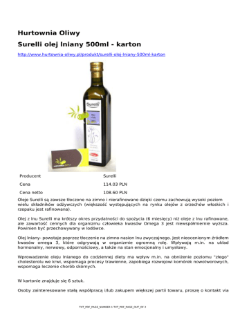 Hurtownia Oliwy Surelli olej lniany 500ml - karton http://www.hurtownia-oliwy.pl/produkt/surelli-olej-lniany-500ml-karton Producent Surelli Cena 114.03 PLN Cena netto 108.60 PLN Oleje Surelli są zawsze tłoczone na zimno i nierafinowane dzięki czemu zachowują wysoki poziom wielu składników odżywczych (większość występujących na rynku olejów z orzechów włoskich i rzepaku jest rafinowana). Olej z lnu Surelli ma krótszy okres przydatności do spożycia (6 miesięcy) niż oleje z lnu rafinowane, ale zawartość cennych dla organizmu człowieka kwasów Omega 3 jest niewspółmiernie wyższa. Powinien być przechowywany w lodówce. Olej lniany- powstaje poprzez tłoczenie na zimno nasion lnu zwyczajnego. Jest nieocenionym źródłem kwasów omega 3, które odgrywają w organizmie ogromną rolę. Wpływają m.in. na układ hormonalny, nerwowy, odpornościowy, a także na stan emocjonalny i umysłowy. Wprowadzenie oleju lnianego do codziennej diety ma wpływ m.in. na obniżenie poziomu "złego" cholesterolu we krwi, wspomaga procesy trawienne, zapobiega rozwojowi komórek nowotworowych, wspomaga leczenie chorób skórnych. W kartonie znajduje się 6 sztuk. Osoby zainteresowane stałą współpracą i/lub zakupem większej partii towaru, proszę o kontakt via TXT_PDF_PAGE_NUMBER 1 TXT_PDF_PAGE_OUT_OF 2 e-mail - prześlemy ofertę cenową, skorygowaną odpowiednio pod zapotrzebowanie klienta. TXT_PDF_PAGE_NUMBER 2 TXT_PDF_PAGE_OUT_OF 2