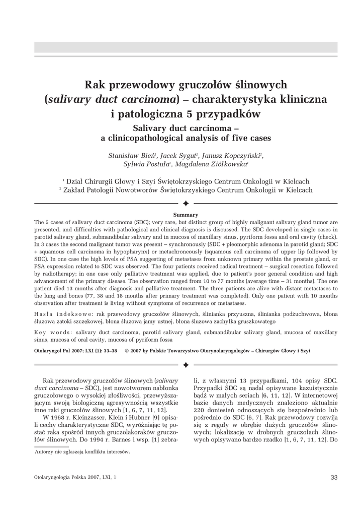 Rak przewodowy gruczo∏ów Êlinowych (salivary duct carcinoma) – charakterystyka kliniczna i patologiczna 5 przypadków Salivary duct carcinoma – a clinicopathological analysis of five cases Stanis∏aw Bieƒ1, Jacek Sygut2, Janusz Kopczyƒski2, Sylwia Postu∏a1, Magdalena Zió∏kowska1 Dzia∏ Chirurgii G∏owy i Szyi Âwi´tokrzyskiego Centrum Onkologii w Kielcach Zak∏ad Patologii Nowotworów Âwi´tokrzyskiego Centrum Onkologii w Kielcach 1 2 F Summary The 5 cases of salivary duct carcinoma (SDC); very rare, but distinct group of highly malignant salivary gland tumor are presented, and difficulties with pathological and clinical diagnosis is discussed. The SDC developed in single cases in parotid salivary gland, submandibular salivary and in mucosa of maxillary sinus, pyriform fossa and oral cavity (check). In 3 cases the second malignant tumor was present – synchronously (SDC + pleomorphic adenoma in parotid gland; SDC + squamous cell carcinoma in hypopharynx) or metachroneously (squamous cell carcinoma of upper lip followed by SDC). In one case the high levels of PSA suggesting of metastases from unknown primary within the prostate gland, or PSA expression related to SDC was observed. The four patients received radical treatment – surgical resection followed by radiotherapy; in one case only palliative treatment was applied, due to patient’s poor general condition and high advancement of the primary disease. The observation ranged from 10 to 77 months (average time – 31 months). The one patient died 13 months after diagnosis and palliative treatment. The three patients are alive with distant metastases to the lung and bones (77, 38 and 18 months after primary treatment was completed). Only one patient with 10 months observation after treatment is living without symptoms of recurrence or metastases. H a s ∏ a i n d e k s o w e : rak przewodowy gruczo∏ów Êlinowych, Êlinianka przyuszna, Êlinianka pod˝uchwowa, b∏ona Êluzowa zatoki szcz´kowej, b∏ona Êluzowa jamy ustnej, b∏ona Êluzowa zachy∏ka gruszkowatego K e y w o r d s : salivary duct carcinoma, parotid salivary gland, submandibular salivary gland, mucosa of maxillary sinus, mucosa of oral cavity, mucosa of pyriform fossa Otolaryngol Pol 2007; LXI (1): 33–38 © 2007 by Polskie Towarzystwo Otorynolaryngologów – Chirurgów G∏owy i Szyi F Rak przewodowy gruczo∏ów Êlinowych (salivary duct carcinoma – SDC), jest nowotworem nab∏onka gruczo∏owego o wysokiej z∏oÊliwoÊci, przewy˝szajàcym swojà biologicznà agresywnoÊcià wszystkie inne raki gruczo∏ów Êlinowych [1, 6, 7, 11, 12]. W 1968 r. Kleinzasser, Klein i Hubner [9] opisali cechy charakterystyczne SDC, wyró˝niajàc t´ postaç raka spoÊród innych gruczolakoraków gruczo∏ów Êlinowych. Do 1994 r. Barnes i wsp. [1] zebra- li, z w∏asnymi 13 przypadkami, 104 opisy SDC. Przypadki SDC sà nadal opisywane kazuistycznie bàdê w ma∏ych seriach [6, 11, 12]. W internetowej bazie danych medycznych znaleziono aktualnie 220 doniesieƒ odnoszàcych si´ bezpoÊrednio lub poÊrednio do SDC [6, 7]. Rak przewodowy rozwija si´ z regu∏y w obr´bie du˝ych gruczo∏ów Êlinowych; lokalizacj´ w drobnych gruczo∏ach Êlinowych opisywano bardzo rzadko [1, 6, 7, 11, 12]. Do Autorzy nie zg∏aszajà konfliktu interesów. Otolaryngologia Polska 2007, LXI, 1 33 S. Bieƒ i inni 1988 r. Zohar i wsp. [12], znaleêli jedynie 2 opisy SDC w obr´bie ma∏ych gruczo∏ów Êlinowych, na 44 przeanalizowane publikacje. SDC wyst´puje u osób doros∏ych, z regu∏y po 50. roku ˝ycia, z 3–4-krotnà przewagà m´˝czyzn [4, 9, 11]. Wi´kszoÊç chorych umiera w ciàgu 3–4 lat od ustalenia rozpoznania, g∏ównie z powodu przerzutów odleg∏ych, zarówno drogà krwiopochodnà, jak i drogà uk∏adu ch∏onnego [1, 7, 11, 12]. Histologicznie SDC podobny jest do raka wewnàtrzprzewodowego i naciekajàcego przewodowego gruczo∏u piersiowego. Wyró˝nia si´ nast´pujàce postacie morfologiczne SDC zale˝ne od charakteru wzrostu: lità, brodawkowatà, sitowatà, czopiastà (comedo), mi´sakowà i w∏ókniejàcà. Postacie te mogà wspó∏istnieç obok siebie w tym samym nowotworze. Komórki guza wykazujà szereg cech atypii, polegajàcych mi´dzy innymi na polimorfizmie i nadbarwliwoÊci jàder komórkowych czy obfitej, kwasoch∏onnej cytoplazmie. Zwykle obserwuje si´ liczne, cz´sto atypowe figury podzia∏u komórkowego. Wzrost raka jest naciekajàcy, a naciekanie wzd∏u˝ pni nerwowych jest elementem wyró˝niajàcym. Barwienie mucikarminem i alcianem blue jest ujemne. Profil immunohistochemiczny SDC potwierdza pochodzenie guza z komórek luminalnych Êlinianki i charakteryzuje si´ ekspresjà wysoko- i niskoczàsteczkowych cytokeratyn oraz EMA (epithelial membrane antigen), natomiast brakiem ekspresji markerów mioepitelialnych (S-100 i aktyny). Opisywana jest ekspresja PSA oraz markerów androgenowych [5, 7]. Diagnostyka immunohistochemiczna jest nieodzowna do rozpoznania przerzutów SDC, gdy˝ brak jest w nich charakterystycznych, morfologicznych cech rozrostu wewnàtrzprzewodowego. W ró˝nicowaniu SDC z innymi guzami gruczo∏ów Êlinowych nale˝y uwzgl´dniç raka Êluzowo-naskórkowego o wysokiej z∏oÊliwoÊci, gruczolakoraka kwasoch∏onnego, postaç brodawkowatà gruczolakoraka, raka nab∏onkowo-mioepitelialnego i gruczolakoraka polimorficznego o niskim stopniu z∏oÊliwoÊci [8, 11, 12]. OPISY PRZYPADKÓW Przypadek 1. Chory B.F., lat 51 (No: 64168). Pierwotnie operowany poza Âl.CO z powodu szybko rosnàcego guza 7 x 5 cm w prawej okolicy pod˝uchwowej, ocenionego w badaniu histologiczno-patologicznym preparatu operacyjnego jako Carcinoma solidum non differentiatum, partim necroti- 34 cans probabiliter matastaticum. Infiltratio perineuralis et lymphangiosis carcinomatosa. W rutynowym post´powaniu nie znaleziono ogniska pierwotnego. Ju˝ po 3 tyg. od operacji stwierdzono na szyi po stronie prawej (III region) szybko po