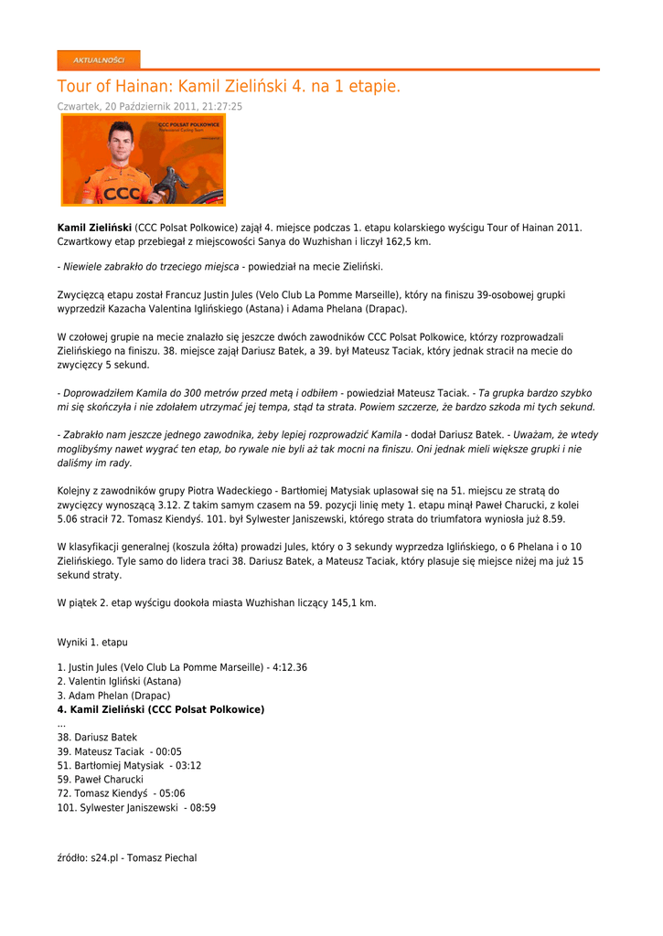 Tour of Hainan: Kamil Zieliński 4. na 1 etapie. Czwartek, 20 Październik 2011, 21:27:25 Kamil Zieliński (CCC Polsat Polkowice) zajął 4. miejsce podczas 1. etapu kolarskiego wyścigu Tour of Hainan 2011. Czwartkowy etap przebiegał z miejscowości Sanya do Wuzhishan i liczył 162,5 km. - Niewiele zabrakło do trzeciego miejsca - powiedział na mecie Zieliński. Zwycięzcą etapu został Francuz Justin Jules (Velo Club La Pomme Marseille), który na finiszu 39-osobowej grupki wyprzedził Kazacha Valentina Iglińskiego (Astana) i Adama Phelana (Drapac). W czołowej grupie na mecie znalazło się jeszcze dwóch zawodników CCC Polsat Polkowice, którzy rozprowadzali Zielińskiego na finiszu. 38. miejsce zajął Dariusz Batek, a 39. był Mateusz Taciak, który jednak stracił na mecie do zwycięzcy 5 sekund. - Doprowadziłem Kamila do 300 metrów przed metą i odbiłem - powiedział Mateusz Taciak. - Ta grupka bardzo szybko mi się skończyła i nie zdołałem utrzymać jej tempa, stąd ta strata. Powiem szczerze, że bardzo szkoda mi tych sekund. - Zabrakło nam jeszcze jednego zawodnika, żeby lepiej rozprowadzić Kamila - dodał Dariusz Batek. - Uważam, że wtedy moglibyśmy nawet wygrać ten etap, bo rywale nie byli aż tak mocni na finiszu. Oni jednak mieli większe grupki i nie daliśmy im rady. Kolejny z zawodników grupy Piotra Wadeckiego - Bartłomiej Matysiak uplasował się na 51. miejscu ze stratą do zwycięzcy wynoszącą 3.12. Z takim samym czasem na 59. pozycji linię mety 1. etapu minął Paweł Charucki, z kolei 5.06 stracił 72. Tomasz Kiendyś. 101. był Sylwester Janiszewski, którego strata do triumfatora wyniosła już 8.59. W klasyfikacji generalnej (koszula żółta) prowadzi Jules, który o 3 sekundy wyprzedza Iglińskiego, o 6 Phelana i o 10 Zielińskiego. Tyle samo do lidera traci 38. Dariusz Batek, a Mateusz Taciak, który plasuje się miejsce niżej ma już 15 sekund straty. W piątek 2. etap wyścigu dookoła miasta Wuzhishan liczący 145,1 km. Wyniki 1. etapu 1. Justin Jules (Velo Club La Pomme Marseille) - 4:12.36 2. Valentin Igliński (Astana) 3. Adam Phelan (Drapac) 4. Kamil Zieliński (CCC Polsat Polkowice) ... 38. Dariusz Batek 39. Mateusz Taciak - 00:05 51. Bartłomiej Matysiak - 03:12 59. Paweł Charucki 72. Tomasz Kiendyś - 05:06 101. Sylwester Janiszewski - 08:59 źródło: s24.pl - Tomasz Piechal