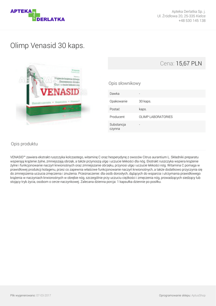 Apteka Derlatka Sp. j. Ul. Źródłowa 20, 25-335 Kielce +48 530 145 138 Olimp Venasid 30 kaps. Cena: 15,67 PLN Opis słownikowy Dawka - Opakowanie 30 kaps. Postać kaps. Producent OLIMP LABORATORIES Substancja czynna - Opis produktu VENASID™ zawiera ekstrakt ruszczyka kolczastego, witaminę C oraz hesperydynę z owoców Citrus aurantium L. Składniki preparatu wspierają krążenie żylne, zmniejszają obrzęk, a także przynoszą ulgę i uczucie lekkości dla nóg. Ekstrakt ruszczyka wspiera krążenie żylne i funkcjonowanie naczyń krwionośnych oraz zmniejszanie obrzęku, przynosi ulgę i uczucie lekkości nóg. Witamina C pomaga w prawidłowej produkcji kolagenu, przez co zapewnia właściwe funkcjonowanie naczyń krwionośnych, a także dodatkowo przyczynia się do zmniejszenia uczucia zmęczenia i znużenia. Przeznaczenie: dla osób dorosłych, dążących do wsparcia i utrzymania prawidłowego krążenia w naczyniach krwionośnych w obrębie nóg, szczególnie przy uczuciu ciężkości i zmęczenia nóg, prowadzących siedzący lub stojący tryb życia, osobom o cerze naczynkowej. Zalecana dzienna porcja: 1 kapsułka dziennie po posiłku. Plik wygenerowano: 07-03-2017 Powered by TCPDF (www.tcpdf.org) Oprogramowanie sklepu: AptusShop