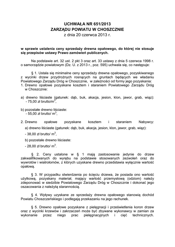UCHWAŁA NR 651/2013 ZARZĄDU POWIATU W CHOSZCZNIE z dnia 20 czerwca 2013 r. w sprawie ustalenia ceny sprzedaży drewna opałowego, do której nie stosuje się przepisów ustawy Prawo zamówień publicznych. Na podstawie art. 32 ust. 2 pkt 3 oraz art. 33 ustawy z dnia 5 czerwca 1998 r. o samorządzie powiatowym (Dz. U. z 2013 r., poz. 595) uchwala się, co następuje: § 1. Ustala się minimalne ceny sprzedaży drewna opałowego, pozyskiwanego z wycinki drzew przydrożnych rosnących na gruntach będących we władaniu Powiatowego Zarządu Dróg w Choszcznie, w zależności od formy jego pozyskania: 1. Drewno opałowe pozyskane kosztem i staraniem Powiatowego Zarządu Dróg w Choszcznie: a) drewno liściaste (gatunek: dąb, buk, akacja, jesion, klon, jawor, grab, wiąz): - 75,00 zł brutto/m3, b) pozostałe drewno liściaste: - 55,00 zł brutto/ m3, 2. Drewno opałowe pozyskane kosztem i staraniem Nabywcy: a) drewno liściaste (gatunek: dąb, buk, akacja, jesion, klon, jawor, grab, wiąz): - 38,00 zł brutto/ m3, b) pozostałe drewno liściaste: - 28,00 zł brutto/ m3. § 2. Ceny ustalone w § 1 mają zastosowanie jedynie do drzew zakwalifikowanych do wyrębu na podstawie stosowanych zezwoleń oraz do wywrotów i wiatrołomów, z których uzyskane drewno przedstawia wyłącznie wartość opałową. § 3. W przypadku stwierdzenia po ścięciu drzewa, że posiada ono wartość użytkową, pozyskany materiał, mający wartość przemysłową (odziom) należy zdeponować w siedzibie Powiatowego Zarządu Dróg w Choszcznie i dokonać jego oszacowania z należytą starannością. § 4. Wpływy uzyskane ze sprzedaży drewna opałowego stanowią dochód Powiatu Choszczeńskiego i podlegają przekazaniu na jego rachunek. § 5. Drewno opałowe pozyskane z pielęgnacji i prześwietlenia koron drzew oraz z wycinki krzewów i zakrzaczeń może być zbywane wykonawcy w zamian za wykonanie przez niego prac pielęgnacyjnych i cięć technicznych. § 6. Drewno opałowe pozyskane przez Powiatowy Zarząd Dróg w Choszcznie, za zgodą Zarządu Powiatu może być także przekazywane nieodpłatnie jednostkom organizacyjnym powiatu na cele związane z ogrzewaniem budynków. § 7. Szczegółowe zasady gospodarki drewnem określa regulamin, stanowiący załącznik nr 1 do zarządzenia. § 8. Ceny ustalone w § 1 podlegają raz w roku, przed sezonem wyrębu, waloryzacji o średnioroczny wskaźnik cen towarów i usług konsumpcyjnych ogłaszany przez Prezesa GUS, począwszy od 2014 r. § 9. Wykonanie uchwały powierza się Dyrektorowi Powiatowego Zarządu Dróg w Choszcznie. § 10. Uchwała wchodzi w życie z dniem podjęcia. Zarząd Powiatu: 1. Lesław Śliżewski 2. Tadeusz Puczyński 3. Bogdan Brzustowicz 4. Małgorzata Buchajczyk 5. Barbara Zaniewska Załącznik do Uchwały Nr 651/2013 Zarządu Powiatu w Choszcznie z dnia 20 czerwca 2013 r. Regulamin postępowania w zakresie prowadzenia gospodarki drewnem uzyskanym z wycinki drzew przydrożnych §1 1. 2. 3. 4. 5. Usuwanie drzew przydrożnych z pasa drogowego odbywa się na podstawie planu wyrębu i zezwolenia właściwego organu na ich usunięcie. Plan wyrębu drzew z pasa drogowego sporządzany jest w Powiatowym Zarządzie Dróg w Choszcznie, na każdy kolejny sezon obejmujący okres od 1 listopada do 31 marca następnego roku. Powiatowy Zarząd Dróg w Choszcznie z opracowanym planem wyrębu i przygotowanym wnioskiem występuje do właściwych organów gmin o wydanie zgody na ich wycinkę. Wniosek musi być przygotowany zgodnie z art. 83 ust.4 ustawy z dnia 16 kwietnia 2004 r. o ochronie przyrody (Dz. U. Nr 92, poz. 880) Uzyskane zezwolenie w formie decyzji administracyjnej stanowi podstawę do prowadzenia wycinki drzew. Plany wyrębu drzew sporządza Sekcja Techniczna w porozumieniu z Kierownikiem Obwodu Drogowego. §2 1. 2. Drzewa nie ujęte w planie wyrębu mogą być usuwane gdy zagrażają bezpieczeństwu ludzi i mienia, a także bezpieczeństwa ruchu drogowego po uzyskaniu zezwolenia właściwego organu na ich usunięcie. Konieczność usunięcia tych drzew stwierdza Kierownik Obwodu Drogowego lub ustala się komisyjnie po przeprowadzonej wizji w terenie. §3 1. Przeznaczone drzewa do wycinki oznacza się farbą nadając kolejny numer na danej drodze, jednocześnie przeprowadzając obmiar obwodu pnia na wysokości 1,3 m. 2. Na podstawie tablic do kubizowania drewna okrągłego wylicza się m 3 drewna pozyskanego z wycinki. Ilość obliczonego w ten sposób drewna będzie każdorazowo weryfikowana po ścięciu drzewa i pozyskaniu drewna opałowego. Komisja dokonuje obmiaru pozyskanego drewna i spisuje protokół. §4 1. Drzewa wyznaczone do wycinki zgodnie z planem wyrębu drzew przeznacza się: a. na sprzedaż dla pracowników, emerytów i rencistów Powiatowego Zarządu Dróg w Choszcznie do limitu 10 m3 rocznie, za cenę określoną w §1 ust. 2 uchwały Zarządu Powiatu w Choszcznie w sprawie ustalenia ceny sprzedaży drewna opałowego, do której nie stosuje się przepisów ustawy Prawo zamówień publicznych, b. na sprzedaż dla innych odbiorców, c. do przekazania zainteresowanym osobom prawnym (np. szkoły, ośrodki szkolnowychowawcze). 2. Za pozyskane drewno z wycinki drzew przeznaczonych na sprzedaż pobiera się opłatę w wysokości ustalonej przez Zarząd Powiatu. Dochód ze sprzedaży drewna Powiatowy Zarząd Dróg w Choszcznie przekazuje do budżetu Powiatu. 3. Drzewa, które nie znajdują nabywców z uwagi na złą jakość (m.in topole, lipy, wierzby, drzewa mocno spróchniałe), po wycince są niszczone na miejscu lub na placu Powiatowego Zarządu Dróg w Choszcznie. §5 1. Dyrektor Powiatowego Zarządu Dróg w Choszcznie powołuje zarządzeniem wewnętrznym Komisję do rozpatrywania spraw określonych w niniejszym Regulaminie. 2. Za właściwą gospodarkę drewnem w Powiatowym Zarządzie Dróg w Choszcznie ponosi odpowiedzialność Kierownik Obwodu Drogowego, który zobowiązany jest do prowadzenia dokumentacji gospodarki drewnem. 3. 