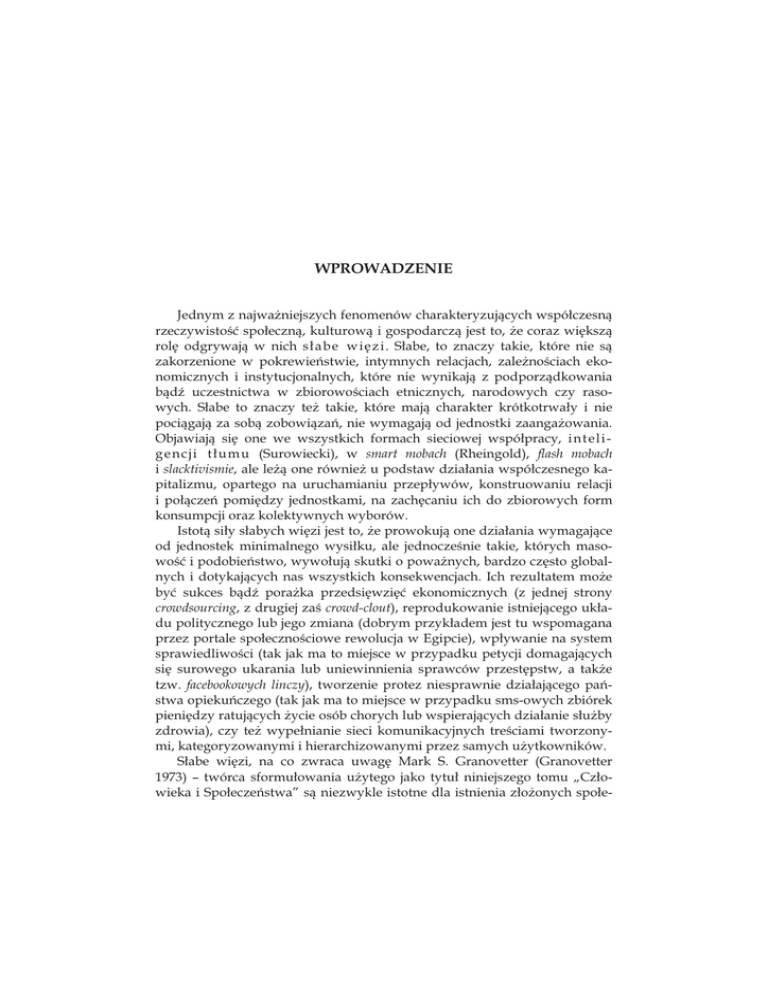 WPROWADZENIE Jednym z najwa niejszych fenomenów charakteryzuj!cych wspó"czesn! rzeczywisto#$ spo"eczn!, kulturow! i gospodarcz! jest to, e coraz wi%ksz! rol% odgrywaj! w nich s"abe wi%zi. S"abe, to znaczy takie, które nie s! zakorzenione w pokrewie&stwie, intymnych relacjach, zale no#ciach ekonomicznych i instytucjonalnych, które nie wynikaj! z podporz!dkowania b!d' uczestnictwa w zbiorowo#ciach etnicznych, narodowych czy rasowych. S"abe to znaczy te takie, które maj! charakter krótkotrwa"y i nie poci!gaj! za sob! zobowi!za&, nie wymagaj! od jednostki zaanga owania. Objawiaj! si% one we wszystkich formach sieciowej wspó"pracy, inteligencji t"umu (Surowiecki), w smart mobach (Rheingold), flash mobach i slacktivismie, ale le ! one równie u podstaw dzia"ania wspó"czesnego kapitalizmu, opartego na uruchamianiu przep"ywów, konstruowaniu relacji i po"!cze& pomi%dzy jednostkami, na zach%caniu ich do zbiorowych form konsumpcji oraz kolektywnych wyborów. Istot! si"y s"abych wi%zi jest to, e prowokuj! one dzia"ania wymagaj!ce od jednostek minimalnego wysi"ku, ale jednocze#nie takie, których masowo#$ i podobie&stwo, wywo"uj! skutki o powa nych, bardzo cz%sto globalnych i dotykaj!cych nas wszystkich konsekwencjach. Ich rezultatem mo e by$ sukces b!d' pora ka przedsi%wzi%$ ekonomicznych (z jednej strony crowdsourcing, z drugiej za# crowd-clout), reprodukowanie istniej!cego uk"adu politycznego lub jego zmiana (dobrym przyk"adem jest tu wspomagana przez portale spo"eczno#ciowe rewolucja w Egipcie), wp"ywanie na system sprawiedliwo#ci (tak jak ma to miejsce w przypadku petycji domagaj!cych si% surowego ukarania lub uniewinnienia sprawców przest%pstw, a tak e tzw. facebookowych linczy), tworzenie protez niesprawnie dzia"aj!cego pa&stwa opieku&czego (tak jak ma to miejsce w przypadku sms-owych zbiórek pieni%dzy ratuj!cych ycie osób chorych lub wspieraj!cych dzia"anie s"u by zdrowia), czy te wype"nianie sieci komunikacyjnych tre#ciami tworzonymi, kategoryzowanymi i hierarchizowanymi przez samych u ytkowników. S"abe wi%zi, na co zwraca uwag% Mark S. Granovetter (Granovetter 1973) – twórca sformu"owania u ytego jako tytu" niniejszego tomu „Cz"owieka i Spo"ecze&stwa” s! niezwykle istotne dla istnienia z"o onych spo"e- 8 Wprowadzenie cze&stw, a zw"aszcza dla upowszechniania si% w jego obr%bie informacji, dyfuzji wzorów, upodoba& konsumenckich i mód, a poprzez to dla ich rozwoju, korzystnych dla nich przeobra e&. Chocia ten rodzaj wi%zi, "!cz!cy ze sob! nieznajomych lub osoby, dla których stosunki tego rodzaju s! jedynym rodzajem relacji w jakie one wchodz!, nie jest w stanie zaspokaja$ wszystkich naszych potrzeb (bo cz%#$ z nich mo na realizowa$ tylko w bardzo bliskich, intymnych wr%cz zwi!zkach, w których si% doskonale znamy, ufamy sobie i które s! niedost%pne dla innych), to jednocze#nie jest on niezb%dny równie samym jednostkom. To dzi%ki s"abym wi%ziom uniezale niamy si% od #rodowiska, w którym przebiega nasze ycie, stajemy si% samodzielni i niezale ni, to one sprawiaj!, i zaczynamy mie$ wybór i mo emy decydowa$ o sobie. Oddawany do r!k czytelnika numer tematyczny „Cz"owieka i Spo"ecze&stwa” jest prób! pokazania czym s! s"abe wi%zi, sk!d si% one bior!, dlaczego jednostki si% w nie anga uj!, jakie s! ich skutki spo"eczne. Chcieliby#my te zapyta$ o to, w jaki sposób zmieniaj! one funkcjonowanie spo"ecze&stw, opartych dot!d na wi%ziach silnych i w jakich relacjach pozostaj! one wobec jednostkowych to samo#ci; o to, czy i jak przekszta"caj! one sposób funkcjonowania podstawowych instytucji nowoczesnego spo"ecze&stwa (rodziny, pa&stwa, instytucji ekonomicznych i politycznych) oraz dzia"ania pola kulturowego (w tym przede wszystkim instytucji kulturowych, procesów tworzenia, waloryzowania i upowszechniania dóbr kulturowych). Marek Krajewski