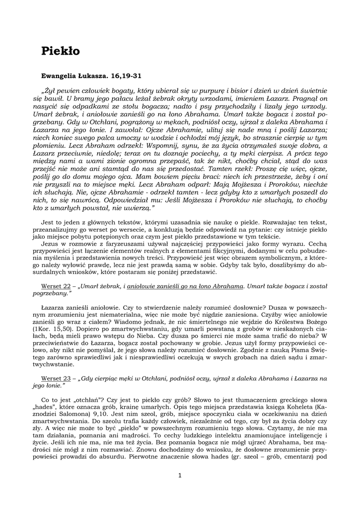 Piekło Ewangelia Łukasza. 16,19-31 „Żył pewien człowiek bogaty, który ubierał się w purpurę i bisior i dzień w dzień świetnie się bawił. U bramy jego pałacu leżał żebrak okryty wrzodami, imieniem Łazarz. Pragnął on nasycić się odpadkami ze stołu bogacza; nadto i psy przychodziły i lizały jego wrzody. Umarł żebrak, i aniołowie zanieśli go na łono Abrahama. Umarł także bogacz i został pogrzebany. Gdy w Otchłani, pogrążony w mękach, podniósł oczy, ujrzał z daleka Abrahama i Łazarza na jego łonie. I zawołał: Ojcze Abrahamie, ulituj się nade mną i poślij Łazarza; niech koniec swego palca umoczy w wodzie i ochłodzi mój język, bo strasznie cierpię w tym płomieniu. Lecz Abraham odrzekł: Wspomnij, synu, że za życia otrzymałeś swoje dobra, a Łazarz przeciwnie, niedolę; teraz on tu doznaje pociechy, a ty męki cierpisz. A prócz tego między nami a wami zionie ogromna przepaść, tak że nikt, choćby chciał, stąd do was przejść nie może ani stamtąd do nas się przedostać. Tamten rzekł: Proszę cię więc, ojcze, poślij go do domu mojego ojca. Mam bowiem pięciu braci: niech ich przestrzeże, żeby i oni nie przyszli na to miejsce męki. Lecz Abraham odparł: Mają Mojżesza i Proroków, niechże ich słuchają. Nie, ojcze Abrahamie - odrzekł tamten - lecz gdyby kto z umarłych poszedł do nich, to się nawrócą. Odpowiedział mu: Jeśli Mojżesza i Proroków nie słuchają, to choćby kto z umarłych powstał, nie uwierzą.” Jest to jeden z głównych tekstów, którymi uzasadnia się naukę o piekle. Rozważając ten tekst, przeanalizujmy go werset po wersecie, a konkluzją będzie odpowiedź na pytanie: czy istnieje piekło jako miejsce pobytu potępionych oraz czym jest piekło przedstawione w tym tekście. Jezus w rozmowie z faryzeuszami używał najczęściej przypowieści jako formy wyrazu. Cechą przypowieści jest łączenie elementów realnych z elementami fikcyjnymi, dodanymi w celu pobudzenia myślenia i przedstawienia nowych treści. Przypowieść jest więc obrazem symbolicznym, z którego należy wyłowić prawdę, lecz nie jest prawdą samą w sobie. Gdyby tak było, doszlibyśmy do absurdalnych wniosków, które postaram się poniżej przedstawić. Werset 22 – „Umarł żebrak, i aniołowie zanieśli go na łono Abrahama. Umarł także bogacz i został pogrzebany.” Łazarza zanieśli aniołowie. Czy to stwierdzenie należy rozumieć dosłownie? Dusza w powszechnym zrozumieniu jest niematerialna, więc nie może być nigdzie zaniesiona. Czyżby więc aniołowie zanieśli go wraz z ciałem? Wiadomo jednak, że nic śmiertelnego nie wejdzie do Królestwa Bożego (1Kor. 15,50). Dopiero po zmartwychwstaniu, gdy umarli powstaną z grobów w nieskażonych ciałach, będą mieli prawo wstępu do Nieba. Czy dusza po śmierci nie może sama trafić do nieba? W przeciwieństwie do Łazarza, bogacz został pochowany w grobie. Jezus użył formy przypowieści celowo, aby nikt nie pomyślał, że jego słowa należy rozumieć dosłownie. Zgodnie z nauką Pisma Świętego zarówno sprawiedliwi jak i niesprawiedliwi oczekują w swych grobach na dzień sądu i zmartwychwstanie. Werset 23 – „Gdy cierpiąc męki w Otchłani, podniósł oczy, ujrzał z daleka Abrahama i Łazarza na jego łonie.” Co to jest „otchłań”? Czy jest to piekło czy grób? Słowo to jest tłumaczeniem greckiego słowa „hades”, które oznacza grób, krainę umarłych. Opis tego miejsca przedstawia księga Koheleta (Kaznodziei Salomona) 9,10. Jest nim szeol, grób, miejsce spoczynku ciała w oczekiwaniu na dzień zmartwychwstania. Do szeolu trafia każdy człowiek, niezależnie od tego, czy był za życia dobry czy zły. A więc nie może to być „piekło” w powszechnym rozumieniu tego słowa. Czytamy, że nie ma tam działania, poznania ani mądrości. To cechy ludzkiego intelektu znamionujące inteligencję i życie. Jeśli ich nie ma, nie ma też życia. Bez poznania bogacz nie mógł ujrzeć Abrahama, bez mądrości nie mógł z nim rozmawiać. Znowu dochodzimy do wniosku, że dosłowne zrozumienie przypowieści prowadzi do absurdu. Pierwotne znaczenie słowa hades (gr. szeol – grób, cmentarz) pod 1 wpływem mitologii greckiej zmieniło się, przyjmując formę miejsca pobytu potępionych i przenikając później do kultury rzymskiej i chrześcijańskiej (zob. http://pl.wikipedia.org/wiki/Szeol). Werset 24 – „I zawołał: Ojcze Abrahamie, ulituj się nade mną i przyślij Łazarza, aby koniec swego palca umoczył w wodzie i ochłodził mój język, bo strasznie cierpię w tym płomieniu.” Jeśli ktoś jest w ciele, może cierpieć męki z powodu ognia, ale przecież w szeolu bogacz musiał być już martwy, gdyż szeol jest krainą umarłych. Czy dusza może cierpieć męki z powodu ognia? Czy może odczuwać pragnienie? Czy dusza ma palec i język? Czy Bogu zależy na tym, aby Jego stworzenia cierpiały męki? Czy miałoby to być formą odwetu za złe życie i odrzucenie daru zbawienia? Przypowieść Jezusa jest bodźcem do głębokiej refleksji. Bóg nie jest mściwy, nie dąży do rewanżu. Losem wszystkich niesprawiedliwych nie jest wieczne cierpienie, lecz wieczna śmierć, ostateczne unicestwienie w ogniu Bożym (Apokalipsa 20,9). Cierpienie będzie im towarzyszyło za życia, gdy zobaczą co utracili, gdy zostanie im przedstawione zło, które wyrządzili i odrzucona łaska Boża. Będą mogli ocenić swoje złe wybory i poznać ostateczne tego konsekwencje – sprawiedliwy wyrok sądu Bożego. Werset 31 – „Odpowiedział mu: Jeśli Mojżesza i Proroków nie słuchają, to choćby ktoś z umarłych powstał, nie uwierzą.” To jest podsumowanie całej przypowieści o bogaczu i Łazarzu. Końcowa wypowiedź Jezusa kładzie nacisk na Słowo Boże. Prawdziwe świadectwo mamy w Słowie Bożym a nie w pogańskiej tradycji. Jezus powiedział tę przypowieść do faryzeuszy, którzy ulegli wpływom obcej kultury