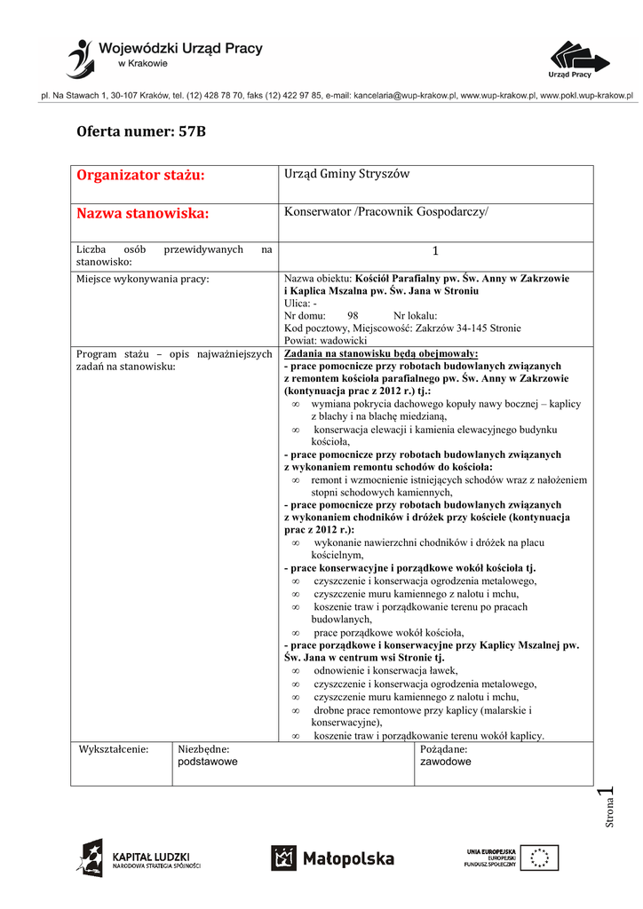 Oferta numer: 57B Organizator stażu: Nazwa stanowiska: