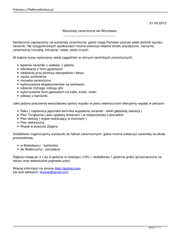 Pobrano z PlatformaKultury.pl 21.03.2012 Warsztaty ceramiczne we Wrocławiu ____________________________ Serdecznie zapraszamy na warsztaty ceramiczne, gdzie mogą Państwo poznać wiele technik wyrobu ceramiki. Na cotygodniowych spotkaniach można stworzyć własne działo artystyczne, naczynie, ceramiczną mozaikę, biżuterię i wiele, wiele innych. W trakcie kursu wykonamy wiele zagadnień w różnych technikach ceramicznych: lepienie ceramiki z wałków, z płatów odciskanie z form gipsowych zdobienie przy pomocy stempelków i faktur nauka szkliwienia mozaika ceramiczna wykonywanie eksperymentów na szkliwach. robienie różnego rodzaju glin wykonywanie form gipsowych na kafle, kubki, miski. odlewy z kamionki Jako jedyna pracownia warsztatowa oprócz wypału w piecu elektrycznym oferujemy wypały w piecach: Raku ( najstarsza japońska technika wypalania ceramiki - efekt głębokiej redukcji ) Piec Tongkama ( piec opalany drewnem ) w miejscowości Luboradów Piec dołowy ( wypał redukujący w trocinach ) Piec elektryczny Wypał w puszcze Zegera Dodatkowo organizujemy wycieczki do fabryk ceramicznych, gdzie można zobaczyć ceramikę na skalę przemysłową: w Bolesławcu - kamionka do Wałbrzycha - porcelana Zajęcia trwają po 4 x po 3 godziny w miesiącu (12h) + dodatkowa 1 godzina gratis (przeznaczona na retusz oraz ewentualne poprawki prac) Więcej informacji na stronie http://4sztuki.com lub pod adresem: [email protected] strona 1 / 1