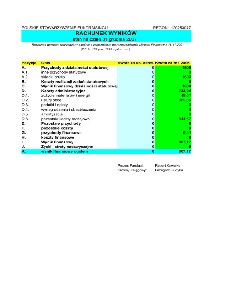 POLSKIE STOWARZYSZENIE FUNDRAISINGU REGON: 120253047 RACHUNEK WYNIKÓW stan na dzień 31 grudnia 2007 Rachunek wyników sporządzony zgodnie z załącznikiem do rozporządzenia Ministra Finansów z 15.11.2001 (DZ. U. 137 poz. 1539 z późn. zm.) Pozycja A. A.1. A.2. B. C. D. D.1. D.2. D.3. D.4. D.5. D.6. E. F. G. H. I. J. K. Opis Kwota za ub. okres Kwota za rok 2006 Przychody z działalności statutowej 0 1600 inne przychody statutowe 0 0 składki brutto 0 1600 Koszty realizacji zadań statutowych 0 0 Wynik finansowy działalności statutowej 0 1600 Koszty administracyjne 0 733,24 zużycie materiałów i energii 0 19,61 usługi obce 0 369,06 podatki i opłaty 0 0 wynagrodzenia i ubezbieczenia 0 0 amortyzacja 0 0 pozostałe koszty rodzajowe 0 344,57 Pozostałe przychody 0 0 pozostałe koszty 0 0 przychody finansowe 0 0,41 koszty finansowe 0 0 Wynik finansowy 0 867,17 Zyski i straty nadzwyczajne 0 0 wynik finansowy ogółem 0 867,17 Prezes Fundacji: Główny Księgowy: Robert Kawałko Grzegorz Hudyka