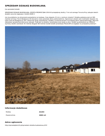 SPRZEDAM DZIAŁKĘ BUDOWLANĄ [na sprzedaż] działki SPRZEDAM DZIAŁKĘ BUDOWLANĄ -OFERTA PROMOCYJNA 2016 W przepięknej okolicy 7 km od samego Torunia.Przy zakupie dwóch działek cena do negocjacji. KLASA ZIEMI V nie ma problemu na otrzymanie pozwolenia na budowę. Czas dojazdu 15 min z centrum miasta!!! Działka położona jest ok 300 metrów od trasy Toruń-Bydgoszcz.W otoczeniu nowo powstałe domy jednorodzinne. Ogromnym atutem jest możliwość dojazdu nie tylko trasą do Bydgoszczy ale i okolicznej drogi utwardzonej. Działka z przeznaczeniem na budowę domu jednorodzinnego. Warunki zabudowy uprawomocnione przy zakupie. Prąd jest na działce, kanalizacja oraz woda w ulicy. Działki są podzielone po 3000m2 wymiary działki szerokość 45 metrów długość 68 metrów kształt działki prostokąta POLECAM ze względu na przepiękną okolicę!!. Informacje dodatkowe Rodzaj działki Powierzchnia 3000 m2 Adres ogłoszenia http://sprzedajdom24.pl/sprzedam-dzialke-budowlana,o153 Kontakt Mail: prywatna osoba Telefon: 787 889 579 Lokalizacja , Górsk Kujawsko-pomorskie (pl) Ogłoszenie dodano: 2017-01-06 23:58:08 Ogłoszenie wygasa: 2017-02-06 23:58:08 Powered by TCPDF (www.tcpdf.org)