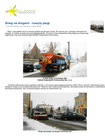 Śnieg na drogach - ruszyły pługi , 17/01/2012 09:28, autor: Rzecznik - Łukasz Masyk Wraz z początkiem ferii za oknami pojawił się pierwszy śnieg. W minioną noc z powodu intensywnych opadów, w miasto musiały wyruszyć pługopiaskarki. W sumie o stan bielawskich dróg dbają trzy duże pługi ciągnikowe oraz dwa średnie pługi Zakładu Gospodarki Komunalnej. O stan dróg i chodników dba Zakład Gospodarki Komunalnej Sp. z o.o. Chodniki odśnieżają cztery specjalne traktorki, a ich pracę wspomagają pracownicy ZGK, którzy "ręcznie" odśnieżają trudno dostępne miejsca oraz przejścia dla pieszych. Obecnie całe miasto jest przejezdne, ale bardzo prosimy kierowców o prawidłowe parkowanie pojazdów, aby umożliwić pługom skuteczne odśnieżanie ulic. Pługi wyruszyły na drogi w minioną noc Uwagi odnośnie odśnieżania dróg i chodników można zgłaszać w Urzędzie Miejskim (tel. 74 8328 757 lub 721), Straży Miejskiej (74 8328 706 lub 669 102 102) oraz bezpośrednio w bielawskim Zakładzie Gospodarki Komunalnej (74 8334 931). © 2010 Gmina Bielawa. Wszelkie prawa zastrzeżone. All rights reserved. Projekt: XOOOM