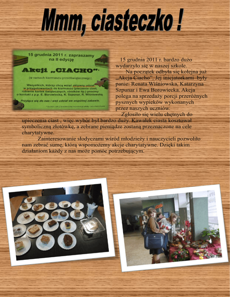15 grudnia 2011 r. bardzo dużo wydarzyło się w naszej szkole. Na początek odbyła się kolejna już „Akcja Ciacho”. Jej inicjatorkami były panie: Renata Wiśniowska, Katarzyna Szpunar i Ewa Borowiecka. Akcja polega na sprzedaży porcji przeróżnych pysznych wypieków wykonanych przez naszych uczniów. Zgłosiło się wielu chętnych do upieczenia ciast , więc wybór był bardzo duży. Kawałek ciasta kosztował symboliczną złotówkę, a zebrane pieniądze zostaną przeznaczone na cele charytatywne. Zainteresowanie słodyczami wśród młodzieży i nauczycieli pozwoliło nam zebrać sumę, którą wspomożemy akcje charytatywne. Dzięki takim działaniom każdy z nas może pomóc potrzebującym. Tuż obok odbywał się kiermasz stroików świątecznych. Zostały one wymyślone i wykonane przez uczniów na praktykach w Centrum Kształcenia Praktycznego. Nauczyciele chętnie kupowali ozdoby, a pierwszym kupcem był oczywiście Pan Dyrektor , który zakupił śliczną choinkę. Wystawa i kiermasz zostały zorganizowane dzięki wsparciu pani Karoliny Chmurskiej. Kizia