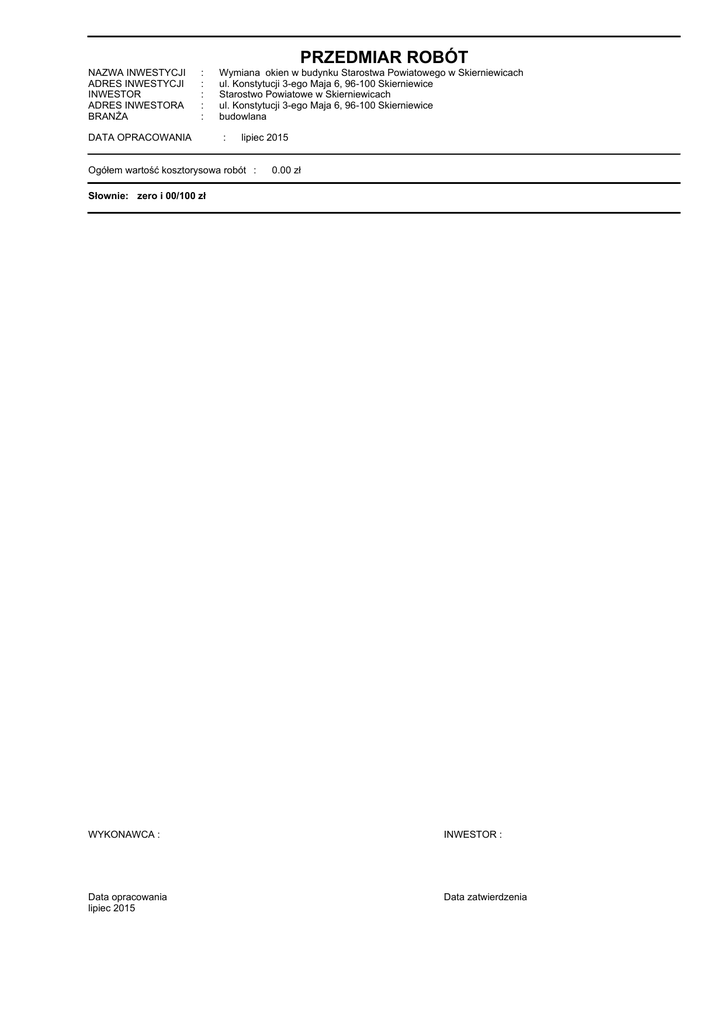 PRZEDMIAR ROBÓT NAZWA INWESTYCJI ADRES INWESTYCJI INWESTOR ADRES INWESTORA BRANŻA : : : : : DATA OPRACOWANIA Wymiana okien w budynku Starostwa Powiatowego w Skierniewicach ul. Konstytucji 3-ego Maja 6, 96-100 Skierniewice Starostwo Powiatowe w Skierniewicach ul. Konstytucji 3-ego Maja 6, 96-100 Skierniewice budowlana : lipiec 2015 Ogółem wartość kosztorysowa robót : 0.00 zł Słownie: zero i 00/100 zł WYKONAWCA : INWESTOR : Data opracowania lipiec 2015 Data zatwierdzenia PRZEDMIAR ROBÓT Lp. 1 1.1 1 d.1. 1 Podst Opis i wyliczenia Wymiana okien 13szt Wymiana stolarki okiennnej Przygotowanie miejsca pracy (wyniesienie mebli biurowych, zabezpieczenie analiza in- podłogi folią) dywidualna 1 2 KNR 0-19 d.1. 0930-11 1 analogia 3 KNR 4-01 d.1. 1209-04 1 analogia 1.2 4 d.1. 2 6 KNR 4-04 d.1. 0506-04 2 analogia 7 KNR 2-02 d.1. 0506-01 2 analogia 1.3 8 d.1. 3 Poszcz kpl kpl 31.28 m2 Imprenacja i malowanie pozostałej częsci futryny drewnianej szt. 13 szt. 1.000 RAZEM 1.000 31.280 RAZEM 31.280 13.000 RAZEM 13.000 10.140 RAZEM 10.140 10.140 RAZEM 10.140 4.980 RAZEM 4.980 4.980 RAZEM 4.980 30.790 RAZEM 30.790 30.790 RAZEM 30.790 19.000 RAZEM 19.000 m2 m2 Przyklejenie pod parapet wewnętrzny w-wy izolacyjnej tzw "ekran grzejnikowy" m2 10.14 m2 Demontaż parapetów zewnętrznych m2 4.98 m2 Parapety zewnetrzne z blachy tytanowo - cynowej m2 4.98 m2 Obróbka ościezy Obróbka wewnętrznych glifów płytą gipsową KNNR 2 1703-02 analogia m2 m2 30.79 m2 9 NNRNKB (z.III) malowanie glifów wewnętrznych d.1. 202 1521-04 3 analogia m2 30.79 10 KNR-W 2-02 Obróbka glifów zewnętrznych zaprawą cementową d.1. 0903-03 3 19 m2 11 KNR-W 2-02 Malowanie glifów zewnętrznych d.1. 1510-10 3 19 m2 m2 m2 19.000 RAZEM 2 2.1 12 d.2. 1 Wymiana okien 10szt Wymiana stolarki okiennnej Przygotowanie miejsca pracy (wyniesienie mebli biurowych, zabezpieczenie analiza in- podłogi folią) dywidualna 1 13 KNR 0-19 d.2. 0930-11 1 analogia Razem Demontaż istniejących okien drewnianych wraz częsciowym wycięciem części m2 futry drewnianej (dłutowanie), montaż nowego okna drewnianego Wymiana parapetów Wykucie z muru i wstawienie parapetrów drewnianych KNNR 3 0701-04 analogia 10.14 5 KNR 4-01 d.1. 0604-05 2 analogia j.m. kpl kpl Demontaż istniejących okien drewnianych wraz częsciowym wycięciem części m2 futry drewnianej (dłutowanie), montaż nowego okna drewnianego łukowego -2- Norma PRO Wersja 4.01, Marzec 2003 r. 19.000 1.000 RAZEM 1.000 PRZEDMIAR ROBÓT Lp. Podst 14 KNR 4-01 d.2. 1209-04 1 analogia 2.2 15 d.2. 2 Opis i wyliczenia j.m. m2 Imprenacja i malowanie pozostałej częsci futryny drewnianej szt. 10 szt. Wymiana parapetów Wykucie z muru i wstawienie parapetrów drewnianych KNNR 3 0701-04 analogia 13.9 16 KNR 4-01 d.2. 0604-05 2 analogia 17 KNR 4-04 d.2. 0506-04 2 analogia 18 KNR 2-02 d.2. 0506-01 2 analogia 2.3 19 d.2. 3 40.55 Poszcz 40.550 RAZEM Razem 40.550 10.000 RAZEM 10.000 13.900 RAZEM 13.900 13.900 RAZEM 13.900 5.220 RAZEM 5.220 5.220 RAZEM 5.220 39.700 RAZEM 39.700 39.700 RAZEM 39.700 18.570 RAZEM 18.570 m2 m2 Przyklejenie pod parapet wewnętrzny w-wy izolacyjnej tzw "ekran grzejnikowy" m2 13.9 m2 Demontaż parapetów zewnętrznych m2 5.22 m2 Parapety zewnetrzne z blachy tytanowo - cynowej m2 5.22 m2 Obróbka ościezy Obróbka wewnętrznych glifów płytą gipsową KNNR 2 1703-02 analogia m2 m2 39.70 m2 20 NNRNKB (z.III) malowanie glifów wewnętrznych d.2. 202 1521-04 3 analogia m2 39.7 21 KNR-W 2-02 Obróbka glifów zewnętrznych zaprawą cementową d.2. 0903-03 3 18.57 m2 22 KNR-W 2-02 Malowanie glifów zewnętrznych d.2. 1510-10 3 18.57 m2 m2 m2 2.4 Przerobienie i renowacja krat 23 Demontaż kraty okiennej mocowanej na futrynie starego okna, renowacja kraty kpl d.2. analiza in- i jej przerobienie, montaż kraty do ściany 4 dywidualna 10 kpl -3- Norma PRO Wersja 4.01, Marzec 2003 r. 18.570 RAZEM 18.570 10.000 RAZEM 10.000